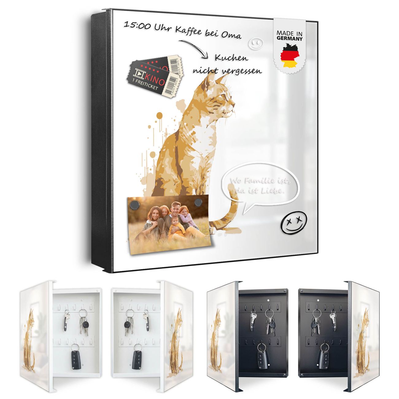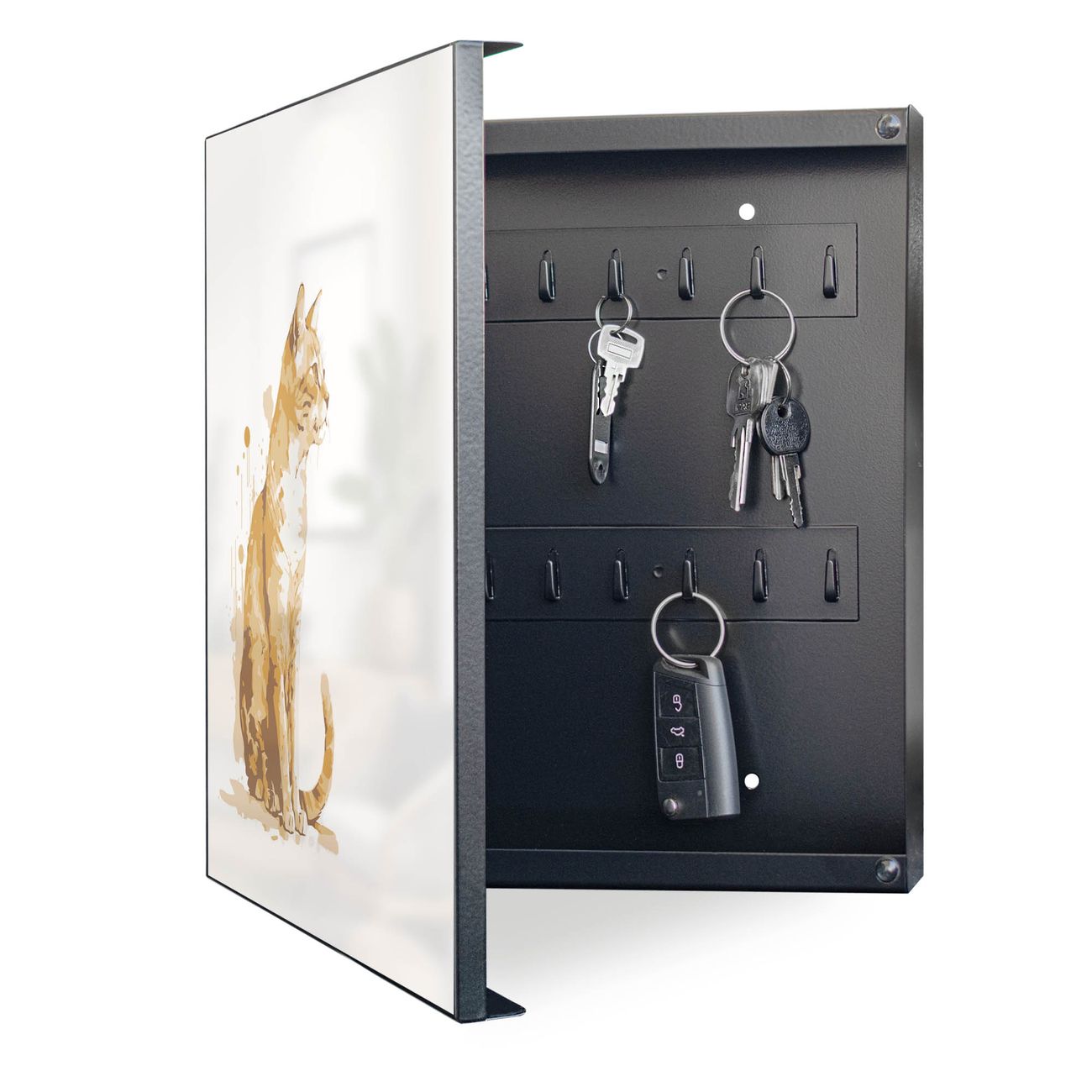 Bringe Ordnung und Eleganz in deinen Eingangsbereich mit dem banjado Schlüsselkasten Motiv Motiv Katzenportrait in Aquarell 5. Die moderne Schlüsselbox kombiniert funktionales Design mit hochwertiger Verarbeitung und wird so zu einem echten Hingucker in Flur, Büro oder Ferienwohnung. ✅ Stilvolle Schlüsselaufbewahrung mit Motiv Motiv Katzenportrait in Aquarell 5 Der Design-Schlüsselkasten Motiv Motiv Katzenportrait in Aquarell 5 bietet Platz für bis zu 32 Schlüssel, die auf 4 stabilen Reihen mit je 8 Haken übersichtlich verstaut werden. Mit seinen kompakten Maßen von 30 x 30 x 5 cm passt die Schlüsselbox perfekt auch in kleinere Räume. Der schwarz lackierte Stahlkorpus mit links angeschlagenem Türscharnier harmoniert mit gedruckten Folie auf der Front und fügt sich nahtlos in jedes Wohnambiente ein. Ob als Schlüsselorganizer für Zuhause oder als praktische Lösung für Büros, Praxen und Gewerbe, der banjado Schlüsselkasten sorgt für Ordnung und Übersicht. Dank der magnetischen, mit Kreidestiften beschreibbaren Folie auf der Front kannst du Notizen anheften oder Termine direkt auf der Oberfläche festhalten. Die Schlüsselbox Motiv Motiv Katzenportrait in Aquarell 5 zur Wandmontage wird inklusive Befestigungsmaterial geliefert und ist schnell angebracht. So hast du deine Schlüssel jederzeit griffbereit und zugleich stilvoll verstaut. Mit diesem banjado Schlüsselkasten Motiv Motiv Katzenportrait in Aquarell 5 kombinierst du praktische Aufbewahrung mit stilvollem Wohndesign. Ob privat oder geschäftlich, die Schlüsselbox sorgt für mehr Ordnung, Übersicht und ein wohnliches Ambiente.Vorteile im Überblick