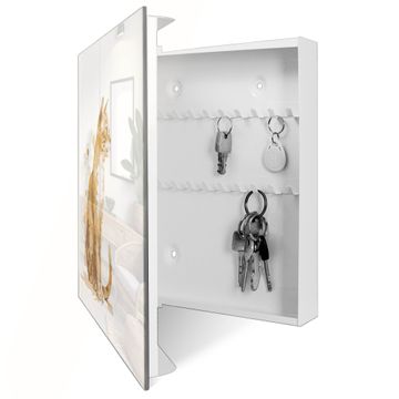 Bringe Ordnung und Eleganz in deinen Eingangsbereich mit dem banjado Schlüsselkasten Motiv Motiv Aquarellkatze 3. Die moderne Schlüsselbox kombiniert funktionales Design mit hochwertiger Verarbeitung und wird so zu einem echten Hingucker in Flur, Büro oder Ferienwohnung. ✅ Stilvolle Schlüsselaufbewahrung mit Glasfront im Motiv Motiv Aquarellkatze 3 Der Design-Schlüsselkasten Motiv Motiv Aquarellkatze 3 bietet Platz für bis zu 50 Schlüssel, die auf 5 stabilen Reihen mit je 10 Haken übersichtlich verstaut werden. Mit seinen kompakten Maßen von 30 x 30 x 5 cm passt die Schlüsselbox perfekt auch in kleinere Räume. Der weiß lackierte Stahlkorpus mit rechts angeschlagenem Türscharnier harmoniert mit der Glasfront und fügt sich nahtlos in jedes Wohnambiente ein. Ob als Schlüsselorganizer für Zuhause oder als praktische Lösung für Büros, Praxen und Gewerbe, der banjado Schlüsselkasten sorgt für Ordnung und Übersicht. Dank der magnetischen, mit Kreidestiften beschreibbaren Glasfront kannst du Notizen anheften oder Termine direkt auf der Oberfläche festhalten. Die Schlüsselbox Motiv Motiv Aquarellkatze 3 zur Wandmontage wird inklusive Befestigungsmaterial geliefert und ist schnell angebracht. So hast du deine Schlüssel jederzeit griffbereit und zugleich stilvoll verstaut. Mit diesem banjado Schlüsselkasten Motiv Motiv Aquarellkatze 3 kombinierst du praktische Aufbewahrung mit stilvollem Wohndesign. Ob privat oder geschäftlich, die Schlüsselbox sorgt für mehr Ordnung, Übersicht und ein wohnliches Ambiente.Vorteile im Überblick