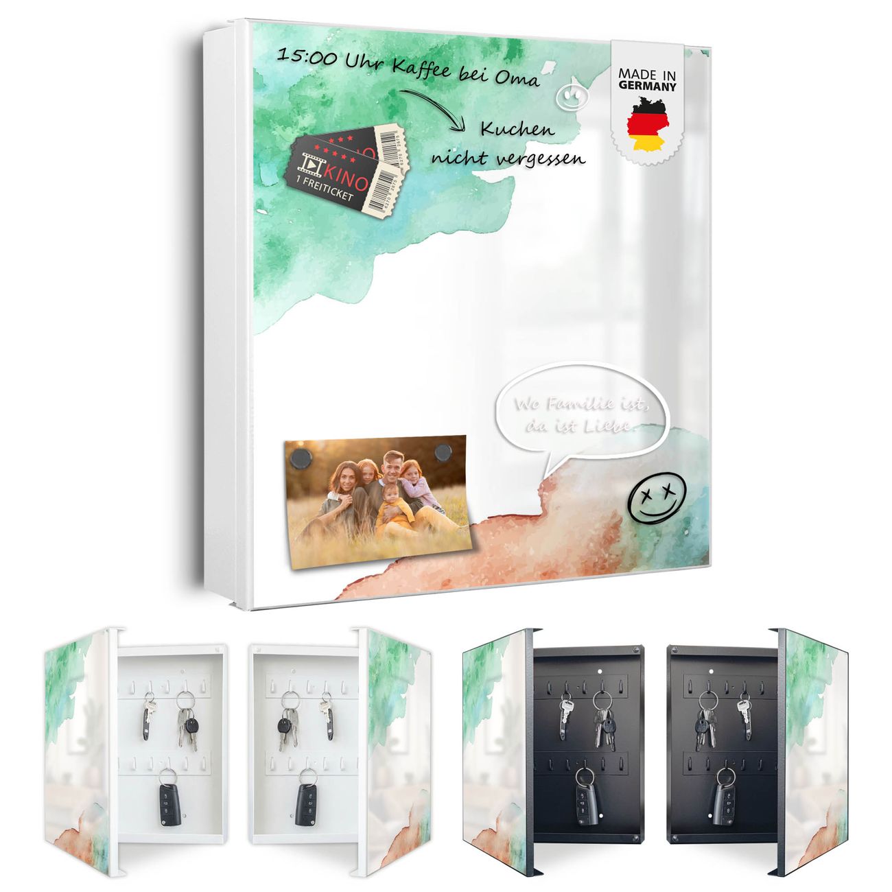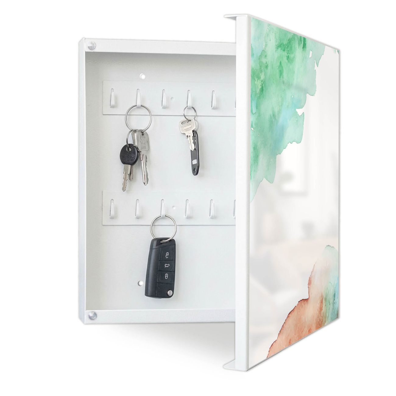 Bringe Ordnung und Eleganz in deinen Eingangsbereich mit dem banjado Schlüsselkasten Motiv Motiv Aquarellzauber. Die moderne Schlüsselbox kombiniert funktionales Design mit hochwertiger Verarbeitung und wird so zu einem echten Hingucker in Flur, Büro oder Ferienwohnung. ✅ Stilvolle Schlüsselaufbewahrung mit Motiv Motiv Aquarellzauber Der Design-Schlüsselkasten Motiv Motiv Aquarellzauber bietet Platz für bis zu 32 Schlüssel, die auf 4 stabilen Reihen mit je 8 Haken übersichtlich verstaut werden. Mit seinen kompakten Maßen von 30 x 30 x 5 cm passt die Schlüsselbox perfekt auch in kleinere Räume. Der weiß lackierte Stahlkorpus mit rechts angeschlagenem Türscharnier harmoniert mit gedruckten Folie auf der Front und fügt sich nahtlos in jedes Wohnambiente ein. Ob als Schlüsselorganizer für Zuhause oder als praktische Lösung für Büros, Praxen und Gewerbe, der banjado Schlüsselkasten sorgt für Ordnung und Übersicht. Dank der magnetischen, mit Kreidestiften beschreibbaren Folie auf der Front kannst du Notizen anheften oder Termine direkt auf der Oberfläche festhalten. Die Schlüsselbox Motiv Motiv Aquarellzauber zur Wandmontage wird inklusive Befestigungsmaterial geliefert und ist schnell angebracht. So hast du deine Schlüssel jederzeit griffbereit und zugleich stilvoll verstaut. Mit diesem banjado Schlüsselkasten Motiv Motiv Aquarellzauber kombinierst du praktische Aufbewahrung mit stilvollem Wohndesign. Ob privat oder geschäftlich, die Schlüsselbox sorgt für mehr Ordnung, Übersicht und ein wohnliches Ambiente.Vorteile im Überblick