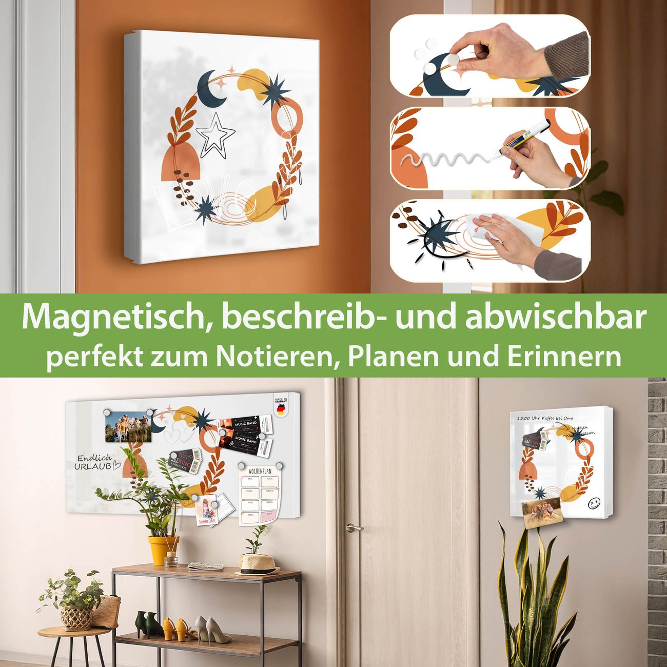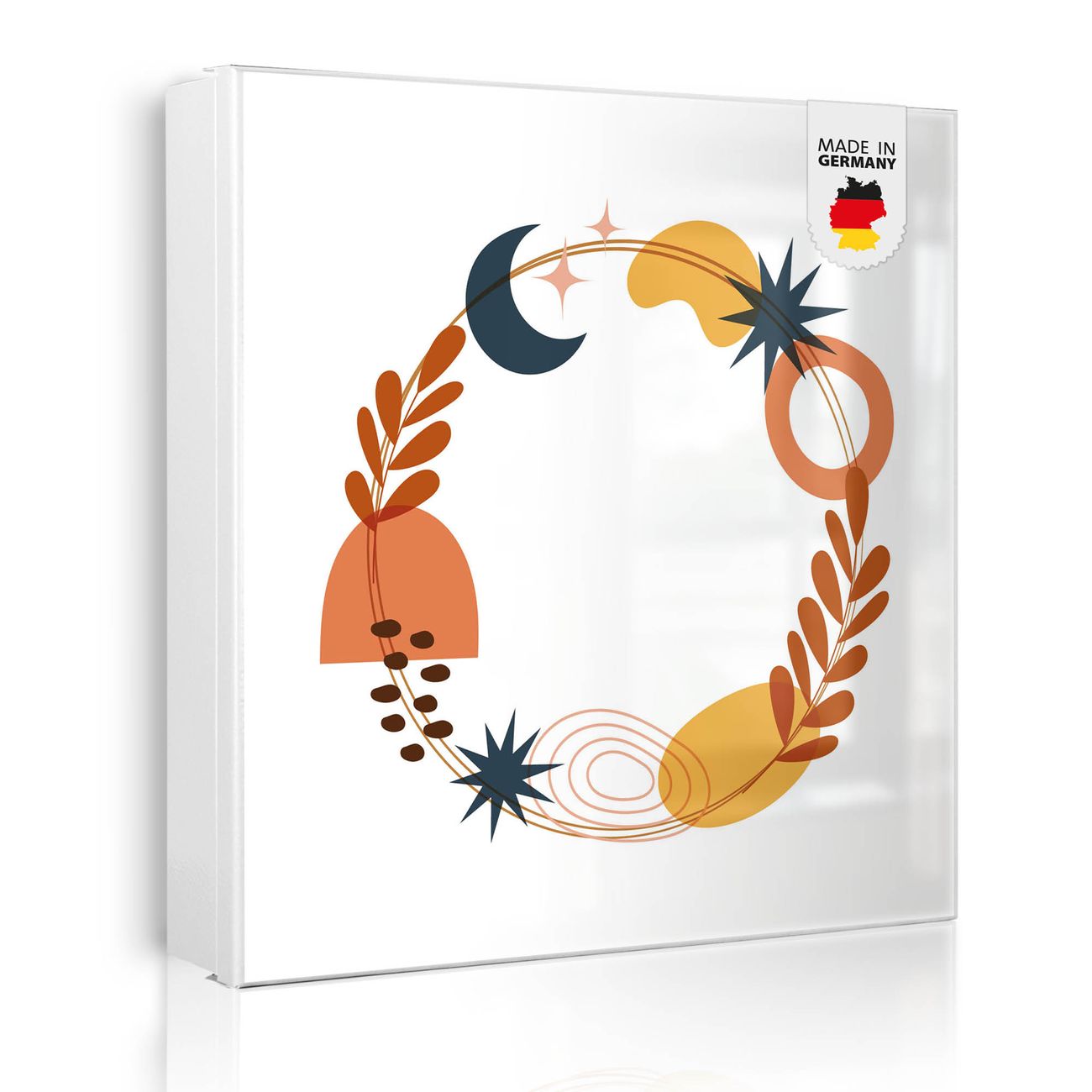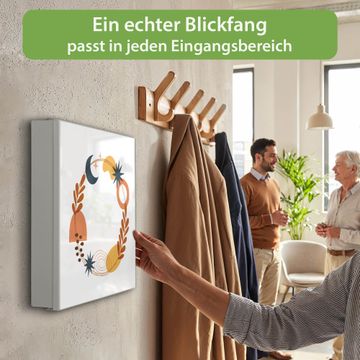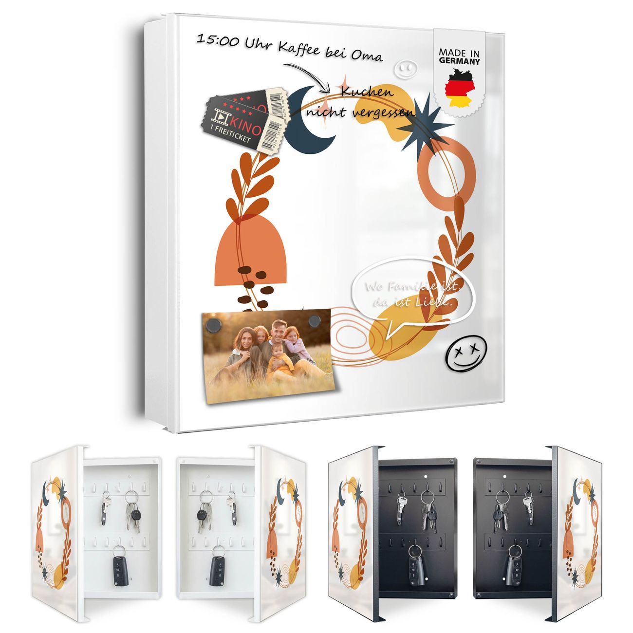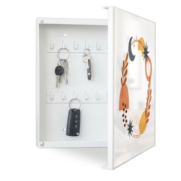 Bringe Ordnung und Eleganz in deinen Eingangsbereich mit dem banjado Schlüsselkasten Motiv Motiv Astro-Herbstkranz. Die moderne Schlüsselbox kombiniert funktionales Design mit hochwertiger Verarbeitung und wird so zu einem echten Hingucker in Flur, Büro oder Ferienwohnung. ✅ Stilvolle Schlüsselaufbewahrung mit Motiv Motiv Astro-Herbstkranz Der Design-Schlüsselkasten Motiv Motiv Astro-Herbstkranz bietet Platz für bis zu 32 Schlüssel, die auf 4 stabilen Reihen mit je 8 Haken übersichtlich verstaut werden. Mit seinen kompakten Maßen von 30 x 30 x 5 cm passt die Schlüsselbox perfekt auch in kleinere Räume. Der weiß lackierte Stahlkorpus mit rechts angeschlagenem Türscharnier harmoniert mit gedruckten Folie auf der Front und fügt sich nahtlos in jedes Wohnambiente ein. Ob als Schlüsselorganizer für Zuhause oder als praktische Lösung für Büros, Praxen und Gewerbe, der banjado Schlüsselkasten sorgt für Ordnung und Übersicht. Dank der magnetischen, mit Kreidestiften beschreibbaren Folie auf der Front kannst du Notizen anheften oder Termine direkt auf der Oberfläche festhalten. Die Schlüsselbox Motiv Motiv Astro-Herbstkranz zur Wandmontage wird inklusive Befestigungsmaterial geliefert und ist schnell angebracht. So hast du deine Schlüssel jederzeit griffbereit und zugleich stilvoll verstaut. Mit diesem banjado Schlüsselkasten Motiv Motiv Astro-Herbstkranz kombinierst du praktische Aufbewahrung mit stilvollem Wohndesign. Ob privat oder geschäftlich, die Schlüsselbox sorgt für mehr Ordnung, Übersicht und ein wohnliches Ambiente.Vorteile im Überblick