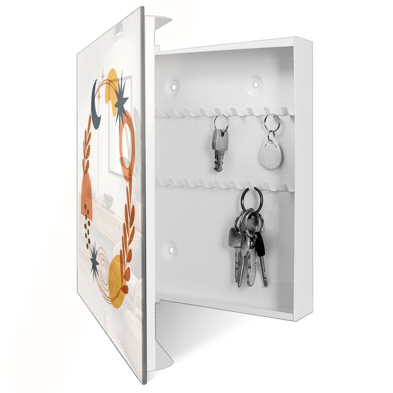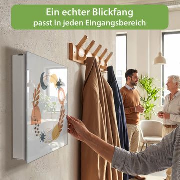 Bringe Ordnung und Eleganz in deinen Eingangsbereich mit dem banjado Schlüsselkasten Motiv Motiv Astro-Herbstkranz. Die moderne Schlüsselbox kombiniert funktionales Design mit hochwertiger Verarbeitung und wird so zu einem echten Hingucker in Flur, Büro oder Ferienwohnung. ✅ Stilvolle Schlüsselaufbewahrung mit Glasfront im Motiv Motiv Astro-Herbstkranz Der Design-Schlüsselkasten Motiv Motiv Astro-Herbstkranz bietet Platz für bis zu 50 Schlüssel, die auf 5 stabilen Reihen mit je 10 Haken übersichtlich verstaut werden. Mit seinen kompakten Maßen von 30 x 30 x 5 cm passt die Schlüsselbox perfekt auch in kleinere Räume. Der weiß lackierte Stahlkorpus mit rechts angeschlagenem Türscharnier harmoniert mit der Glasfront und fügt sich nahtlos in jedes Wohnambiente ein. Ob als Schlüsselorganizer für Zuhause oder als praktische Lösung für Büros, Praxen und Gewerbe, der banjado Schlüsselkasten sorgt für Ordnung und Übersicht. Dank der magnetischen, mit Kreidestiften beschreibbaren Glasfront kannst du Notizen anheften oder Termine direkt auf der Oberfläche festhalten. Die Schlüsselbox Motiv Motiv Astro-Herbstkranz zur Wandmontage wird inklusive Befestigungsmaterial geliefert und ist schnell angebracht. So hast du deine Schlüssel jederzeit griffbereit und zugleich stilvoll verstaut. Mit diesem banjado Schlüsselkasten Motiv Motiv Astro-Herbstkranz kombinierst du praktische Aufbewahrung mit stilvollem Wohndesign. Ob privat oder geschäftlich, die Schlüsselbox sorgt für mehr Ordnung, Übersicht und ein wohnliches Ambiente.Vorteile im Überblick
