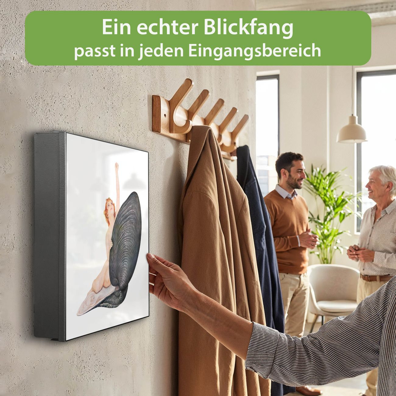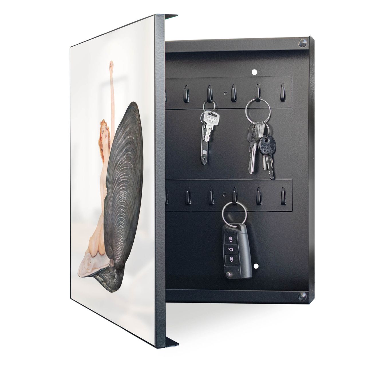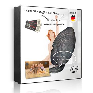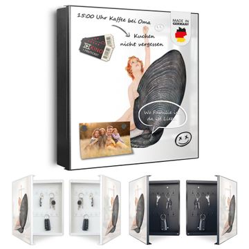Bringe Ordnung und Eleganz in deinen Eingangsbereich mit dem banjado Schlüsselkasten Motiv Motiv Aufbruch aus der Muschel Vintage. Die moderne Schlüsselbox kombiniert funktionales Design mit hochwertiger Verarbeitung und wird so zu einem echten Hingucker in Flur, Büro oder Ferienwohnung. ✅ Stilvolle Schlüsselaufbewahrung mit Motiv Motiv Aufbruch aus der Muschel Vintage Der Design-Schlüsselkasten Motiv Motiv Aufbruch aus der Muschel Vintage bietet Platz für bis zu 32 Schlüssel, die auf 4 stabilen Reihen mit je 8 Haken übersichtlich verstaut werden. Mit seinen kompakten Maßen von 30 x 30 x 5 cm passt die Schlüsselbox perfekt auch in kleinere Räume. Der schwarz lackierte Stahlkorpus mit links angeschlagenem Türscharnier harmoniert mit gedruckten Folie auf der Front und fügt sich nahtlos in jedes Wohnambiente ein. Ob als Schlüsselorganizer für Zuhause oder als praktische Lösung für Büros, Praxen und Gewerbe, der banjado Schlüsselkasten sorgt für Ordnung und Übersicht. Dank der magnetischen, mit Kreidestiften beschreibbaren Folie auf der Front kannst du Notizen anheften oder Termine direkt auf der Oberfläche festhalten. Die Schlüsselbox Motiv Motiv Aufbruch aus der Muschel Vintage zur Wandmontage wird inklusive Befestigungsmaterial geliefert und ist schnell angebracht. So hast du deine Schlüssel jederzeit griffbereit und zugleich stilvoll verstaut. Mit diesem banjado Schlüsselkasten Motiv Motiv Aufbruch aus der Muschel Vintage kombinierst du praktische Aufbewahrung mit stilvollem Wohndesign. Ob privat oder geschäftlich, die Schlüsselbox sorgt für mehr Ordnung, Übersicht und ein wohnliches Ambiente.Vorteile im Überblick