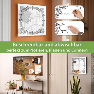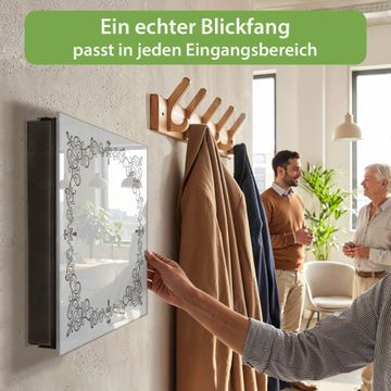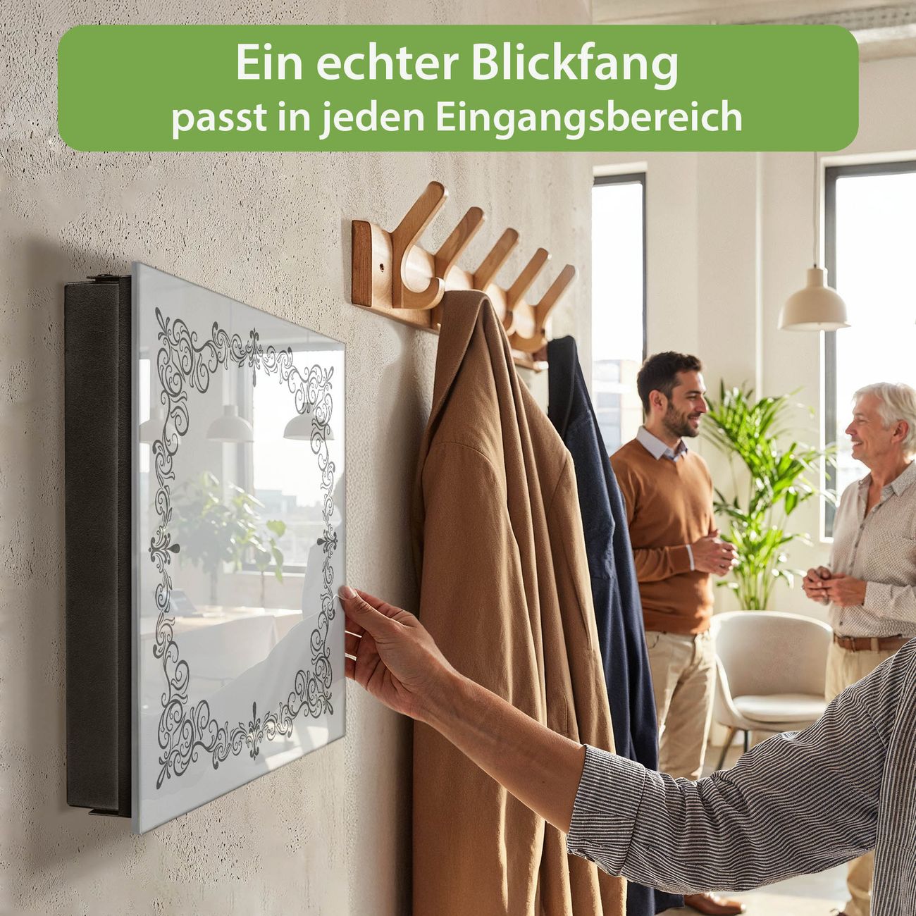 Bringe Ordnung und Eleganz in deinen Eingangsbereich mit dem banjado Schlüsselkasten Motiv Motiv Barockrahmen. Die moderne Schlüsselbox kombiniert funktionales Design mit hochwertiger Verarbeitung und wird so zu einem echten Hingucker in Flur, Büro oder Ferienwohnung. ✅ Stilvolle Schlüsselaufbewahrung mit Glasfront im Motiv Motiv Barockrahmen Der Design-Schlüsselkasten Motiv Motiv Barockrahmen bietet Platz für bis zu 50 Schlüssel, die auf 5 stabilen Reihen mit je 10 Haken übersichtlich verstaut werden. Mit seinen kompakten Maßen von 30 x 30 x 5 cm passt die Schlüsselbox perfekt auch in kleinere Räume. Der schwarz lackierte Stahlkorpus mit rechts angeschlagenem Türscharnier harmoniert mit der Glasfront und fügt sich nahtlos in jedes Wohnambiente ein. Ob als Schlüsselorganizer für Zuhause oder als praktische Lösung für Büros, Praxen und Gewerbe, der banjado Schlüsselkasten sorgt für Ordnung und Übersicht. Dank der magnetischen, mit Kreidestiften beschreibbaren Glasfront kannst du Notizen anheften oder Termine direkt auf der Oberfläche festhalten. Die Schlüsselbox Motiv Motiv Barockrahmen zur Wandmontage wird inklusive Befestigungsmaterial geliefert und ist schnell angebracht. So hast du deine Schlüssel jederzeit griffbereit und zugleich stilvoll verstaut. Mit diesem banjado Schlüsselkasten Motiv Motiv Barockrahmen kombinierst du praktische Aufbewahrung mit stilvollem Wohndesign. Ob privat oder geschäftlich, die Schlüsselbox sorgt für mehr Ordnung, Übersicht und ein wohnliches Ambiente.Vorteile im Überblick