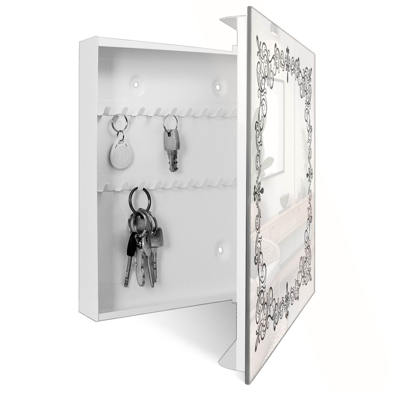 Bringe Ordnung und Eleganz in deinen Eingangsbereich mit dem banjado Schlüsselkasten Motiv Motiv Barockrahmen. Die moderne Schlüsselbox kombiniert funktionales Design mit hochwertiger Verarbeitung und wird so zu einem echten Hingucker in Flur, Büro oder Ferienwohnung. ✅ Stilvolle Schlüsselaufbewahrung mit Glasfront im Motiv Motiv Barockrahmen Der Design-Schlüsselkasten Motiv Motiv Barockrahmen bietet Platz für bis zu 50 Schlüssel, die auf 5 stabilen Reihen mit je 10 Haken übersichtlich verstaut werden. Mit seinen kompakten Maßen von 30 x 30 x 5 cm passt die Schlüsselbox perfekt auch in kleinere Räume. Der weiß lackierte Stahlkorpus mit rechts angeschlagenem Türscharnier harmoniert mit der Glasfront und fügt sich nahtlos in jedes Wohnambiente ein. Ob als Schlüsselorganizer für Zuhause oder als praktische Lösung für Büros, Praxen und Gewerbe, der banjado Schlüsselkasten sorgt für Ordnung und Übersicht. Dank der magnetischen, mit Kreidestiften beschreibbaren Glasfront kannst du Notizen anheften oder Termine direkt auf der Oberfläche festhalten. Die Schlüsselbox Motiv Motiv Barockrahmen zur Wandmontage wird inklusive Befestigungsmaterial geliefert und ist schnell angebracht. So hast du deine Schlüssel jederzeit griffbereit und zugleich stilvoll verstaut. Mit diesem banjado Schlüsselkasten Motiv Motiv Barockrahmen kombinierst du praktische Aufbewahrung mit stilvollem Wohndesign. Ob privat oder geschäftlich, die Schlüsselbox sorgt für mehr Ordnung, Übersicht und ein wohnliches Ambiente.Vorteile im Überblick