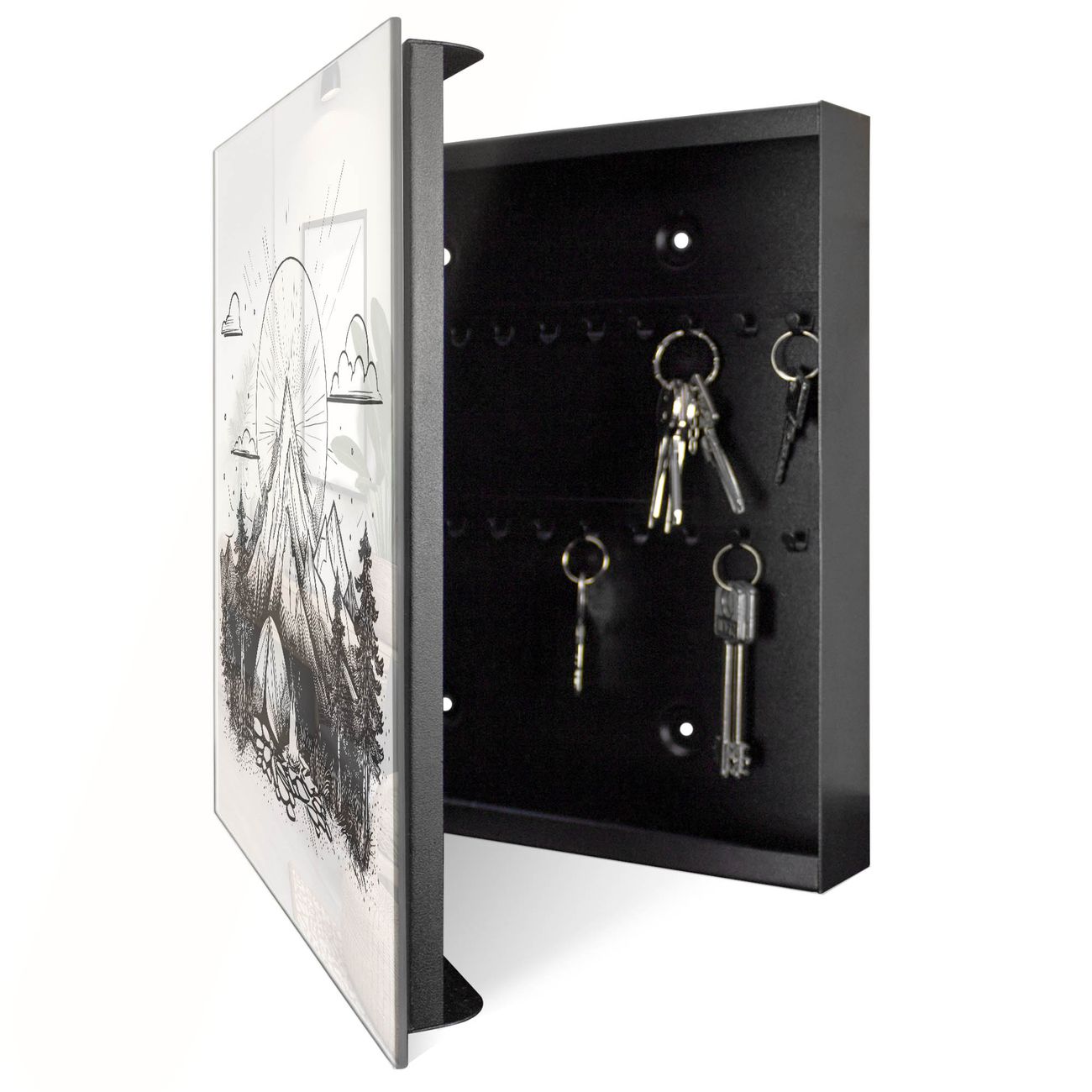 Bringe Ordnung und Eleganz in deinen Eingangsbereich mit dem banjado Schlüsselkasten Motiv Motiv Bergcamping Abenteuer 2. Die moderne Schlüsselbox kombiniert funktionales Design mit hochwertiger Verarbeitung und wird so zu einem echten Hingucker in Flur, Büro oder Ferienwohnung. ✅ Stilvolle Schlüsselaufbewahrung mit Glasfront im Motiv Motiv Bergcamping Abenteuer 2 Der Design-Schlüsselkasten Motiv Motiv Bergcamping Abenteuer 2 bietet Platz für bis zu 50 Schlüssel, die auf 5 stabilen Reihen mit je 10 Haken übersichtlich verstaut werden. Mit seinen kompakten Maßen von 30 x 30 x 5 cm passt die Schlüsselbox perfekt auch in kleinere Räume. Der schwarz lackierte Stahlkorpus mit rechts angeschlagenem Türscharnier harmoniert mit der Glasfront und fügt sich nahtlos in jedes Wohnambiente ein. Ob als Schlüsselorganizer für Zuhause oder als praktische Lösung für Büros, Praxen und Gewerbe, der banjado Schlüsselkasten sorgt für Ordnung und Übersicht. Dank der magnetischen, mit Kreidestiften beschreibbaren Glasfront kannst du Notizen anheften oder Termine direkt auf der Oberfläche festhalten. Die Schlüsselbox Motiv Motiv Bergcamping Abenteuer 2 zur Wandmontage wird inklusive Befestigungsmaterial geliefert und ist schnell angebracht. So hast du deine Schlüssel jederzeit griffbereit und zugleich stilvoll verstaut. Mit diesem banjado Schlüsselkasten Motiv Motiv Bergcamping Abenteuer 2 kombinierst du praktische Aufbewahrung mit stilvollem Wohndesign. Ob privat oder geschäftlich, die Schlüsselbox sorgt für mehr Ordnung, Übersicht und ein wohnliches Ambiente.Vorteile im Überblick
