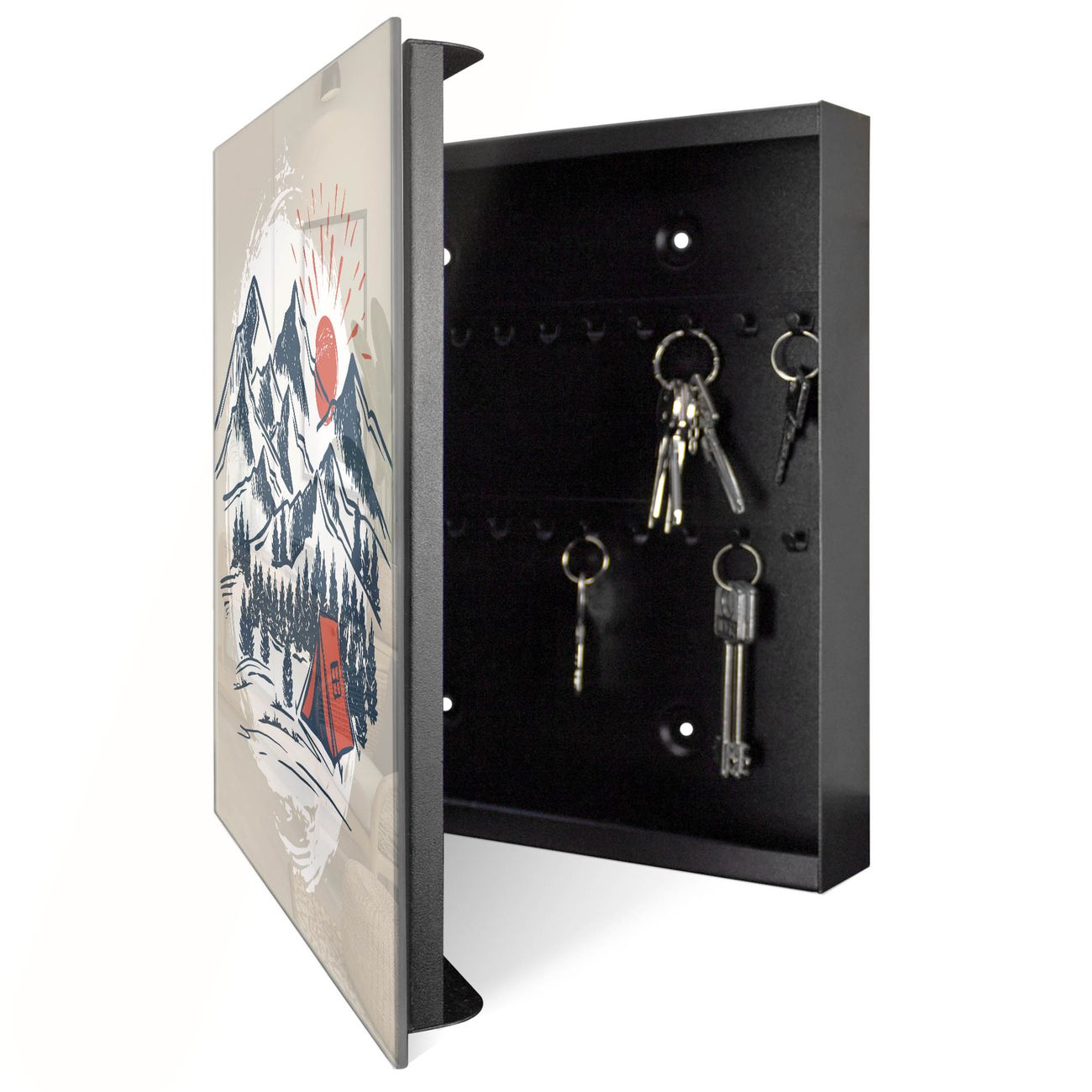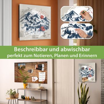 Bringe Ordnung und Eleganz in deinen Eingangsbereich mit dem banjado Schlüsselkasten Motiv Motiv Bergcamping Abenteuer. Die moderne Schlüsselbox kombiniert funktionales Design mit hochwertiger Verarbeitung und wird so zu einem echten Hingucker in Flur, Büro oder Ferienwohnung. ✅ Stilvolle Schlüsselaufbewahrung mit Glasfront im Motiv Motiv Bergcamping Abenteuer Der Design-Schlüsselkasten Motiv Motiv Bergcamping Abenteuer bietet Platz für bis zu 50 Schlüssel, die auf 5 stabilen Reihen mit je 10 Haken übersichtlich verstaut werden. Mit seinen kompakten Maßen von 30 x 30 x 5 cm passt die Schlüsselbox perfekt auch in kleinere Räume. Der schwarz lackierte Stahlkorpus mit rechts angeschlagenem Türscharnier harmoniert mit der Glasfront und fügt sich nahtlos in jedes Wohnambiente ein. Ob als Schlüsselorganizer für Zuhause oder als praktische Lösung für Büros, Praxen und Gewerbe, der banjado Schlüsselkasten sorgt für Ordnung und Übersicht. Dank der magnetischen, mit Kreidestiften beschreibbaren Glasfront kannst du Notizen anheften oder Termine direkt auf der Oberfläche festhalten. Die Schlüsselbox Motiv Motiv Bergcamping Abenteuer zur Wandmontage wird inklusive Befestigungsmaterial geliefert und ist schnell angebracht. So hast du deine Schlüssel jederzeit griffbereit und zugleich stilvoll verstaut. Mit diesem banjado Schlüsselkasten Motiv Motiv Bergcamping Abenteuer kombinierst du praktische Aufbewahrung mit stilvollem Wohndesign. Ob privat oder geschäftlich, die Schlüsselbox sorgt für mehr Ordnung, Übersicht und ein wohnliches Ambiente.Vorteile im Überblick