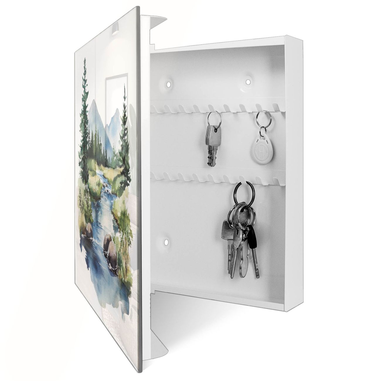Bringe Ordnung und Eleganz in deinen Eingangsbereich mit dem banjado Schlüsselkasten Motiv Motiv Bergfluss in der Natur. Die moderne Schlüsselbox kombiniert funktionales Design mit hochwertiger Verarbeitung und wird so zu einem echten Hingucker in Flur, Büro oder Ferienwohnung. ✅ Stilvolle Schlüsselaufbewahrung mit Glasfront im Motiv Motiv Bergfluss in der Natur Der Design-Schlüsselkasten Motiv Motiv Bergfluss in der Natur bietet Platz für bis zu 50 Schlüssel, die auf 5 stabilen Reihen mit je 10 Haken übersichtlich verstaut werden. Mit seinen kompakten Maßen von 30 x 30 x 5 cm passt die Schlüsselbox perfekt auch in kleinere Räume. Der weiß lackierte Stahlkorpus mit rechts angeschlagenem Türscharnier harmoniert mit der Glasfront und fügt sich nahtlos in jedes Wohnambiente ein. Ob als Schlüsselorganizer für Zuhause oder als praktische Lösung für Büros, Praxen und Gewerbe, der banjado Schlüsselkasten sorgt für Ordnung und Übersicht. Dank der magnetischen, mit Kreidestiften beschreibbaren Glasfront kannst du Notizen anheften oder Termine direkt auf der Oberfläche festhalten. Die Schlüsselbox Motiv Motiv Bergfluss in der Natur zur Wandmontage wird inklusive Befestigungsmaterial geliefert und ist schnell angebracht. So hast du deine Schlüssel jederzeit griffbereit und zugleich stilvoll verstaut. Mit diesem banjado Schlüsselkasten Motiv Motiv Bergfluss in der Natur kombinierst du praktische Aufbewahrung mit stilvollem Wohndesign. Ob privat oder geschäftlich, die Schlüsselbox sorgt für mehr Ordnung, Übersicht und ein wohnliches Ambiente.Vorteile im Überblick