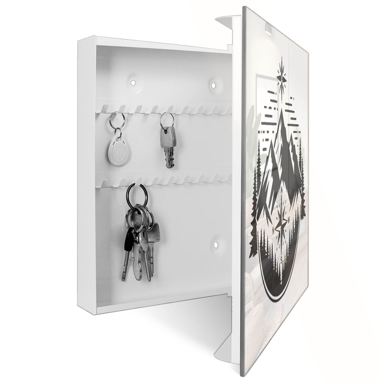 Bringe Ordnung und Eleganz in deinen Eingangsbereich mit dem banjado Schlüsselkasten Motiv Motiv Bergkompass. Die moderne Schlüsselbox kombiniert funktionales Design mit hochwertiger Verarbeitung und wird so zu einem echten Hingucker in Flur, Büro oder Ferienwohnung. ✅ Stilvolle Schlüsselaufbewahrung mit Glasfront im Motiv Motiv Bergkompass Der Design-Schlüsselkasten Motiv Motiv Bergkompass bietet Platz für bis zu 50 Schlüssel, die auf 5 stabilen Reihen mit je 10 Haken übersichtlich verstaut werden. Mit seinen kompakten Maßen von 30 x 30 x 5 cm passt die Schlüsselbox perfekt auch in kleinere Räume. Der weiß lackierte Stahlkorpus mit rechts angeschlagenem Türscharnier harmoniert mit der Glasfront und fügt sich nahtlos in jedes Wohnambiente ein. Ob als Schlüsselorganizer für Zuhause oder als praktische Lösung für Büros, Praxen und Gewerbe, der banjado Schlüsselkasten sorgt für Ordnung und Übersicht. Dank der magnetischen, mit Kreidestiften beschreibbaren Glasfront kannst du Notizen anheften oder Termine direkt auf der Oberfläche festhalten. Die Schlüsselbox Motiv Motiv Bergkompass zur Wandmontage wird inklusive Befestigungsmaterial geliefert und ist schnell angebracht. So hast du deine Schlüssel jederzeit griffbereit und zugleich stilvoll verstaut. Mit diesem banjado Schlüsselkasten Motiv Motiv Bergkompass kombinierst du praktische Aufbewahrung mit stilvollem Wohndesign. Ob privat oder geschäftlich, die Schlüsselbox sorgt für mehr Ordnung, Übersicht und ein wohnliches Ambiente.Vorteile im Überblick