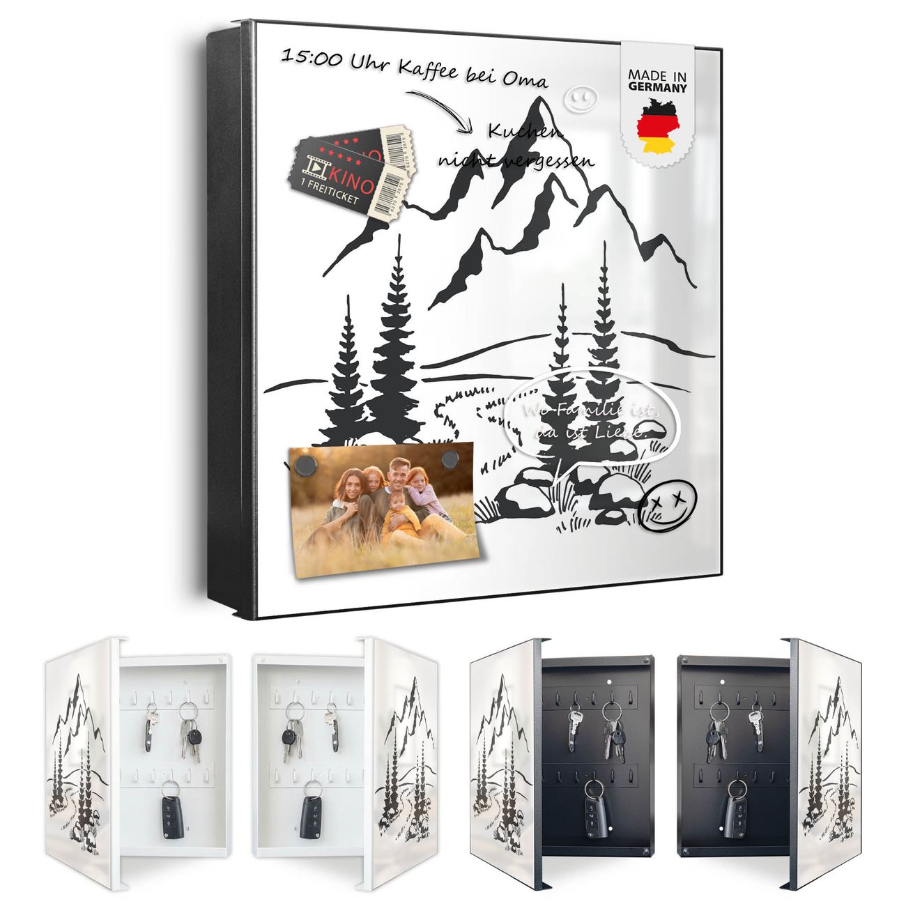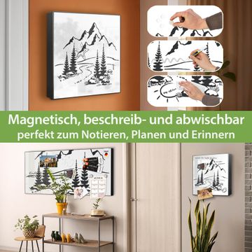 Bringe Ordnung und Eleganz in deinen Eingangsbereich mit dem banjado Schlüsselkasten Motiv Motiv Berglandschaft Zeichnung. Die moderne Schlüsselbox kombiniert funktionales Design mit hochwertiger Verarbeitung und wird so zu einem echten Hingucker in Flur, Büro oder Ferienwohnung. ✅ Stilvolle Schlüsselaufbewahrung mit Motiv Motiv Berglandschaft Zeichnung Der Design-Schlüsselkasten Motiv Motiv Berglandschaft Zeichnung bietet Platz für bis zu 32 Schlüssel, die auf 4 stabilen Reihen mit je 8 Haken übersichtlich verstaut werden. Mit seinen kompakten Maßen von 30 x 30 x 5 cm passt die Schlüsselbox perfekt auch in kleinere Räume. Der schwarz lackierte Stahlkorpus mit rechts angeschlagenem Türscharnier harmoniert mit gedruckten Folie auf der Front und fügt sich nahtlos in jedes Wohnambiente ein. Ob als Schlüsselorganizer für Zuhause oder als praktische Lösung für Büros, Praxen und Gewerbe, der banjado Schlüsselkasten sorgt für Ordnung und Übersicht. Dank der magnetischen, mit Kreidestiften beschreibbaren Folie auf der Front kannst du Notizen anheften oder Termine direkt auf der Oberfläche festhalten. Die Schlüsselbox Motiv Motiv Berglandschaft Zeichnung zur Wandmontage wird inklusive Befestigungsmaterial geliefert und ist schnell angebracht. So hast du deine Schlüssel jederzeit griffbereit und zugleich stilvoll verstaut. Mit diesem banjado Schlüsselkasten Motiv Motiv Berglandschaft Zeichnung kombinierst du praktische Aufbewahrung mit stilvollem Wohndesign. Ob privat oder geschäftlich, die Schlüsselbox sorgt für mehr Ordnung, Übersicht und ein wohnliches Ambiente.Vorteile im Überblick