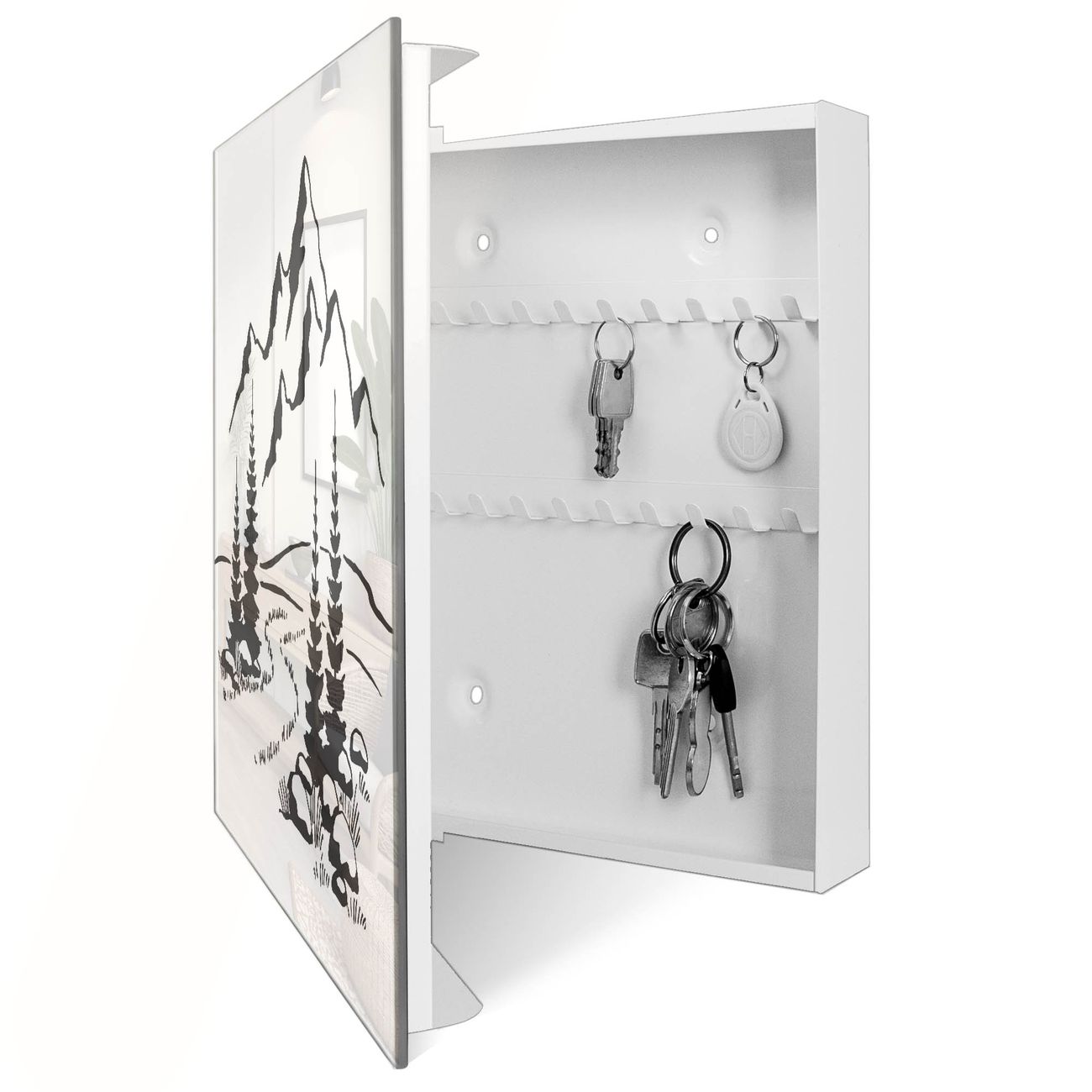 Bringe Ordnung und Eleganz in deinen Eingangsbereich mit dem banjado Schlüsselkasten Motiv Motiv Berglandschaft. Die moderne Schlüsselbox kombiniert funktionales Design mit hochwertiger Verarbeitung und wird so zu einem echten Hingucker in Flur, Büro oder Ferienwohnung. ✅ Stilvolle Schlüsselaufbewahrung mit Glasfront im Motiv Motiv Berglandschaft Der Design-Schlüsselkasten Motiv Motiv Berglandschaft bietet Platz für bis zu 50 Schlüssel, die auf 5 stabilen Reihen mit je 10 Haken übersichtlich verstaut werden. Mit seinen kompakten Maßen von 30 x 30 x 5 cm passt die Schlüsselbox perfekt auch in kleinere Räume. Der weiß lackierte Stahlkorpus mit rechts angeschlagenem Türscharnier harmoniert mit der Glasfront und fügt sich nahtlos in jedes Wohnambiente ein. Ob als Schlüsselorganizer für Zuhause oder als praktische Lösung für Büros, Praxen und Gewerbe, der banjado Schlüsselkasten sorgt für Ordnung und Übersicht. Dank der magnetischen, mit Kreidestiften beschreibbaren Glasfront kannst du Notizen anheften oder Termine direkt auf der Oberfläche festhalten. Die Schlüsselbox Motiv Motiv Berglandschaft zur Wandmontage wird inklusive Befestigungsmaterial geliefert und ist schnell angebracht. So hast du deine Schlüssel jederzeit griffbereit und zugleich stilvoll verstaut. Mit diesem banjado Schlüsselkasten Motiv Motiv Berglandschaft kombinierst du praktische Aufbewahrung mit stilvollem Wohndesign. Ob privat oder geschäftlich, die Schlüsselbox sorgt für mehr Ordnung, Übersicht und ein wohnliches Ambiente.Vorteile im Überblick