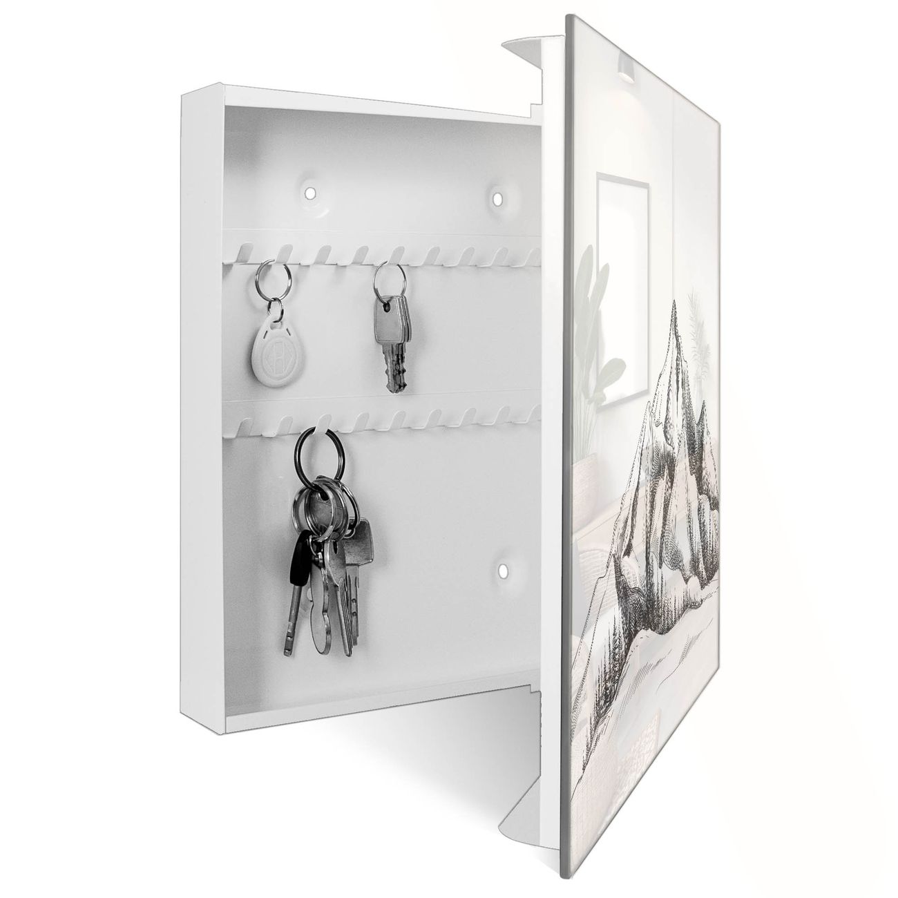 Bringe Ordnung und Eleganz in deinen Eingangsbereich mit dem banjado Schlüsselkasten Motiv Motiv Bergsilhouette. Die moderne Schlüsselbox kombiniert funktionales Design mit hochwertiger Verarbeitung und wird so zu einem echten Hingucker in Flur, Büro oder Ferienwohnung. ✅ Stilvolle Schlüsselaufbewahrung mit Glasfront im Motiv Motiv Bergsilhouette Der Design-Schlüsselkasten Motiv Motiv Bergsilhouette bietet Platz für bis zu 50 Schlüssel, die auf 5 stabilen Reihen mit je 10 Haken übersichtlich verstaut werden. Mit seinen kompakten Maßen von 30 x 30 x 5 cm passt die Schlüsselbox perfekt auch in kleinere Räume. Der weiß lackierte Stahlkorpus mit rechts angeschlagenem Türscharnier harmoniert mit der Glasfront und fügt sich nahtlos in jedes Wohnambiente ein. Ob als Schlüsselorganizer für Zuhause oder als praktische Lösung für Büros, Praxen und Gewerbe, der banjado Schlüsselkasten sorgt für Ordnung und Übersicht. Dank der magnetischen, mit Kreidestiften beschreibbaren Glasfront kannst du Notizen anheften oder Termine direkt auf der Oberfläche festhalten. Die Schlüsselbox Motiv Motiv Bergsilhouette zur Wandmontage wird inklusive Befestigungsmaterial geliefert und ist schnell angebracht. So hast du deine Schlüssel jederzeit griffbereit und zugleich stilvoll verstaut. Mit diesem banjado Schlüsselkasten Motiv Motiv Bergsilhouette kombinierst du praktische Aufbewahrung mit stilvollem Wohndesign. Ob privat oder geschäftlich, die Schlüsselbox sorgt für mehr Ordnung, Übersicht und ein wohnliches Ambiente.Vorteile im Überblick
