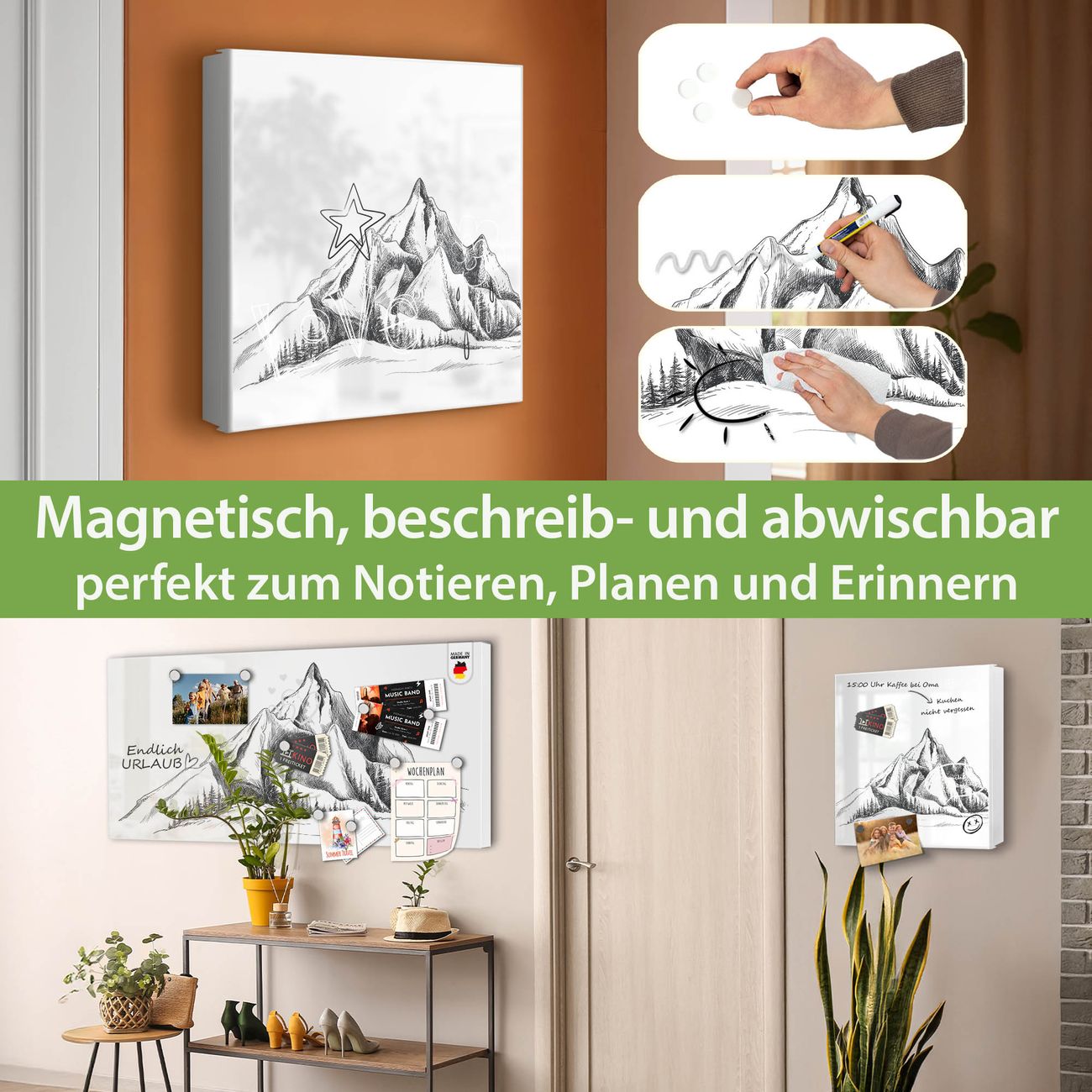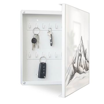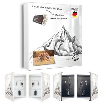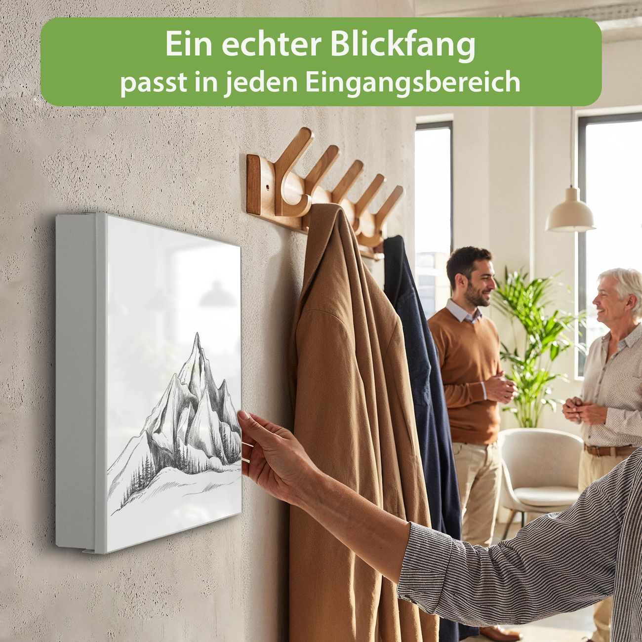 Bringe Ordnung und Eleganz in deinen Eingangsbereich mit dem banjado Schlüsselkasten Motiv Motiv Bergsilhouette. Die moderne Schlüsselbox kombiniert funktionales Design mit hochwertiger Verarbeitung und wird so zu einem echten Hingucker in Flur, Büro oder Ferienwohnung. ✅ Stilvolle Schlüsselaufbewahrung mit Motiv Motiv Bergsilhouette Der Design-Schlüsselkasten Motiv Motiv Bergsilhouette bietet Platz für bis zu 32 Schlüssel, die auf 4 stabilen Reihen mit je 8 Haken übersichtlich verstaut werden. Mit seinen kompakten Maßen von 30 x 30 x 5 cm passt die Schlüsselbox perfekt auch in kleinere Räume. Der weiß lackierte Stahlkorpus mit rechts angeschlagenem Türscharnier harmoniert mit gedruckten Folie auf der Front und fügt sich nahtlos in jedes Wohnambiente ein. Ob als Schlüsselorganizer für Zuhause oder als praktische Lösung für Büros, Praxen und Gewerbe, der banjado Schlüsselkasten sorgt für Ordnung und Übersicht. Dank der magnetischen, mit Kreidestiften beschreibbaren Folie auf der Front kannst du Notizen anheften oder Termine direkt auf der Oberfläche festhalten. Die Schlüsselbox Motiv Motiv Bergsilhouette zur Wandmontage wird inklusive Befestigungsmaterial geliefert und ist schnell angebracht. So hast du deine Schlüssel jederzeit griffbereit und zugleich stilvoll verstaut. Mit diesem banjado Schlüsselkasten Motiv Motiv Bergsilhouette kombinierst du praktische Aufbewahrung mit stilvollem Wohndesign. Ob privat oder geschäftlich, die Schlüsselbox sorgt für mehr Ordnung, Übersicht und ein wohnliches Ambiente.Vorteile im Überblick