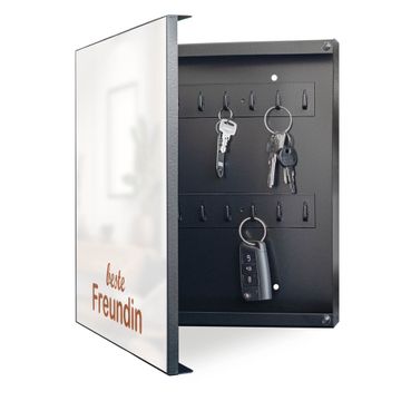 Bringe Ordnung und Eleganz in deinen Eingangsbereich mit dem banjado Schlüsselkasten Motiv Motiv beste Freundin 2. Die moderne Schlüsselbox kombiniert funktionales Design mit hochwertiger Verarbeitung und wird so zu einem echten Hingucker in Flur, Büro oder Ferienwohnung. ✅ Stilvolle Schlüsselaufbewahrung mit Motiv Motiv beste Freundin 2 Der Design-Schlüsselkasten Motiv Motiv beste Freundin 2 bietet Platz für bis zu 32 Schlüssel, die auf 4 stabilen Reihen mit je 8 Haken übersichtlich verstaut werden. Mit seinen kompakten Maßen von 30 x 30 x 5 cm passt die Schlüsselbox perfekt auch in kleinere Räume. Der schwarz lackierte Stahlkorpus mit links angeschlagenem Türscharnier harmoniert mit gedruckten Folie auf der Front und fügt sich nahtlos in jedes Wohnambiente ein. Ob als Schlüsselorganizer für Zuhause oder als praktische Lösung für Büros, Praxen und Gewerbe, der banjado Schlüsselkasten sorgt für Ordnung und Übersicht. Dank der magnetischen, mit Kreidestiften beschreibbaren Folie auf der Front kannst du Notizen anheften oder Termine direkt auf der Oberfläche festhalten. Die Schlüsselbox Motiv Motiv beste Freundin 2 zur Wandmontage wird inklusive Befestigungsmaterial geliefert und ist schnell angebracht. So hast du deine Schlüssel jederzeit griffbereit und zugleich stilvoll verstaut. Mit diesem banjado Schlüsselkasten Motiv Motiv beste Freundin 2 kombinierst du praktische Aufbewahrung mit stilvollem Wohndesign. Ob privat oder geschäftlich, die Schlüsselbox sorgt für mehr Ordnung, Übersicht und ein wohnliches Ambiente.Vorteile im Überblick