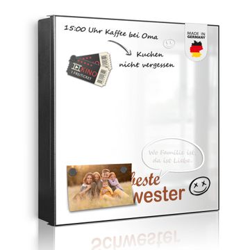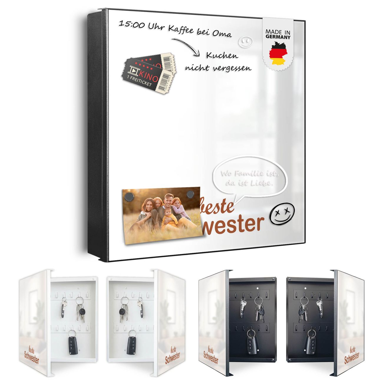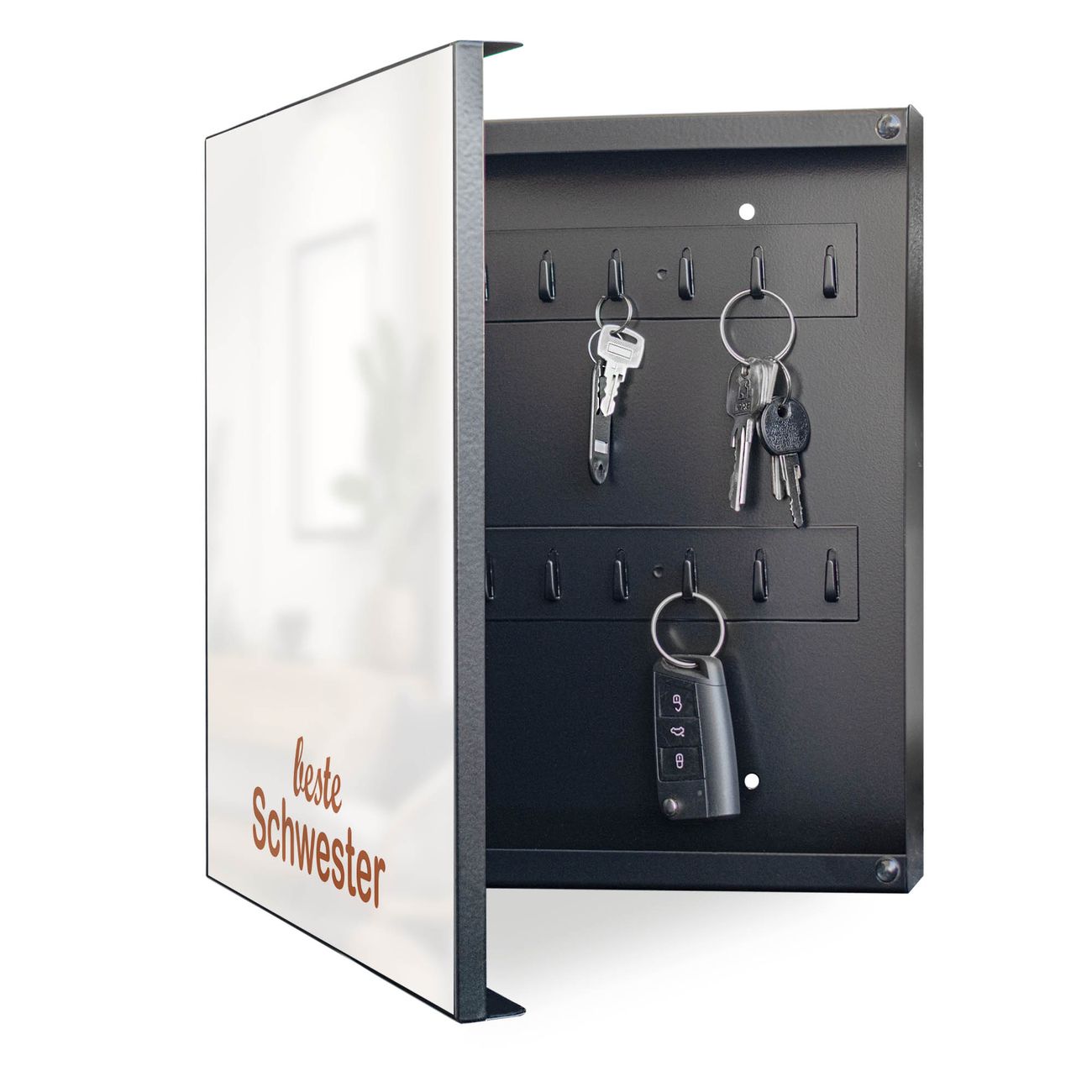 Bringe Ordnung und Eleganz in deinen Eingangsbereich mit dem banjado Schlüsselkasten Motiv Motiv beste Schwester 2. Die moderne Schlüsselbox kombiniert funktionales Design mit hochwertiger Verarbeitung und wird so zu einem echten Hingucker in Flur, Büro oder Ferienwohnung. ✅ Stilvolle Schlüsselaufbewahrung mit Motiv Motiv beste Schwester 2 Der Design-Schlüsselkasten Motiv Motiv beste Schwester 2 bietet Platz für bis zu 32 Schlüssel, die auf 4 stabilen Reihen mit je 8 Haken übersichtlich verstaut werden. Mit seinen kompakten Maßen von 30 x 30 x 5 cm passt die Schlüsselbox perfekt auch in kleinere Räume. Der schwarz lackierte Stahlkorpus mit links angeschlagenem Türscharnier harmoniert mit gedruckten Folie auf der Front und fügt sich nahtlos in jedes Wohnambiente ein. Ob als Schlüsselorganizer für Zuhause oder als praktische Lösung für Büros, Praxen und Gewerbe, der banjado Schlüsselkasten sorgt für Ordnung und Übersicht. Dank der magnetischen, mit Kreidestiften beschreibbaren Folie auf der Front kannst du Notizen anheften oder Termine direkt auf der Oberfläche festhalten. Die Schlüsselbox Motiv Motiv beste Schwester 2 zur Wandmontage wird inklusive Befestigungsmaterial geliefert und ist schnell angebracht. So hast du deine Schlüssel jederzeit griffbereit und zugleich stilvoll verstaut. Mit diesem banjado Schlüsselkasten Motiv Motiv beste Schwester 2 kombinierst du praktische Aufbewahrung mit stilvollem Wohndesign. Ob privat oder geschäftlich, die Schlüsselbox sorgt für mehr Ordnung, Übersicht und ein wohnliches Ambiente.Vorteile im Überblick