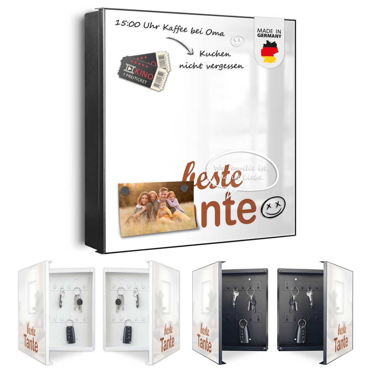Bringe Ordnung und Eleganz in deinen Eingangsbereich mit dem banjado Schlüsselkasten Motiv Motiv beste Tante 2. Die moderne Schlüsselbox kombiniert funktionales Design mit hochwertiger Verarbeitung und wird so zu einem echten Hingucker in Flur, Büro oder Ferienwohnung. ✅ Stilvolle Schlüsselaufbewahrung mit Motiv Motiv beste Tante 2 Der Design-Schlüsselkasten Motiv Motiv beste Tante 2 bietet Platz für bis zu 32 Schlüssel, die auf 4 stabilen Reihen mit je 8 Haken übersichtlich verstaut werden. Mit seinen kompakten Maßen von 30 x 30 x 5 cm passt die Schlüsselbox perfekt auch in kleinere Räume. Der schwarz lackierte Stahlkorpus mit links angeschlagenem Türscharnier harmoniert mit gedruckten Folie auf der Front und fügt sich nahtlos in jedes Wohnambiente ein. Ob als Schlüsselorganizer für Zuhause oder als praktische Lösung für Büros, Praxen und Gewerbe, der banjado Schlüsselkasten sorgt für Ordnung und Übersicht. Dank der magnetischen, mit Kreidestiften beschreibbaren Folie auf der Front kannst du Notizen anheften oder Termine direkt auf der Oberfläche festhalten. Die Schlüsselbox Motiv Motiv beste Tante 2 zur Wandmontage wird inklusive Befestigungsmaterial geliefert und ist schnell angebracht. So hast du deine Schlüssel jederzeit griffbereit und zugleich stilvoll verstaut. Mit diesem banjado Schlüsselkasten Motiv Motiv beste Tante 2 kombinierst du praktische Aufbewahrung mit stilvollem Wohndesign. Ob privat oder geschäftlich, die Schlüsselbox sorgt für mehr Ordnung, Übersicht und ein wohnliches Ambiente.Vorteile im Überblick