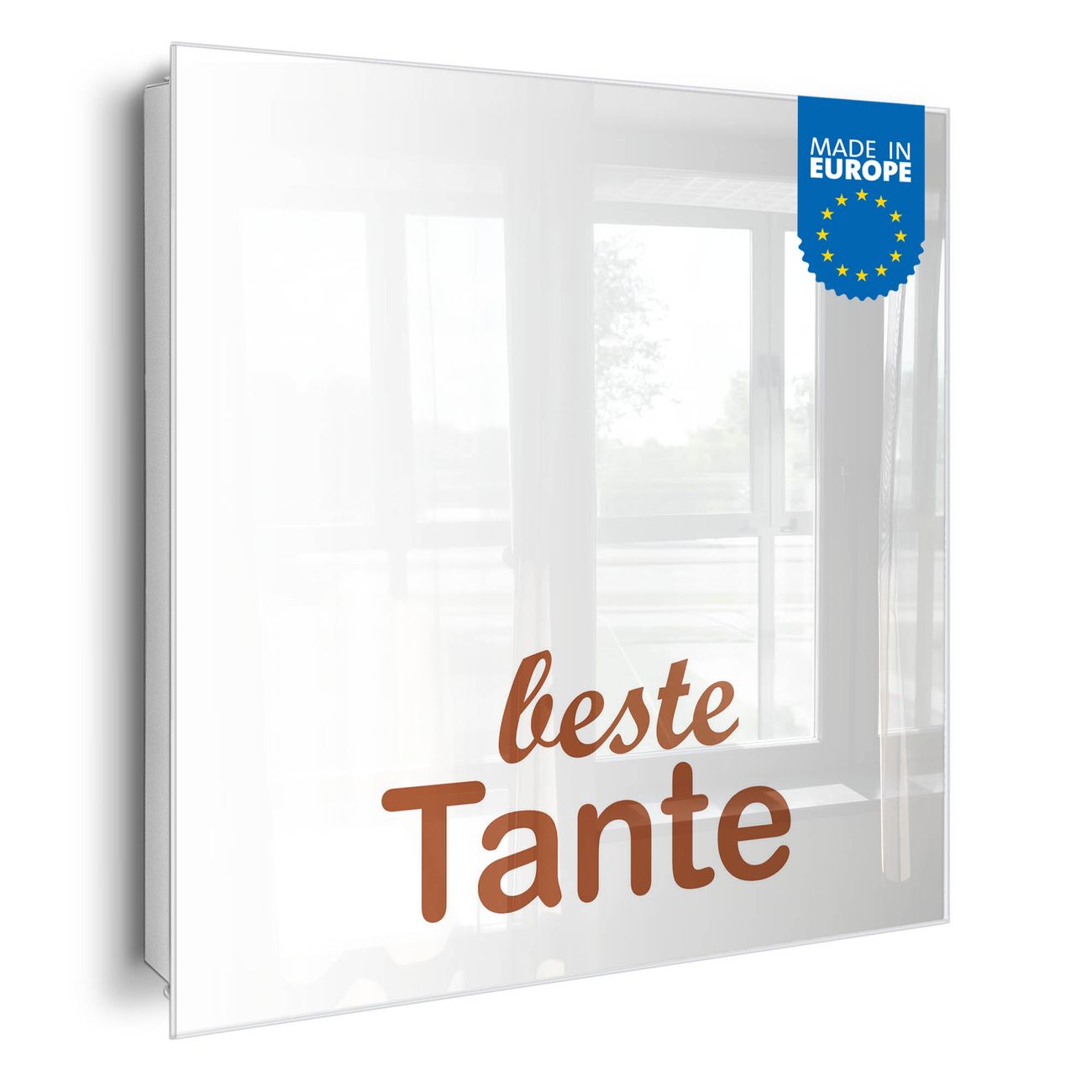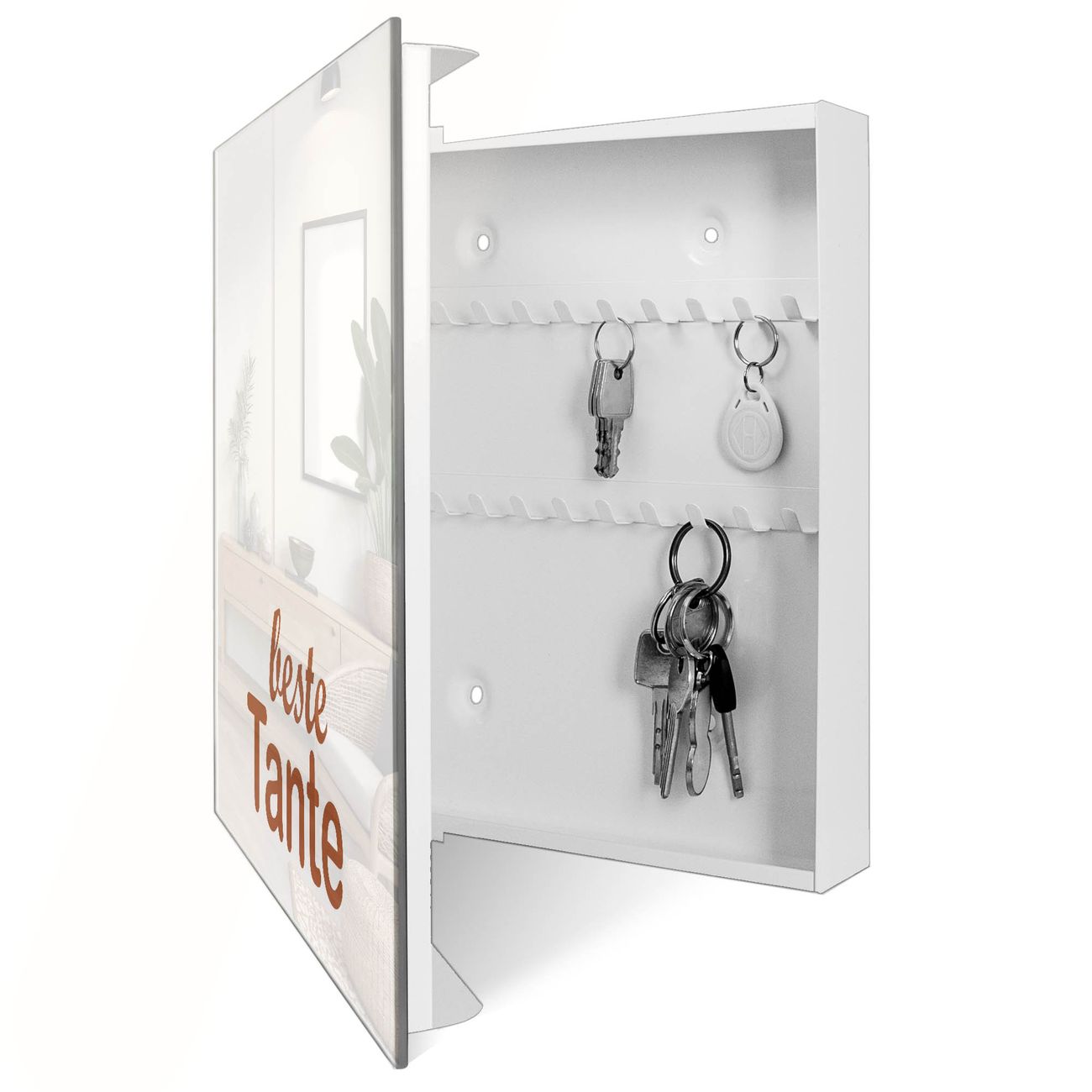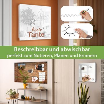 Bringe Ordnung und Eleganz in deinen Eingangsbereich mit dem banjado Schlüsselkasten Motiv Motiv beste Tante 2. Die moderne Schlüsselbox kombiniert funktionales Design mit hochwertiger Verarbeitung und wird so zu einem echten Hingucker in Flur, Büro oder Ferienwohnung. ✅ Stilvolle Schlüsselaufbewahrung mit Glasfront im Motiv Motiv beste Tante 2 Der Design-Schlüsselkasten Motiv Motiv beste Tante 2 bietet Platz für bis zu 50 Schlüssel, die auf 5 stabilen Reihen mit je 10 Haken übersichtlich verstaut werden. Mit seinen kompakten Maßen von 30 x 30 x 5 cm passt die Schlüsselbox perfekt auch in kleinere Räume. Der weiß lackierte Stahlkorpus mit rechts angeschlagenem Türscharnier harmoniert mit der Glasfront und fügt sich nahtlos in jedes Wohnambiente ein. Ob als Schlüsselorganizer für Zuhause oder als praktische Lösung für Büros, Praxen und Gewerbe, der banjado Schlüsselkasten sorgt für Ordnung und Übersicht. Dank der magnetischen, mit Kreidestiften beschreibbaren Glasfront kannst du Notizen anheften oder Termine direkt auf der Oberfläche festhalten. Die Schlüsselbox Motiv Motiv beste Tante 2 zur Wandmontage wird inklusive Befestigungsmaterial geliefert und ist schnell angebracht. So hast du deine Schlüssel jederzeit griffbereit und zugleich stilvoll verstaut. Mit diesem banjado Schlüsselkasten Motiv Motiv beste Tante 2 kombinierst du praktische Aufbewahrung mit stilvollem Wohndesign. Ob privat oder geschäftlich, die Schlüsselbox sorgt für mehr Ordnung, Übersicht und ein wohnliches Ambiente.Vorteile im Überblick