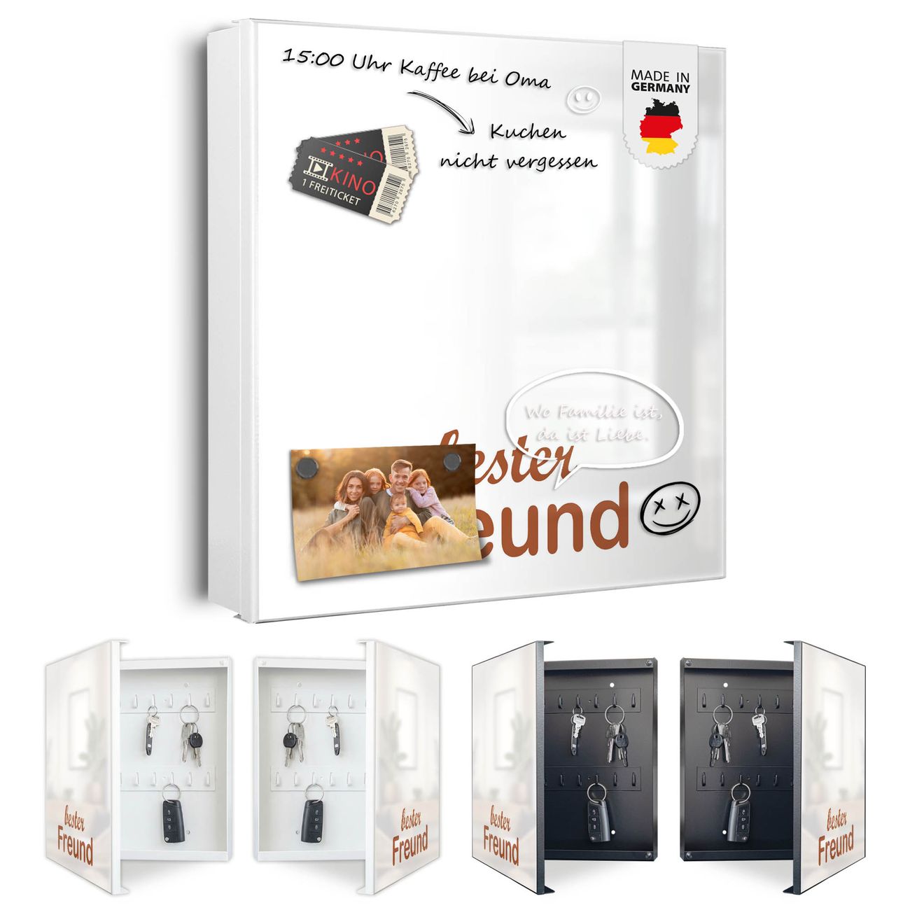 Bringe Ordnung und Eleganz in deinen Eingangsbereich mit dem banjado Schlüsselkasten Motiv Motiv bester Freund 2. Die moderne Schlüsselbox kombiniert funktionales Design mit hochwertiger Verarbeitung und wird so zu einem echten Hingucker in Flur, Büro oder Ferienwohnung. ✅ Stilvolle Schlüsselaufbewahrung mit Motiv Motiv bester Freund 2 Der Design-Schlüsselkasten Motiv Motiv bester Freund 2 bietet Platz für bis zu 32 Schlüssel, die auf 4 stabilen Reihen mit je 8 Haken übersichtlich verstaut werden. Mit seinen kompakten Maßen von 30 x 30 x 5 cm passt die Schlüsselbox perfekt auch in kleinere Räume. Der weiß lackierte Stahlkorpus mit links angeschlagenem Türscharnier harmoniert mit gedruckten Folie auf der Front und fügt sich nahtlos in jedes Wohnambiente ein. Ob als Schlüsselorganizer für Zuhause oder als praktische Lösung für Büros, Praxen und Gewerbe, der banjado Schlüsselkasten sorgt für Ordnung und Übersicht. Dank der magnetischen, mit Kreidestiften beschreibbaren Folie auf der Front kannst du Notizen anheften oder Termine direkt auf der Oberfläche festhalten. Die Schlüsselbox Motiv Motiv bester Freund 2 zur Wandmontage wird inklusive Befestigungsmaterial geliefert und ist schnell angebracht. So hast du deine Schlüssel jederzeit griffbereit und zugleich stilvoll verstaut. Mit diesem banjado Schlüsselkasten Motiv Motiv bester Freund 2 kombinierst du praktische Aufbewahrung mit stilvollem Wohndesign. Ob privat oder geschäftlich, die Schlüsselbox sorgt für mehr Ordnung, Übersicht und ein wohnliches Ambiente.Vorteile im Überblick