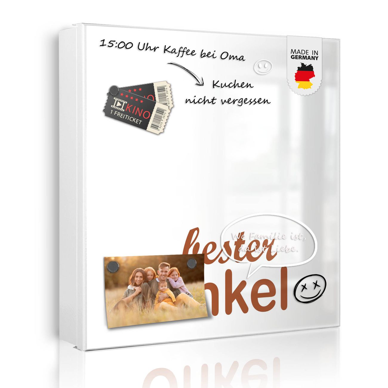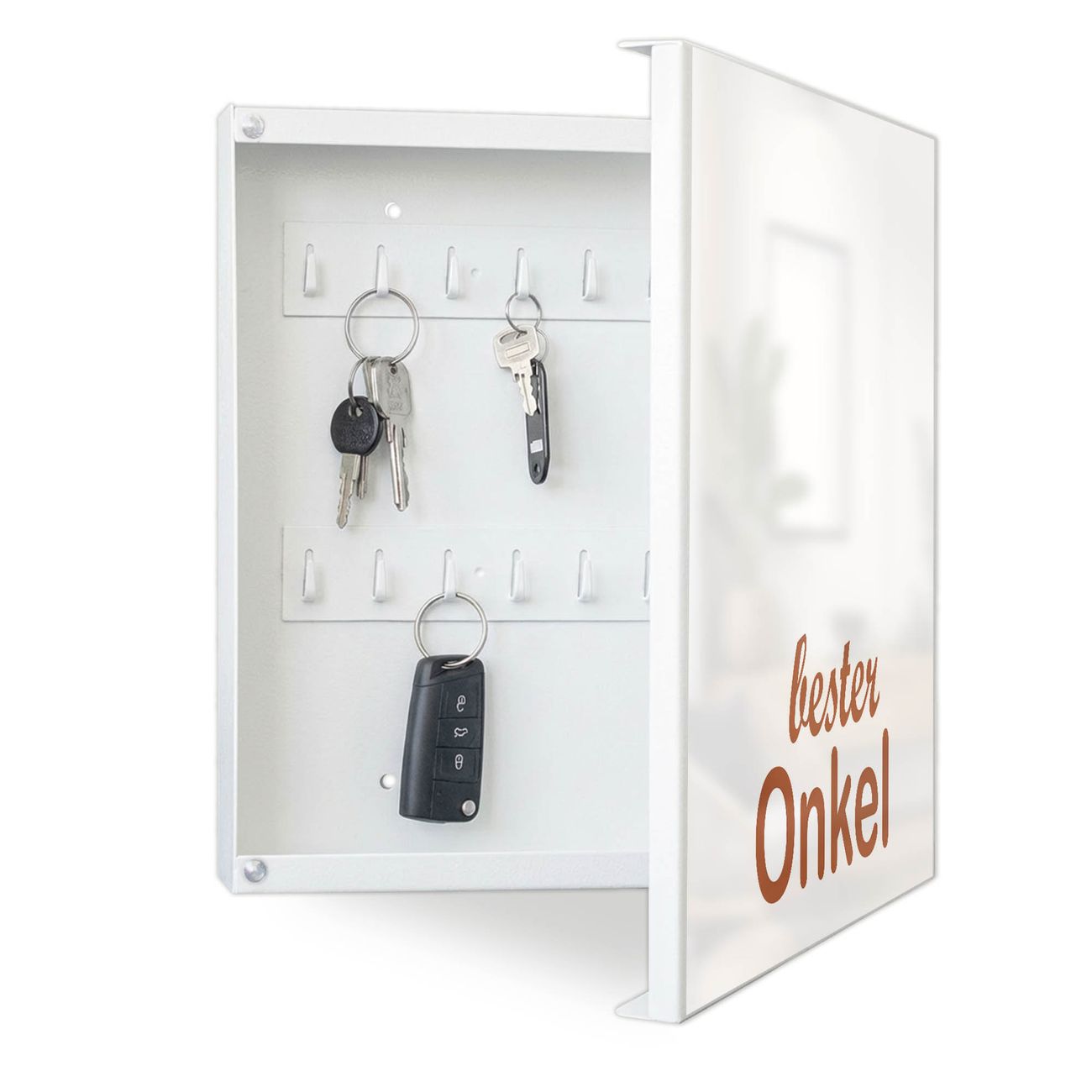 Bringe Ordnung und Eleganz in deinen Eingangsbereich mit dem banjado Schlüsselkasten Motiv Motiv bester Onkel 2. Die moderne Schlüsselbox kombiniert funktionales Design mit hochwertiger Verarbeitung und wird so zu einem echten Hingucker in Flur, Büro oder Ferienwohnung. ✅ Stilvolle Schlüsselaufbewahrung mit Motiv Motiv bester Onkel 2 Der Design-Schlüsselkasten Motiv Motiv bester Onkel 2 bietet Platz für bis zu 32 Schlüssel, die auf 4 stabilen Reihen mit je 8 Haken übersichtlich verstaut werden. Mit seinen kompakten Maßen von 30 x 30 x 5 cm passt die Schlüsselbox perfekt auch in kleinere Räume. Der weiß lackierte Stahlkorpus mit rechts angeschlagenem Türscharnier harmoniert mit gedruckten Folie auf der Front und fügt sich nahtlos in jedes Wohnambiente ein. Ob als Schlüsselorganizer für Zuhause oder als praktische Lösung für Büros, Praxen und Gewerbe, der banjado Schlüsselkasten sorgt für Ordnung und Übersicht. Dank der magnetischen, mit Kreidestiften beschreibbaren Folie auf der Front kannst du Notizen anheften oder Termine direkt auf der Oberfläche festhalten. Die Schlüsselbox Motiv Motiv bester Onkel 2 zur Wandmontage wird inklusive Befestigungsmaterial geliefert und ist schnell angebracht. So hast du deine Schlüssel jederzeit griffbereit und zugleich stilvoll verstaut. Mit diesem banjado Schlüsselkasten Motiv Motiv bester Onkel 2 kombinierst du praktische Aufbewahrung mit stilvollem Wohndesign. Ob privat oder geschäftlich, die Schlüsselbox sorgt für mehr Ordnung, Übersicht und ein wohnliches Ambiente.Vorteile im Überblick