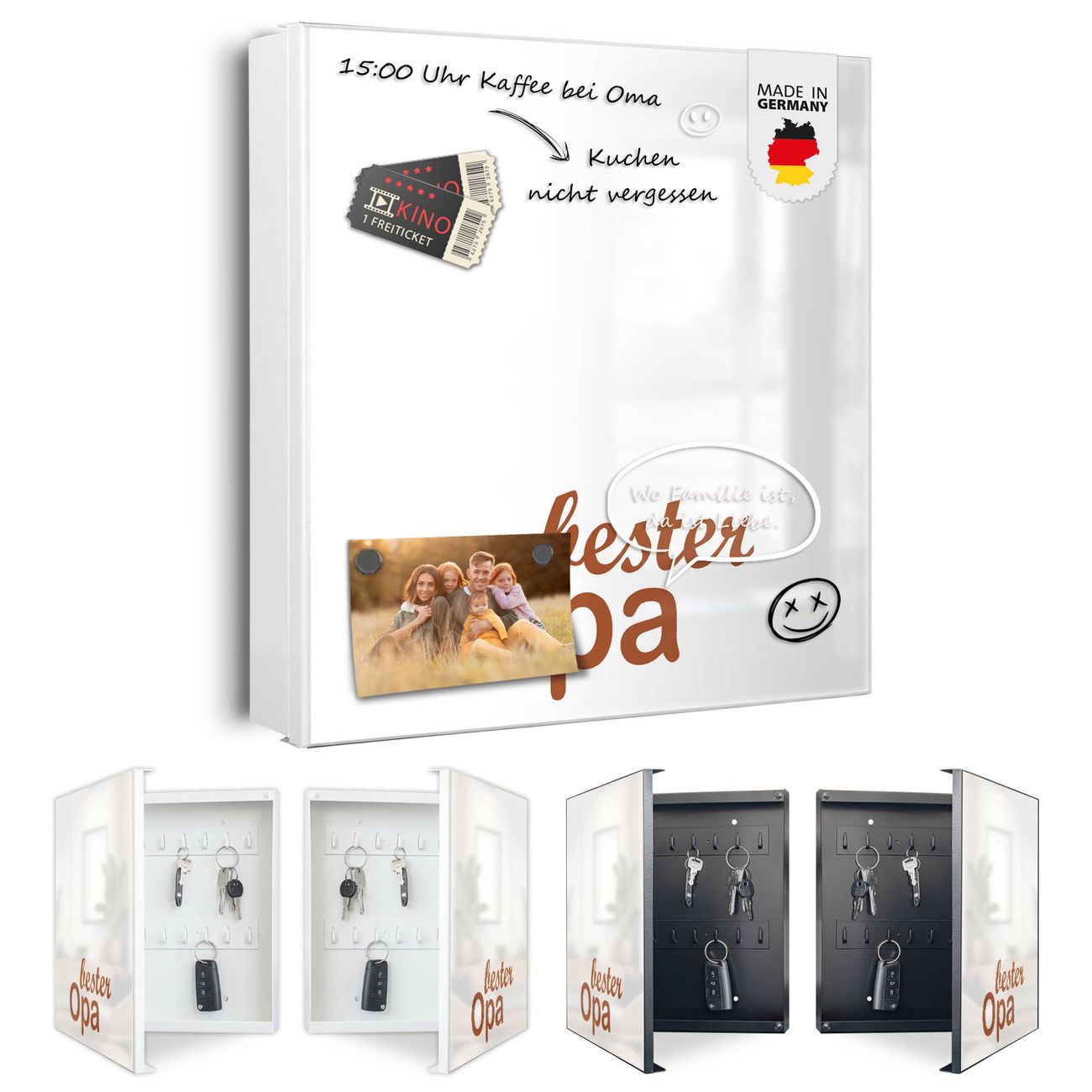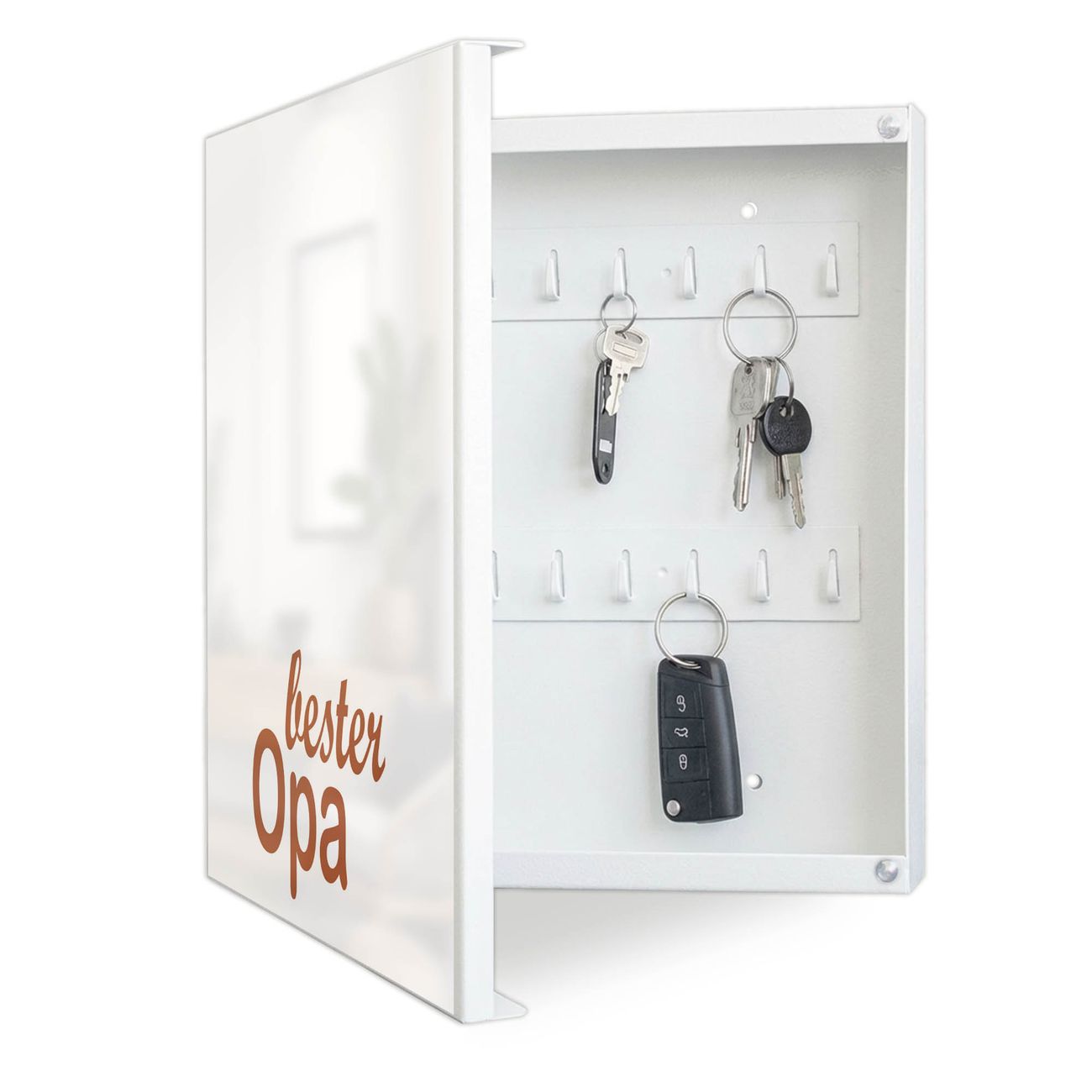 Bringe Ordnung und Eleganz in deinen Eingangsbereich mit dem banjado Schlüsselkasten Motiv Motiv bester Opa 2. Die moderne Schlüsselbox kombiniert funktionales Design mit hochwertiger Verarbeitung und wird so zu einem echten Hingucker in Flur, Büro oder Ferienwohnung. ✅ Stilvolle Schlüsselaufbewahrung mit Motiv Motiv bester Opa 2 Der Design-Schlüsselkasten Motiv Motiv bester Opa 2 bietet Platz für bis zu 32 Schlüssel, die auf 4 stabilen Reihen mit je 8 Haken übersichtlich verstaut werden. Mit seinen kompakten Maßen von 30 x 30 x 5 cm passt die Schlüsselbox perfekt auch in kleinere Räume. Der weiß lackierte Stahlkorpus mit links angeschlagenem Türscharnier harmoniert mit gedruckten Folie auf der Front und fügt sich nahtlos in jedes Wohnambiente ein. Ob als Schlüsselorganizer für Zuhause oder als praktische Lösung für Büros, Praxen und Gewerbe, der banjado Schlüsselkasten sorgt für Ordnung und Übersicht. Dank der magnetischen, mit Kreidestiften beschreibbaren Folie auf der Front kannst du Notizen anheften oder Termine direkt auf der Oberfläche festhalten. Die Schlüsselbox Motiv Motiv bester Opa 2 zur Wandmontage wird inklusive Befestigungsmaterial geliefert und ist schnell angebracht. So hast du deine Schlüssel jederzeit griffbereit und zugleich stilvoll verstaut. Mit diesem banjado Schlüsselkasten Motiv Motiv bester Opa 2 kombinierst du praktische Aufbewahrung mit stilvollem Wohndesign. Ob privat oder geschäftlich, die Schlüsselbox sorgt für mehr Ordnung, Übersicht und ein wohnliches Ambiente.Vorteile im Überblick