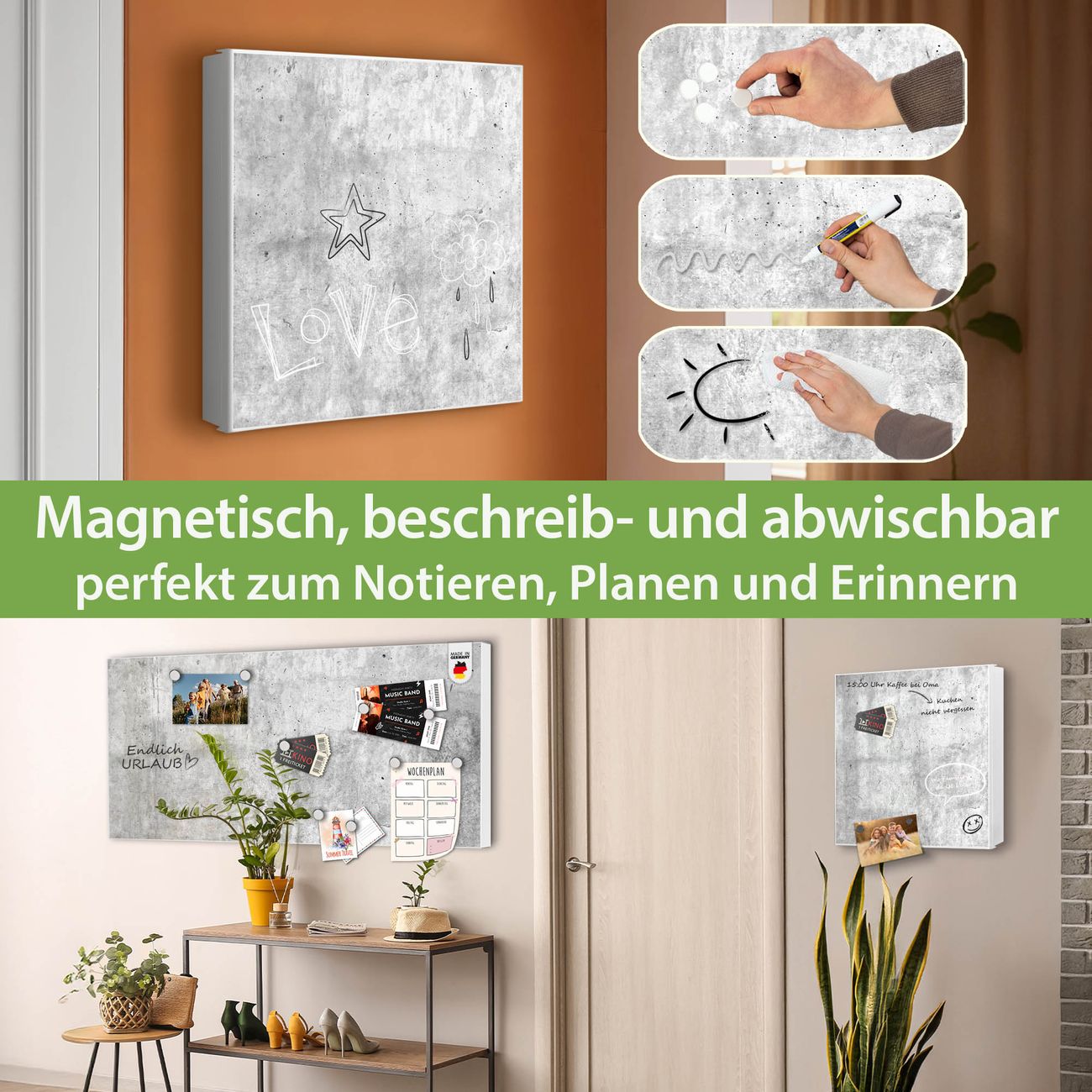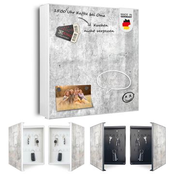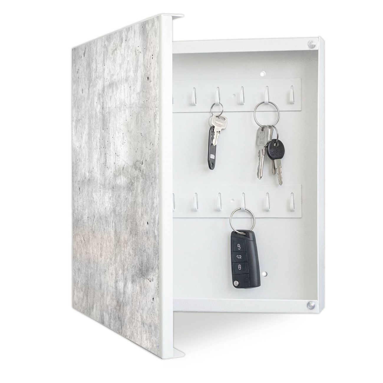 Bringe Ordnung und Eleganz in deinen Eingangsbereich mit dem banjado Schlüsselkasten Motiv Motiv Betontextur Grau. Die moderne Schlüsselbox kombiniert funktionales Design mit hochwertiger Verarbeitung und wird so zu einem echten Hingucker in Flur, Büro oder Ferienwohnung. ✅ Stilvolle Schlüsselaufbewahrung mit Motiv Motiv Betontextur Grau Der Design-Schlüsselkasten Motiv Motiv Betontextur Grau bietet Platz für bis zu 32 Schlüssel, die auf 4 stabilen Reihen mit je 8 Haken übersichtlich verstaut werden. Mit seinen kompakten Maßen von 30 x 30 x 5 cm passt die Schlüsselbox perfekt auch in kleinere Räume. Der weiß lackierte Stahlkorpus mit links angeschlagenem Türscharnier harmoniert mit gedruckten Folie auf der Front und fügt sich nahtlos in jedes Wohnambiente ein. Ob als Schlüsselorganizer für Zuhause oder als praktische Lösung für Büros, Praxen und Gewerbe, der banjado Schlüsselkasten sorgt für Ordnung und Übersicht. Dank der magnetischen, mit Kreidestiften beschreibbaren Folie auf der Front kannst du Notizen anheften oder Termine direkt auf der Oberfläche festhalten. Die Schlüsselbox Motiv Motiv Betontextur Grau zur Wandmontage wird inklusive Befestigungsmaterial geliefert und ist schnell angebracht. So hast du deine Schlüssel jederzeit griffbereit und zugleich stilvoll verstaut. Mit diesem banjado Schlüsselkasten Motiv Motiv Betontextur Grau kombinierst du praktische Aufbewahrung mit stilvollem Wohndesign. Ob privat oder geschäftlich, die Schlüsselbox sorgt für mehr Ordnung, Übersicht und ein wohnliches Ambiente.Vorteile im Überblick