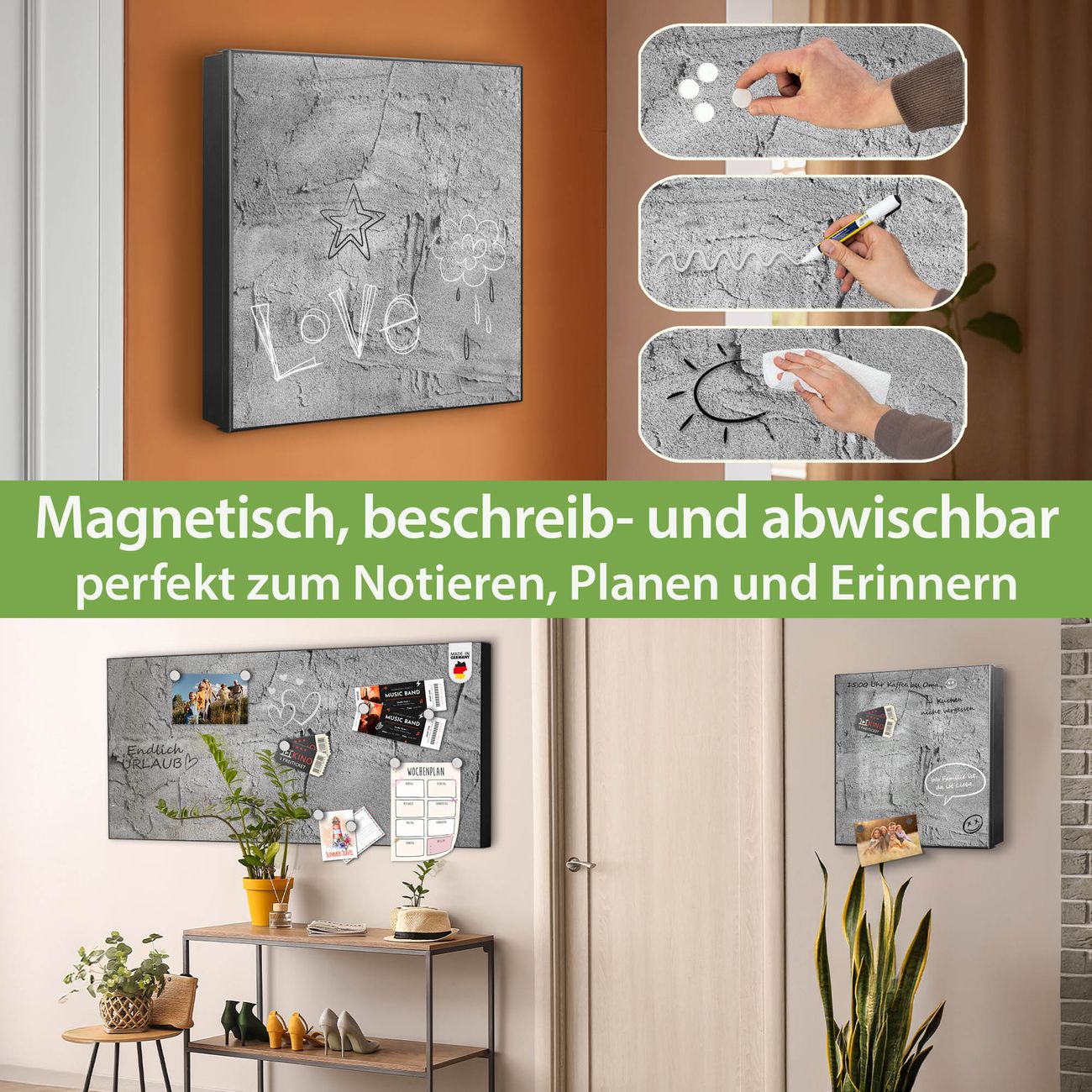 Bringe Ordnung und Eleganz in deinen Eingangsbereich mit dem banjado Schlüsselkasten Motiv Motiv Betonwand Struktur Grau. Die moderne Schlüsselbox kombiniert funktionales Design mit hochwertiger Verarbeitung und wird so zu einem echten Hingucker in Flur, Büro oder Ferienwohnung. ✅ Stilvolle Schlüsselaufbewahrung mit Motiv Motiv Betonwand Struktur Grau Der Design-Schlüsselkasten Motiv Motiv Betonwand Struktur Grau bietet Platz für bis zu 32 Schlüssel, die auf 4 stabilen Reihen mit je 8 Haken übersichtlich verstaut werden. Mit seinen kompakten Maßen von 30 x 30 x 5 cm passt die Schlüsselbox perfekt auch in kleinere Räume. Der schwarz lackierte Stahlkorpus mit rechts angeschlagenem Türscharnier harmoniert mit gedruckten Folie auf der Front und fügt sich nahtlos in jedes Wohnambiente ein. Ob als Schlüsselorganizer für Zuhause oder als praktische Lösung für Büros, Praxen und Gewerbe, der banjado Schlüsselkasten sorgt für Ordnung und Übersicht. Dank der magnetischen, mit Kreidestiften beschreibbaren Folie auf der Front kannst du Notizen anheften oder Termine direkt auf der Oberfläche festhalten. Die Schlüsselbox Motiv Motiv Betonwand Struktur Grau zur Wandmontage wird inklusive Befestigungsmaterial geliefert und ist schnell angebracht. So hast du deine Schlüssel jederzeit griffbereit und zugleich stilvoll verstaut. Mit diesem banjado Schlüsselkasten Motiv Motiv Betonwand Struktur Grau kombinierst du praktische Aufbewahrung mit stilvollem Wohndesign. Ob privat oder geschäftlich, die Schlüsselbox sorgt für mehr Ordnung, Übersicht und ein wohnliches Ambiente.Vorteile im Überblick