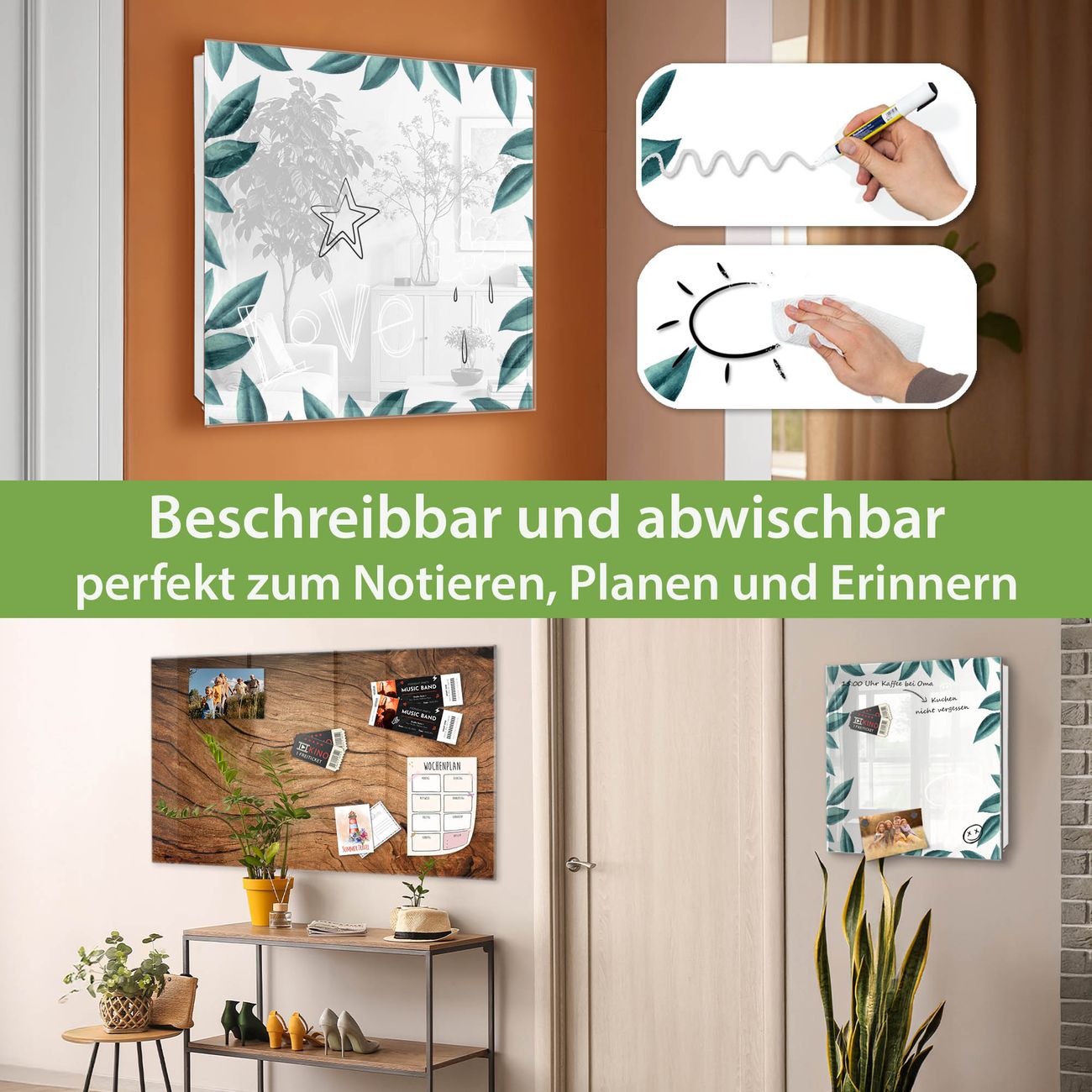 Bringe Ordnung und Eleganz in deinen Eingangsbereich mit dem banjado Schlüsselkasten Motiv Motiv Blätterrahmen. Die moderne Schlüsselbox kombiniert funktionales Design mit hochwertiger Verarbeitung und wird so zu einem echten Hingucker in Flur, Büro oder Ferienwohnung. ✅ Stilvolle Schlüsselaufbewahrung mit Glasfront im Motiv Motiv Blätterrahmen Der Design-Schlüsselkasten Motiv Motiv Blätterrahmen bietet Platz für bis zu 50 Schlüssel, die auf 5 stabilen Reihen mit je 10 Haken übersichtlich verstaut werden. Mit seinen kompakten Maßen von 30 x 30 x 5 cm passt die Schlüsselbox perfekt auch in kleinere Räume. Der weiß lackierte Stahlkorpus mit rechts angeschlagenem Türscharnier harmoniert mit der Glasfront und fügt sich nahtlos in jedes Wohnambiente ein. Ob als Schlüsselorganizer für Zuhause oder als praktische Lösung für Büros, Praxen und Gewerbe, der banjado Schlüsselkasten sorgt für Ordnung und Übersicht. Dank der magnetischen, mit Kreidestiften beschreibbaren Glasfront kannst du Notizen anheften oder Termine direkt auf der Oberfläche festhalten. Die Schlüsselbox Motiv Motiv Blätterrahmen zur Wandmontage wird inklusive Befestigungsmaterial geliefert und ist schnell angebracht. So hast du deine Schlüssel jederzeit griffbereit und zugleich stilvoll verstaut. Mit diesem banjado Schlüsselkasten Motiv Motiv Blätterrahmen kombinierst du praktische Aufbewahrung mit stilvollem Wohndesign. Ob privat oder geschäftlich, die Schlüsselbox sorgt für mehr Ordnung, Übersicht und ein wohnliches Ambiente.Vorteile im Überblick