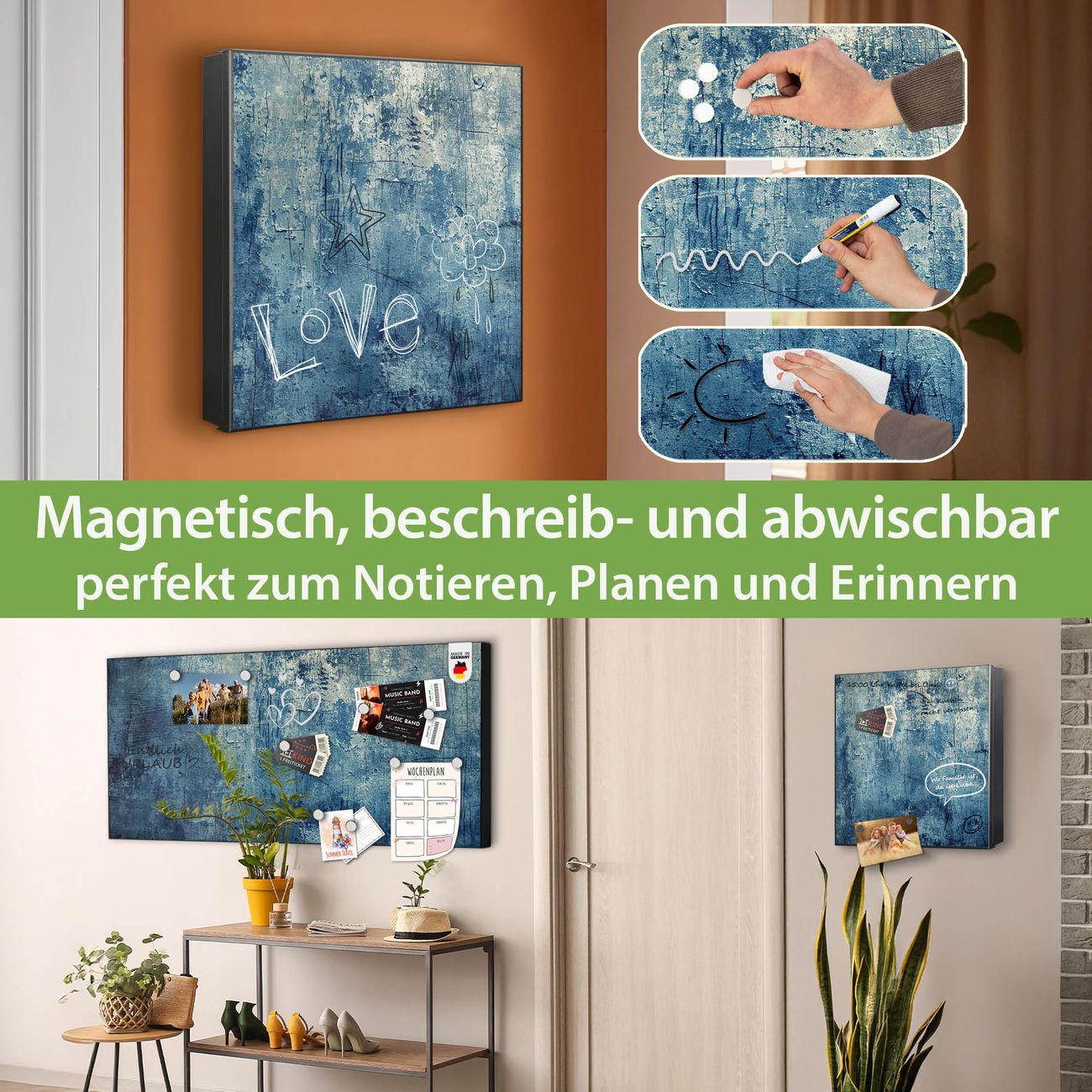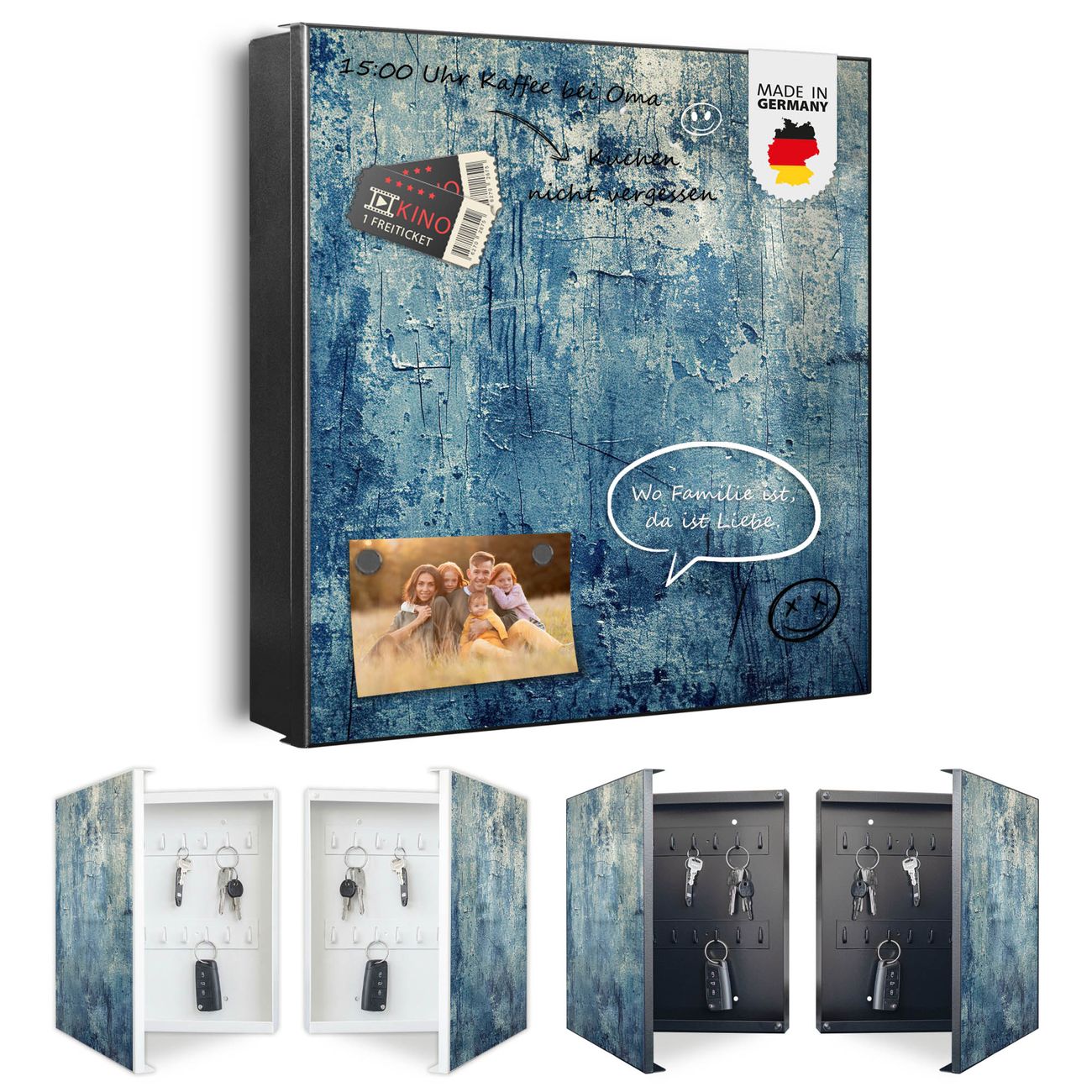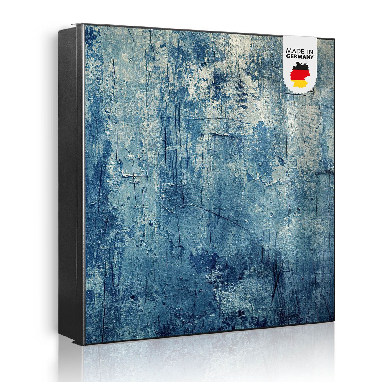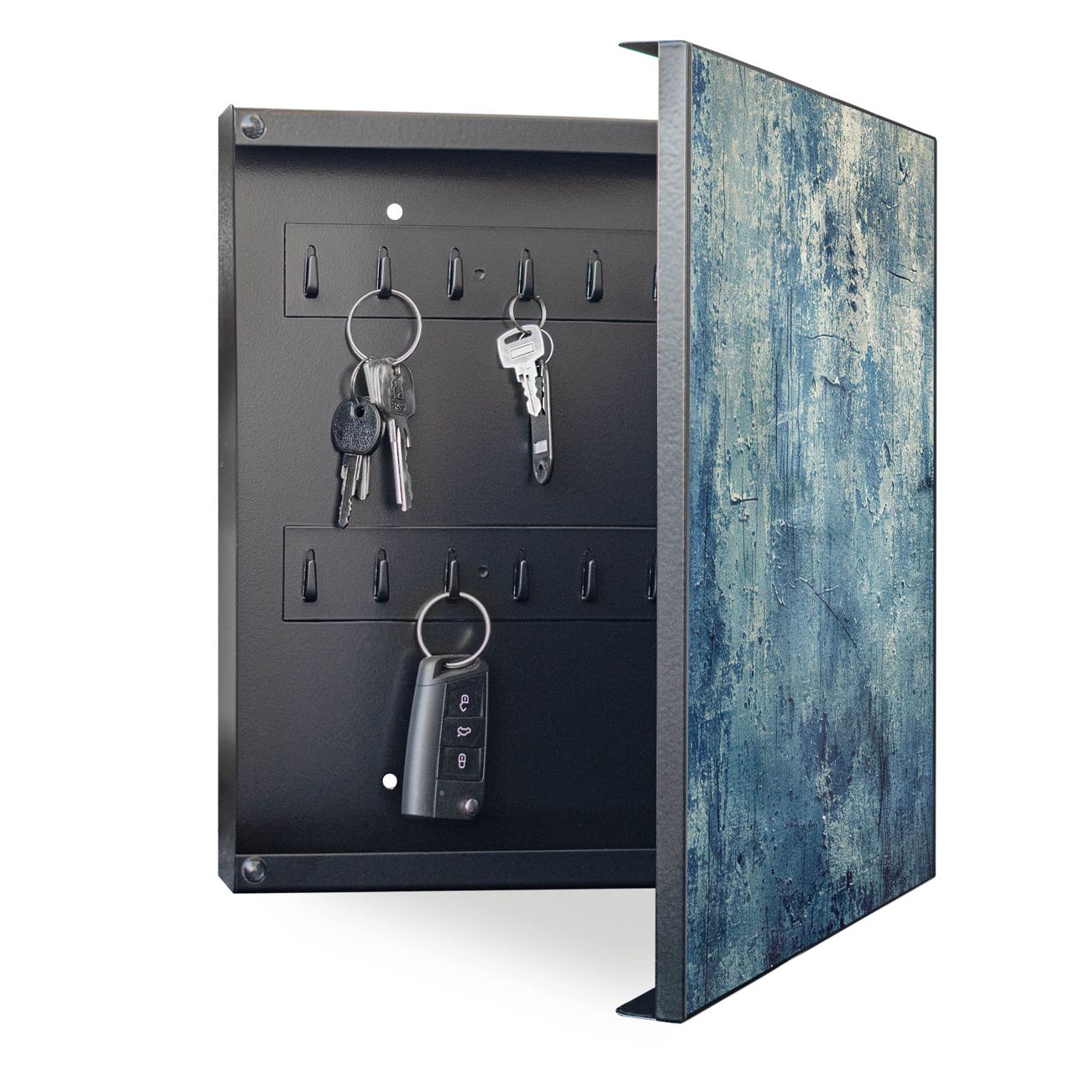 Bringe Ordnung und Eleganz in deinen Eingangsbereich mit dem banjado Schlüsselkasten Motiv Motiv Blaue Wandtextur. Die moderne Schlüsselbox kombiniert funktionales Design mit hochwertiger Verarbeitung und wird so zu einem echten Hingucker in Flur, Büro oder Ferienwohnung. ✅ Stilvolle Schlüsselaufbewahrung mit Motiv Motiv Blaue Wandtextur Der Design-Schlüsselkasten Motiv Motiv Blaue Wandtextur bietet Platz für bis zu 32 Schlüssel, die auf 4 stabilen Reihen mit je 8 Haken übersichtlich verstaut werden. Mit seinen kompakten Maßen von 30 x 30 x 5 cm passt die Schlüsselbox perfekt auch in kleinere Räume. Der schwarz lackierte Stahlkorpus mit rechts angeschlagenem Türscharnier harmoniert mit gedruckten Folie auf der Front und fügt sich nahtlos in jedes Wohnambiente ein. Ob als Schlüsselorganizer für Zuhause oder als praktische Lösung für Büros, Praxen und Gewerbe, der banjado Schlüsselkasten sorgt für Ordnung und Übersicht. Dank der magnetischen, mit Kreidestiften beschreibbaren Folie auf der Front kannst du Notizen anheften oder Termine direkt auf der Oberfläche festhalten. Die Schlüsselbox Motiv Motiv Blaue Wandtextur zur Wandmontage wird inklusive Befestigungsmaterial geliefert und ist schnell angebracht. So hast du deine Schlüssel jederzeit griffbereit und zugleich stilvoll verstaut. Mit diesem banjado Schlüsselkasten Motiv Motiv Blaue Wandtextur kombinierst du praktische Aufbewahrung mit stilvollem Wohndesign. Ob privat oder geschäftlich, die Schlüsselbox sorgt für mehr Ordnung, Übersicht und ein wohnliches Ambiente.Vorteile im Überblick