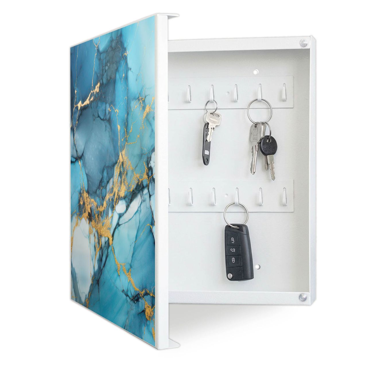 Bringe Ordnung und Eleganz in deinen Eingangsbereich mit dem banjado Schlüsselkasten Motiv Motiv Blauer Marmor mit Gold 2. Die moderne Schlüsselbox kombiniert funktionales Design mit hochwertiger Verarbeitung und wird so zu einem echten Hingucker in Flur, Büro oder Ferienwohnung. ✅ Stilvolle Schlüsselaufbewahrung mit Motiv Motiv Blauer Marmor mit Gold 2 Der Design-Schlüsselkasten Motiv Motiv Blauer Marmor mit Gold 2 bietet Platz für bis zu 32 Schlüssel, die auf 4 stabilen Reihen mit je 8 Haken übersichtlich verstaut werden. Mit seinen kompakten Maßen von 30 x 30 x 5 cm passt die Schlüsselbox perfekt auch in kleinere Räume. Der weiß lackierte Stahlkorpus mit links angeschlagenem Türscharnier harmoniert mit gedruckten Folie auf der Front und fügt sich nahtlos in jedes Wohnambiente ein. Ob als Schlüsselorganizer für Zuhause oder als praktische Lösung für Büros, Praxen und Gewerbe, der banjado Schlüsselkasten sorgt für Ordnung und Übersicht. Dank der magnetischen, mit Kreidestiften beschreibbaren Folie auf der Front kannst du Notizen anheften oder Termine direkt auf der Oberfläche festhalten. Die Schlüsselbox Motiv Motiv Blauer Marmor mit Gold 2 zur Wandmontage wird inklusive Befestigungsmaterial geliefert und ist schnell angebracht. So hast du deine Schlüssel jederzeit griffbereit und zugleich stilvoll verstaut. Mit diesem banjado Schlüsselkasten Motiv Motiv Blauer Marmor mit Gold 2 kombinierst du praktische Aufbewahrung mit stilvollem Wohndesign. Ob privat oder geschäftlich, die Schlüsselbox sorgt für mehr Ordnung, Übersicht und ein wohnliches Ambiente.Vorteile im Überblick