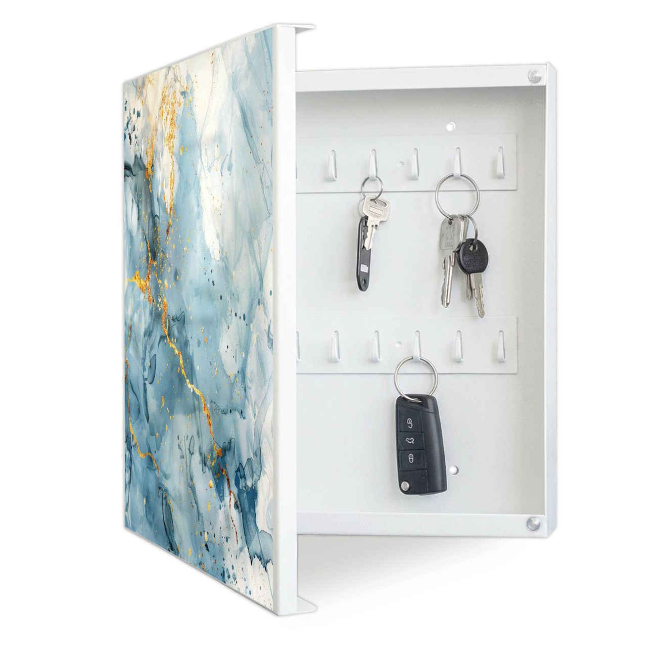 Bringe Ordnung und Eleganz in deinen Eingangsbereich mit dem banjado Schlüsselkasten Motiv Motiv Blauer Marmor mit Gold 3. Die moderne Schlüsselbox kombiniert funktionales Design mit hochwertiger Verarbeitung und wird so zu einem echten Hingucker in Flur, Büro oder Ferienwohnung. ✅ Stilvolle Schlüsselaufbewahrung mit Motiv Motiv Blauer Marmor mit Gold 3 Der Design-Schlüsselkasten Motiv Motiv Blauer Marmor mit Gold 3 bietet Platz für bis zu 32 Schlüssel, die auf 4 stabilen Reihen mit je 8 Haken übersichtlich verstaut werden. Mit seinen kompakten Maßen von 30 x 30 x 5 cm passt die Schlüsselbox perfekt auch in kleinere Räume. Der weiß lackierte Stahlkorpus mit links angeschlagenem Türscharnier harmoniert mit gedruckten Folie auf der Front und fügt sich nahtlos in jedes Wohnambiente ein. Ob als Schlüsselorganizer für Zuhause oder als praktische Lösung für Büros, Praxen und Gewerbe, der banjado Schlüsselkasten sorgt für Ordnung und Übersicht. Dank der magnetischen, mit Kreidestiften beschreibbaren Folie auf der Front kannst du Notizen anheften oder Termine direkt auf der Oberfläche festhalten. Die Schlüsselbox Motiv Motiv Blauer Marmor mit Gold 3 zur Wandmontage wird inklusive Befestigungsmaterial geliefert und ist schnell angebracht. So hast du deine Schlüssel jederzeit griffbereit und zugleich stilvoll verstaut. Mit diesem banjado Schlüsselkasten Motiv Motiv Blauer Marmor mit Gold 3 kombinierst du praktische Aufbewahrung mit stilvollem Wohndesign. Ob privat oder geschäftlich, die Schlüsselbox sorgt für mehr Ordnung, Übersicht und ein wohnliches Ambiente.Vorteile im Überblick
