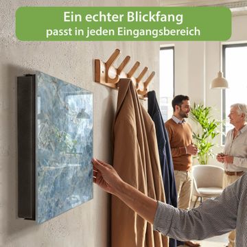 Bringe Ordnung und Eleganz in deinen Eingangsbereich mit dem banjado Schlüsselkasten Motiv Blauer Marmor. Die moderne Schlüsselbox kombiniert funktionales Design mit hochwertiger Verarbeitung und wird so zu einem echten Hingucker in Flur, Büro oder Ferienwohnung. ✅ Stilvolle Schlüsselaufbewahrung mit Glasfront im Motiv Motiv Blauer Marmor Der Design-Schlüsselkasten Motiv Blauer Marmor bietet Platz für bis zu 50 Schlüssel, die auf 5 stabilen Reihen mit je 10 Haken übersichtlich verstaut werden. Mit seinen kompakten Maßen von 30 x 30 x 5 cm passt die Schlüsselbox perfekt auch in kleinere Räume. Der schwarz lackierte Stahlkorpus mit rechts angeschlagenem Türscharnier harmoniert mit der Glasfront und fügt sich nahtlos in jedes Wohnambiente ein. Ob als Schlüsselorganizer für Zuhause oder als praktische Lösung für Büros, Praxen und Gewerbe, der banjado Schlüsselkasten sorgt für Ordnung und Übersicht. Dank der magnetischen, mit Kreidestiften beschreibbaren Glasfront kannst du Notizen anheften oder Termine direkt auf der Oberfläche festhalten. Die Schlüsselbox Motiv Blauer Marmor zur Wandmontage wird inklusive Befestigungsmaterial geliefert und ist schnell angebracht. So hast du deine Schlüssel jederzeit griffbereit und zugleich stilvoll verstaut. Mit diesem banjado Schlüsselkasten Motiv Blauer Marmor kombinierst du praktische Aufbewahrung mit stilvollem Wohndesign. Ob privat oder geschäftlich, die Schlüsselbox sorgt für mehr Ordnung, Übersicht und ein wohnliches Ambiente.Vorteile im Überblick