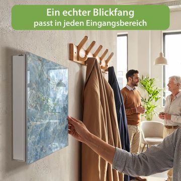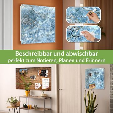 Bringe Ordnung und Eleganz in deinen Eingangsbereich mit dem banjado Schlüsselkasten Motiv Blauer Marmor. Die moderne Schlüsselbox kombiniert funktionales Design mit hochwertiger Verarbeitung und wird so zu einem echten Hingucker in Flur, Büro oder Ferienwohnung. ✅ Stilvolle Schlüsselaufbewahrung mit Glasfront im Motiv Motiv Blauer Marmor Der Design-Schlüsselkasten Motiv Blauer Marmor bietet Platz für bis zu 50 Schlüssel, die auf 5 stabilen Reihen mit je 10 Haken übersichtlich verstaut werden. Mit seinen kompakten Maßen von 30 x 30 x 5 cm passt die Schlüsselbox perfekt auch in kleinere Räume. Der weiß lackierte Stahlkorpus mit rechts angeschlagenem Türscharnier harmoniert mit der Glasfront und fügt sich nahtlos in jedes Wohnambiente ein. Ob als Schlüsselorganizer für Zuhause oder als praktische Lösung für Büros, Praxen und Gewerbe, der banjado Schlüsselkasten sorgt für Ordnung und Übersicht. Dank der magnetischen, mit Kreidestiften beschreibbaren Glasfront kannst du Notizen anheften oder Termine direkt auf der Oberfläche festhalten. Die Schlüsselbox Motiv Blauer Marmor zur Wandmontage wird inklusive Befestigungsmaterial geliefert und ist schnell angebracht. So hast du deine Schlüssel jederzeit griffbereit und zugleich stilvoll verstaut. Mit diesem banjado Schlüsselkasten Motiv Blauer Marmor kombinierst du praktische Aufbewahrung mit stilvollem Wohndesign. Ob privat oder geschäftlich, die Schlüsselbox sorgt für mehr Ordnung, Übersicht und ein wohnliches Ambiente.Vorteile im Überblick