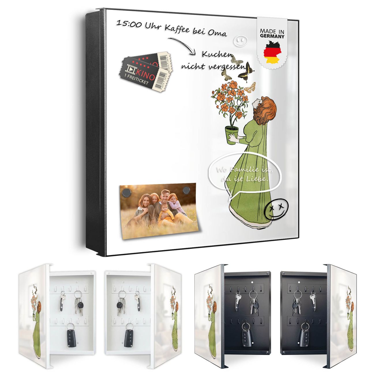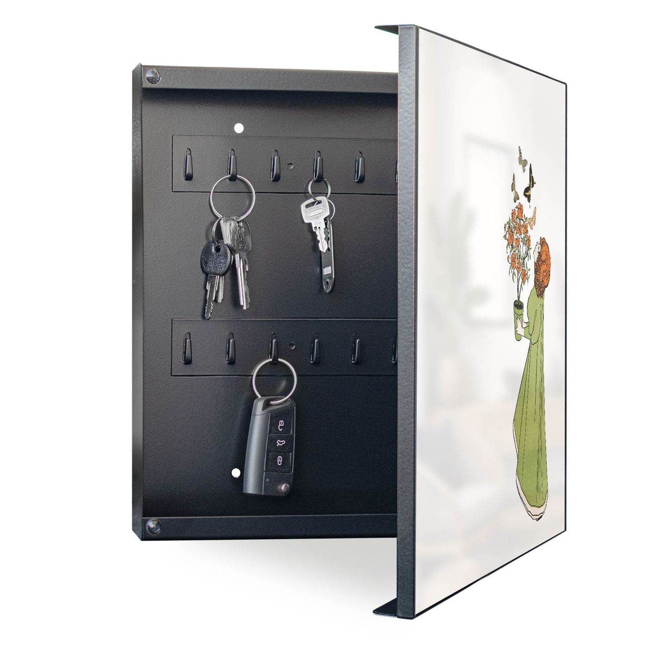 Bringe Ordnung und Eleganz in deinen Eingangsbereich mit dem banjado Schlüsselkasten Motiv Motiv Mädchen mit Blumentopf Vintage. Die moderne Schlüsselbox kombiniert funktionales Design mit hochwertiger Verarbeitung und wird so zu einem echten Hingucker in Flur, Büro oder Ferienwohnung. ✅ Stilvolle Schlüsselaufbewahrung mit Motiv Motiv Mädchen mit Blumentopf Vintage Der Design-Schlüsselkasten Motiv Motiv Mädchen mit Blumentopf Vintage bietet Platz für bis zu 32 Schlüssel, die auf 4 stabilen Reihen mit je 8 Haken übersichtlich verstaut werden. Mit seinen kompakten Maßen von 30 x 30 x 5 cm passt die Schlüsselbox perfekt auch in kleinere Räume. Der schwarz lackierte Stahlkorpus mit rechts angeschlagenem Türscharnier harmoniert mit gedruckten Folie auf der Front und fügt sich nahtlos in jedes Wohnambiente ein. Ob als Schlüsselorganizer für Zuhause oder als praktische Lösung für Büros, Praxen und Gewerbe, der banjado Schlüsselkasten sorgt für Ordnung und Übersicht. Dank der magnetischen, mit Kreidestiften beschreibbaren Folie auf der Front kannst du Notizen anheften oder Termine direkt auf der Oberfläche festhalten. Die Schlüsselbox Motiv Motiv Mädchen mit Blumentopf Vintage zur Wandmontage wird inklusive Befestigungsmaterial geliefert und ist schnell angebracht. So hast du deine Schlüssel jederzeit griffbereit und zugleich stilvoll verstaut. Mit diesem banjado Schlüsselkasten Motiv Motiv Mädchen mit Blumentopf Vintage kombinierst du praktische Aufbewahrung mit stilvollem Wohndesign. Ob privat oder geschäftlich, die Schlüsselbox sorgt für mehr Ordnung, Übersicht und ein wohnliches Ambiente.Vorteile im Überblick