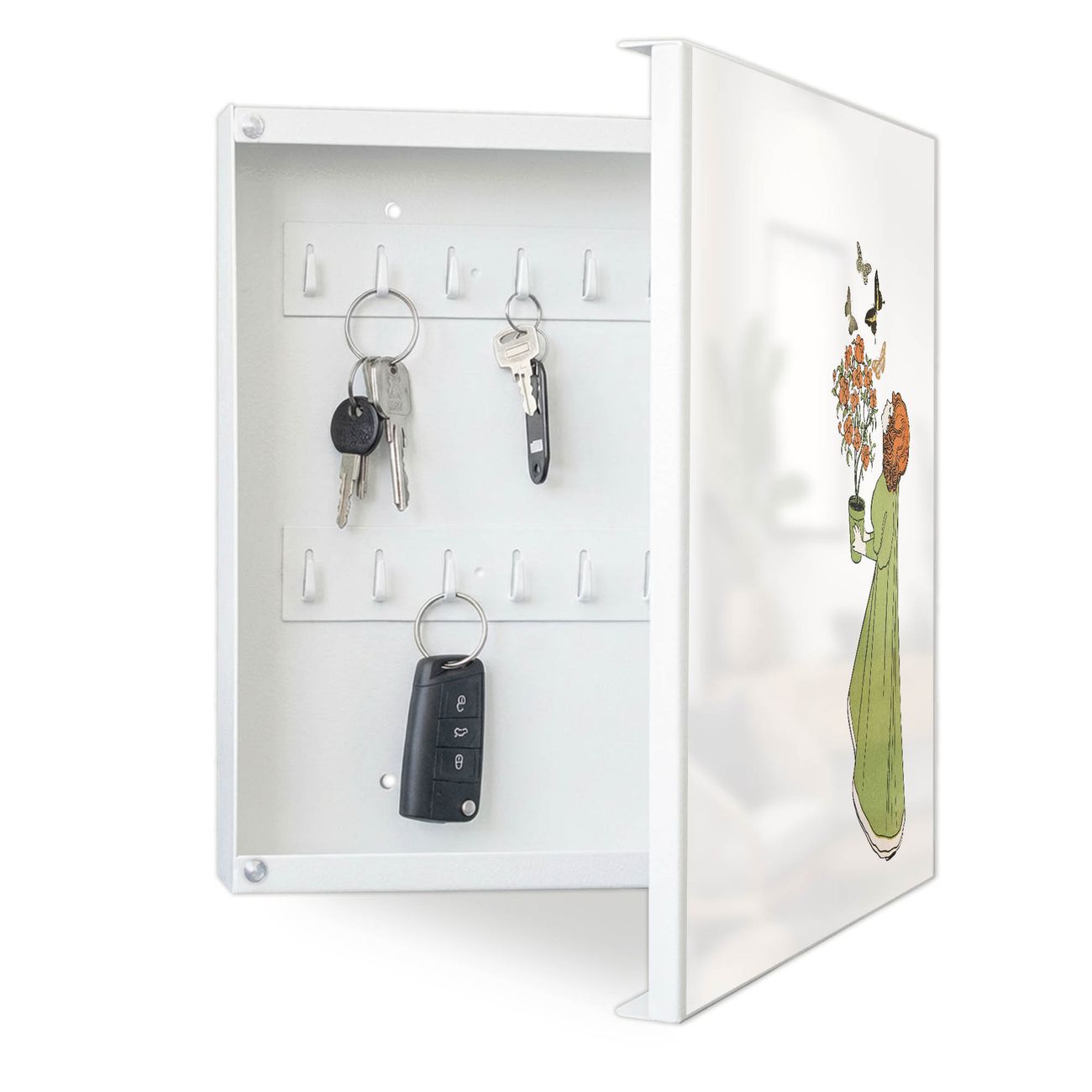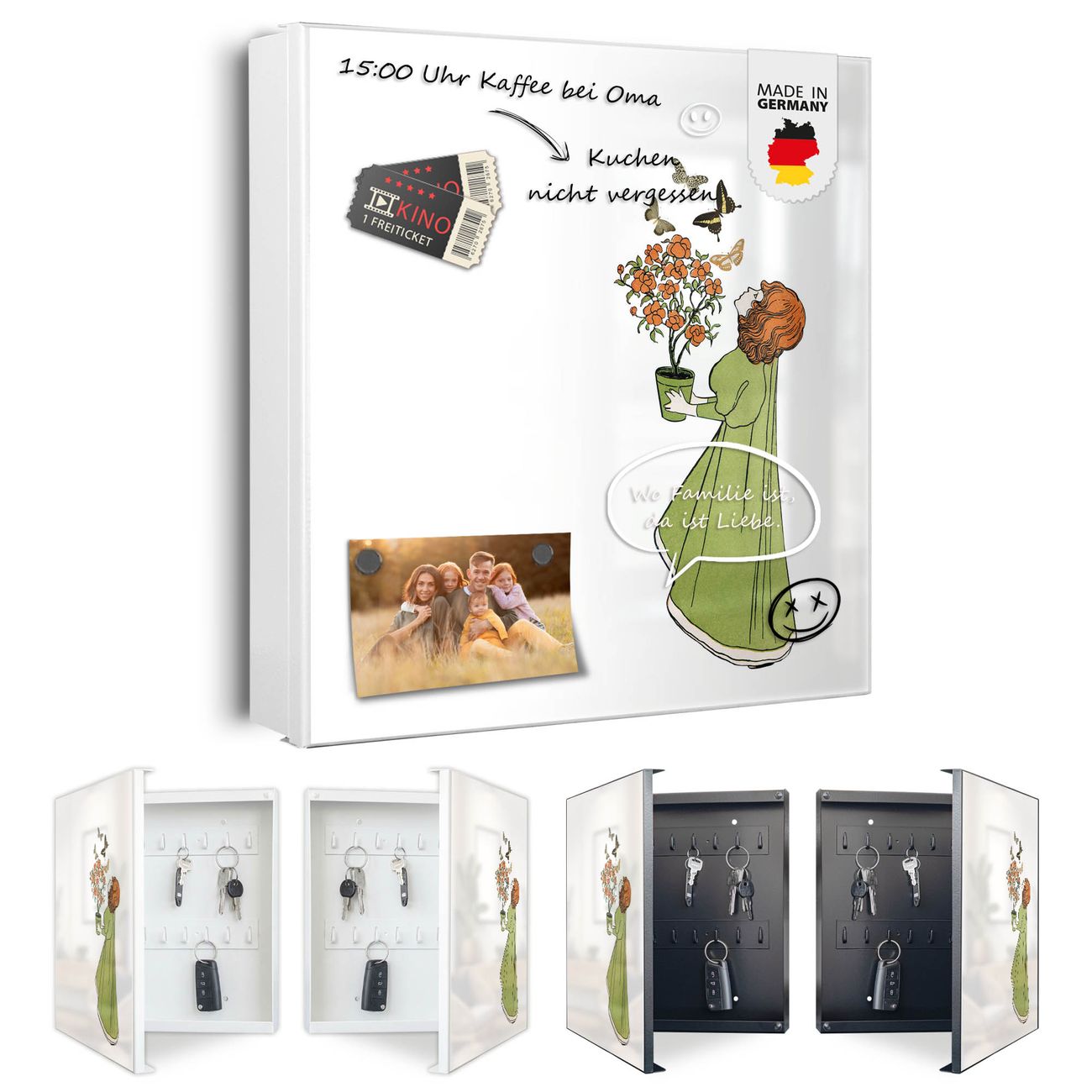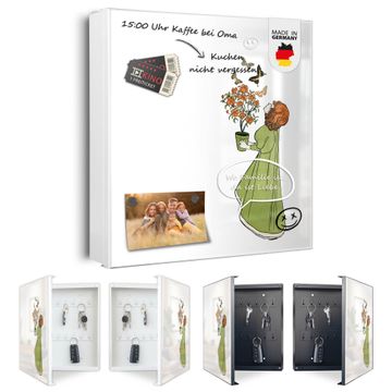 Bringe Ordnung und Eleganz in deinen Eingangsbereich mit dem banjado Schlüsselkasten Motiv Motiv Mädchen mit Blumentopf Vintage. Die moderne Schlüsselbox kombiniert funktionales Design mit hochwertiger Verarbeitung und wird so zu einem echten Hingucker in Flur, Büro oder Ferienwohnung. ✅ Stilvolle Schlüsselaufbewahrung mit Motiv Motiv Mädchen mit Blumentopf Vintage Der Design-Schlüsselkasten Motiv Motiv Mädchen mit Blumentopf Vintage bietet Platz für bis zu 32 Schlüssel, die auf 4 stabilen Reihen mit je 8 Haken übersichtlich verstaut werden. Mit seinen kompakten Maßen von 30 x 30 x 5 cm passt die Schlüsselbox perfekt auch in kleinere Räume. Der weiß lackierte Stahlkorpus mit rechts angeschlagenem Türscharnier harmoniert mit gedruckten Folie auf der Front und fügt sich nahtlos in jedes Wohnambiente ein. Ob als Schlüsselorganizer für Zuhause oder als praktische Lösung für Büros, Praxen und Gewerbe, der banjado Schlüsselkasten sorgt für Ordnung und Übersicht. Dank der magnetischen, mit Kreidestiften beschreibbaren Folie auf der Front kannst du Notizen anheften oder Termine direkt auf der Oberfläche festhalten. Die Schlüsselbox Motiv Motiv Mädchen mit Blumentopf Vintage zur Wandmontage wird inklusive Befestigungsmaterial geliefert und ist schnell angebracht. So hast du deine Schlüssel jederzeit griffbereit und zugleich stilvoll verstaut. Mit diesem banjado Schlüsselkasten Motiv Motiv Mädchen mit Blumentopf Vintage kombinierst du praktische Aufbewahrung mit stilvollem Wohndesign. Ob privat oder geschäftlich, die Schlüsselbox sorgt für mehr Ordnung, Übersicht und ein wohnliches Ambiente.Vorteile im Überblick