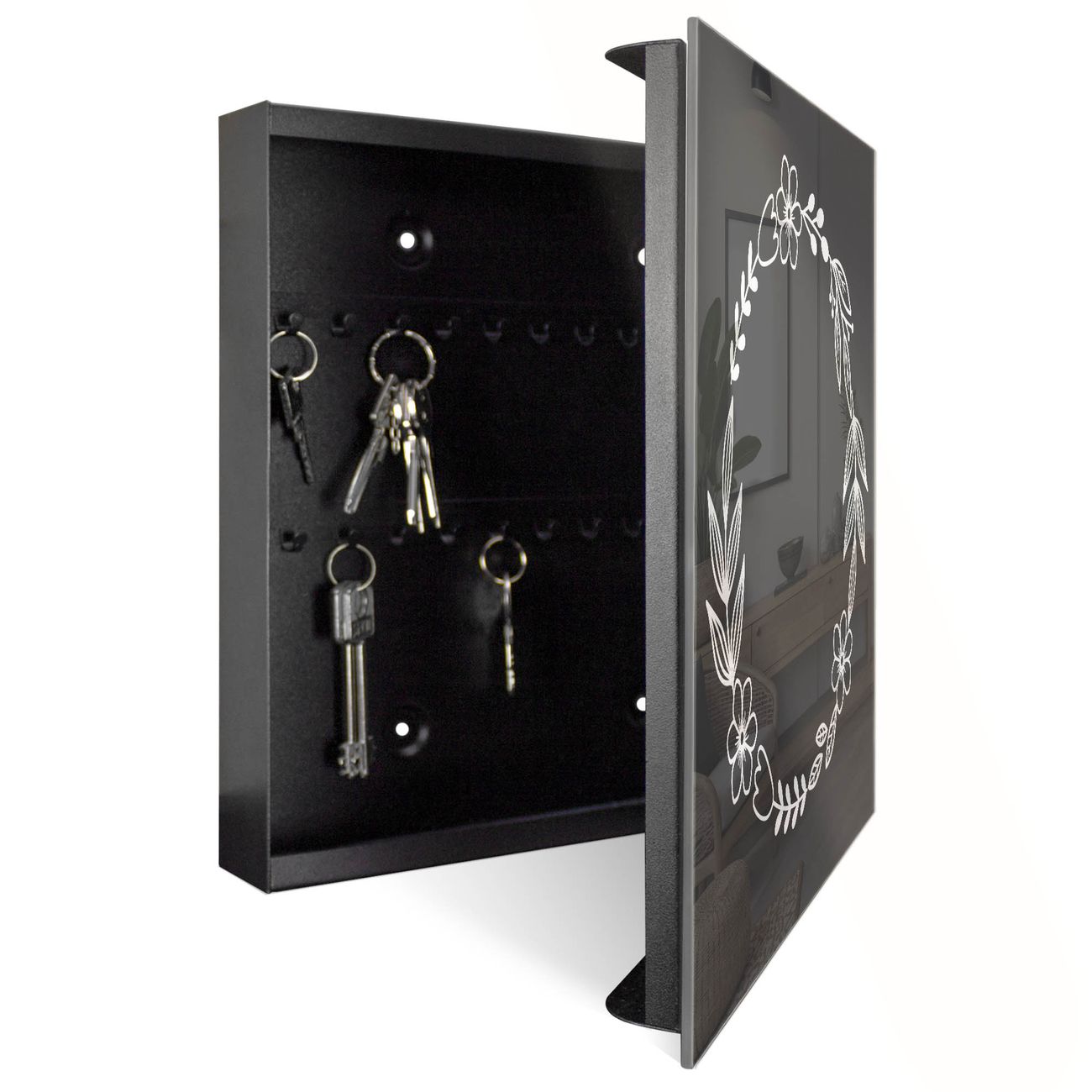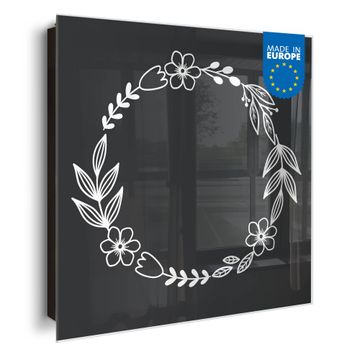 Bringe Ordnung und Eleganz in deinen Eingangsbereich mit dem banjado Schlüsselkasten Motiv Motiv Blütenkranz. Die moderne Schlüsselbox kombiniert funktionales Design mit hochwertiger Verarbeitung und wird so zu einem echten Hingucker in Flur, Büro oder Ferienwohnung. ✅ Stilvolle Schlüsselaufbewahrung mit Glasfront im Motiv Motiv Blütenkranz Der Design-Schlüsselkasten Motiv Motiv Blütenkranz bietet Platz für bis zu 50 Schlüssel, die auf 5 stabilen Reihen mit je 10 Haken übersichtlich verstaut werden. Mit seinen kompakten Maßen von 30 x 30 x 5 cm passt die Schlüsselbox perfekt auch in kleinere Räume. Der schwarz lackierte Stahlkorpus mit rechts angeschlagenem Türscharnier harmoniert mit der Glasfront und fügt sich nahtlos in jedes Wohnambiente ein. Ob als Schlüsselorganizer für Zuhause oder als praktische Lösung für Büros, Praxen und Gewerbe, der banjado Schlüsselkasten sorgt für Ordnung und Übersicht. Dank der magnetischen, mit Kreidestiften beschreibbaren Glasfront kannst du Notizen anheften oder Termine direkt auf der Oberfläche festhalten. Die Schlüsselbox Motiv Motiv Blütenkranz zur Wandmontage wird inklusive Befestigungsmaterial geliefert und ist schnell angebracht. So hast du deine Schlüssel jederzeit griffbereit und zugleich stilvoll verstaut. Mit diesem banjado Schlüsselkasten Motiv Motiv Blütenkranz kombinierst du praktische Aufbewahrung mit stilvollem Wohndesign. Ob privat oder geschäftlich, die Schlüsselbox sorgt für mehr Ordnung, Übersicht und ein wohnliches Ambiente.Vorteile im Überblick