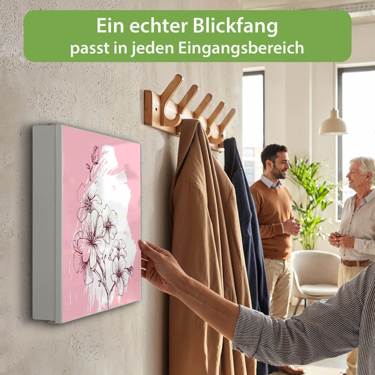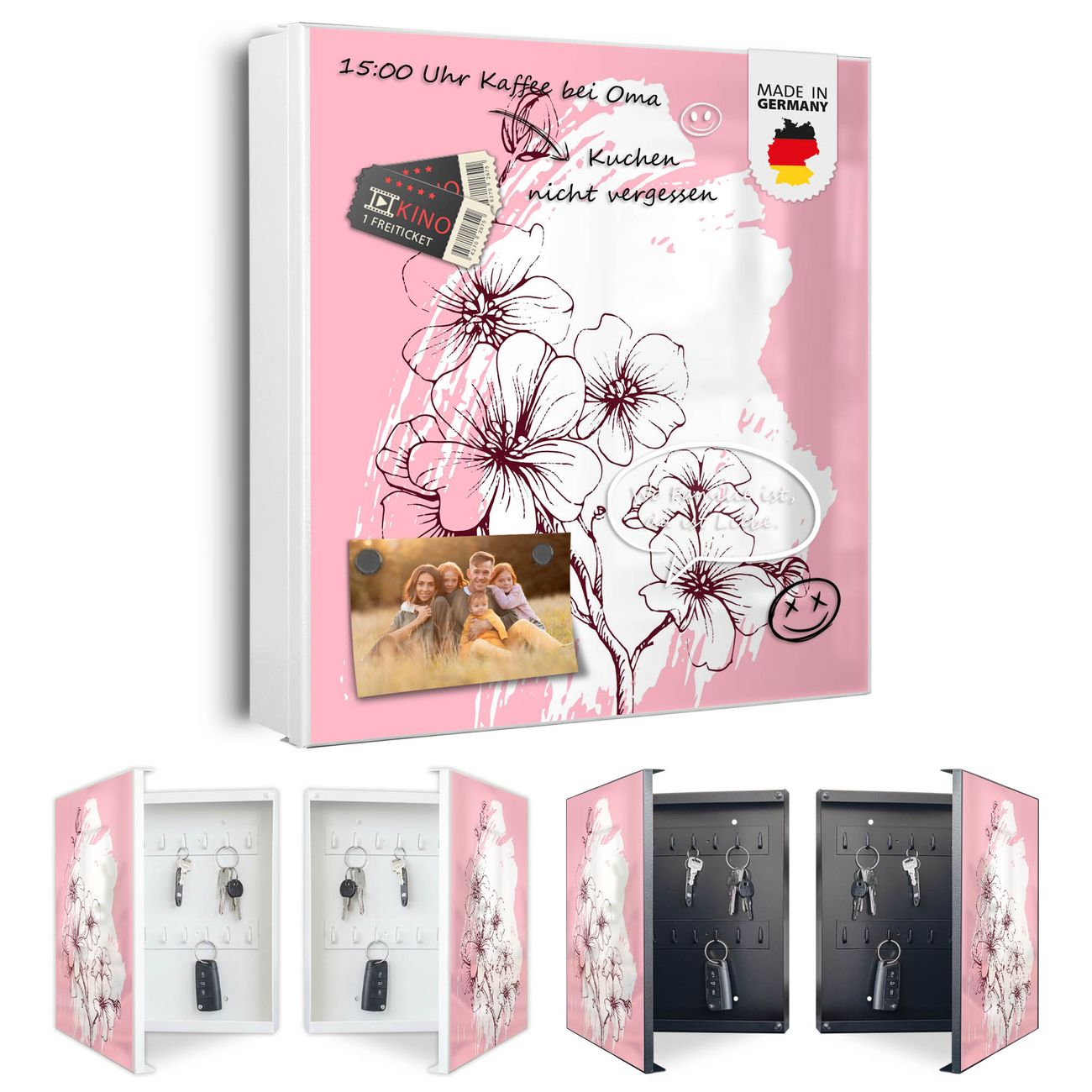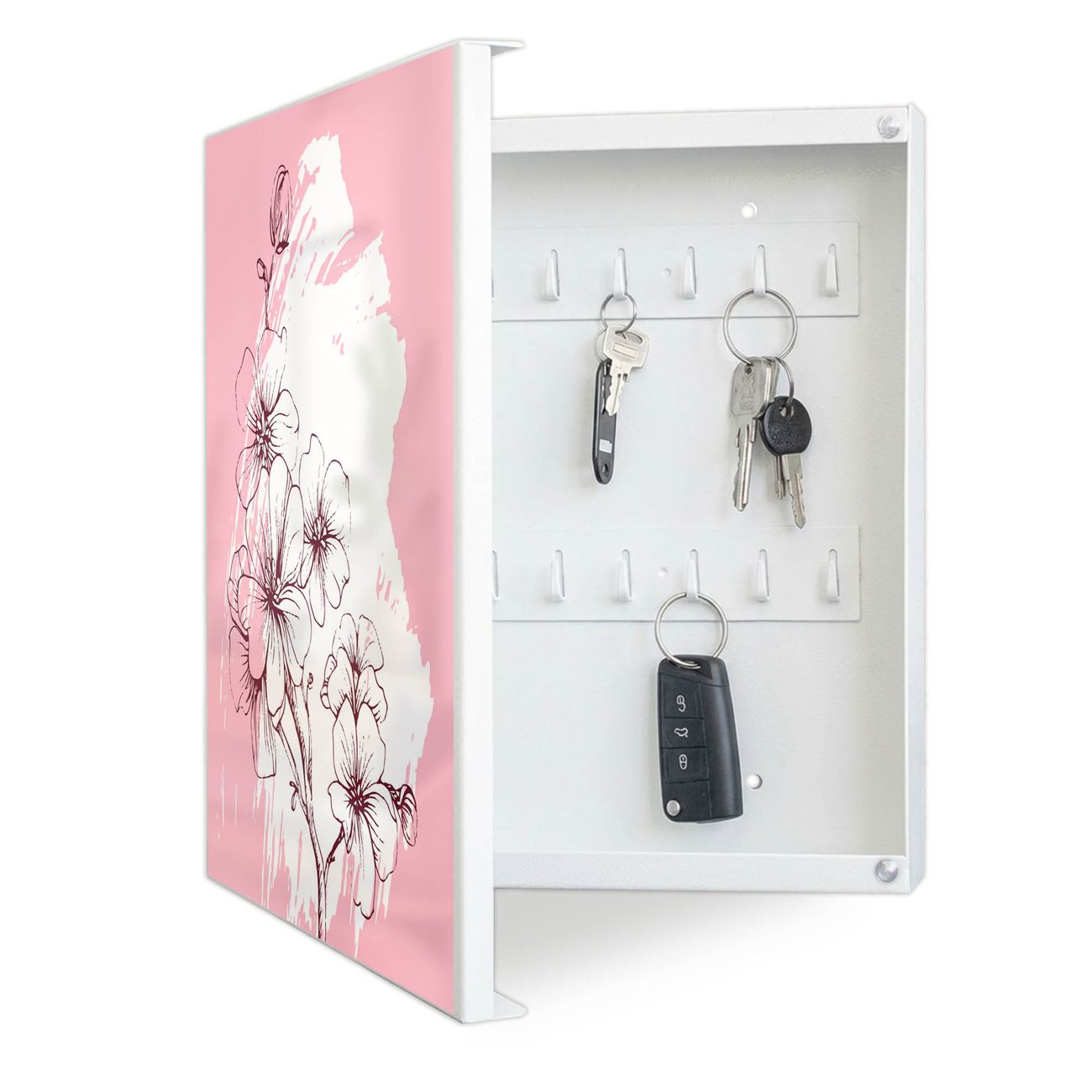 Bringe Ordnung und Eleganz in deinen Eingangsbereich mit dem banjado Schlüsselkasten Motiv Motiv Blütenpracht. Die moderne Schlüsselbox kombiniert funktionales Design mit hochwertiger Verarbeitung und wird so zu einem echten Hingucker in Flur, Büro oder Ferienwohnung. ✅ Stilvolle Schlüsselaufbewahrung mit Motiv Motiv Blütenpracht Der Design-Schlüsselkasten Motiv Motiv Blütenpracht bietet Platz für bis zu 32 Schlüssel, die auf 4 stabilen Reihen mit je 8 Haken übersichtlich verstaut werden. Mit seinen kompakten Maßen von 30 x 30 x 5 cm passt die Schlüsselbox perfekt auch in kleinere Räume. Der weiß lackierte Stahlkorpus mit links angeschlagenem Türscharnier harmoniert mit gedruckten Folie auf der Front und fügt sich nahtlos in jedes Wohnambiente ein. Ob als Schlüsselorganizer für Zuhause oder als praktische Lösung für Büros, Praxen und Gewerbe, der banjado Schlüsselkasten sorgt für Ordnung und Übersicht. Dank der magnetischen, mit Kreidestiften beschreibbaren Folie auf der Front kannst du Notizen anheften oder Termine direkt auf der Oberfläche festhalten. Die Schlüsselbox Motiv Motiv Blütenpracht zur Wandmontage wird inklusive Befestigungsmaterial geliefert und ist schnell angebracht. So hast du deine Schlüssel jederzeit griffbereit und zugleich stilvoll verstaut. Mit diesem banjado Schlüsselkasten Motiv Motiv Blütenpracht kombinierst du praktische Aufbewahrung mit stilvollem Wohndesign. Ob privat oder geschäftlich, die Schlüsselbox sorgt für mehr Ordnung, Übersicht und ein wohnliches Ambiente.Vorteile im Überblick