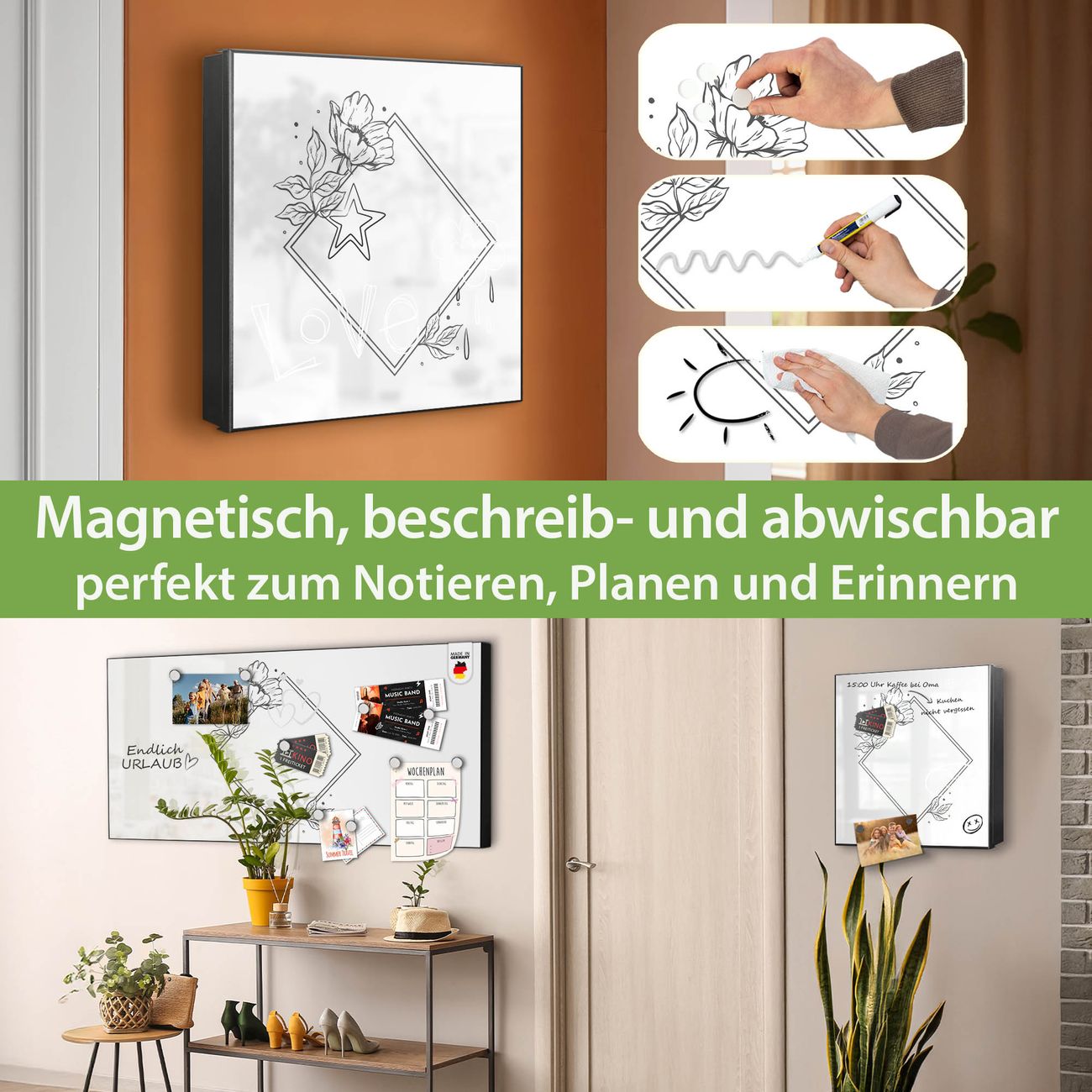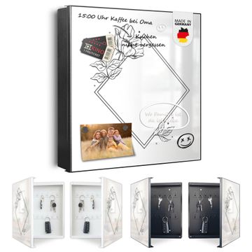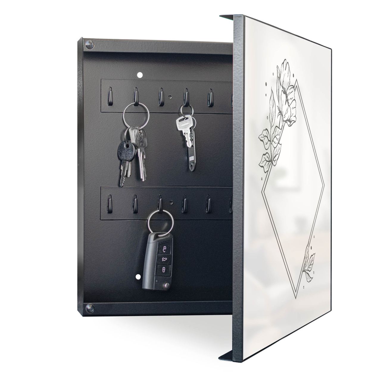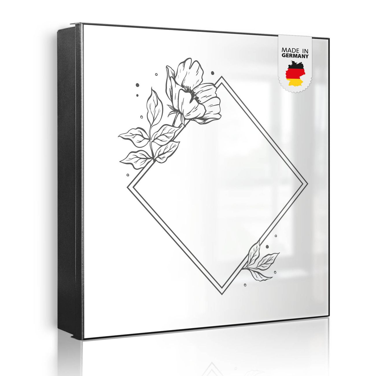 Bringe Ordnung und Eleganz in deinen Eingangsbereich mit dem banjado Schlüsselkasten Motiv Motiv Blütenrahmen. Die moderne Schlüsselbox kombiniert funktionales Design mit hochwertiger Verarbeitung und wird so zu einem echten Hingucker in Flur, Büro oder Ferienwohnung. ✅ Stilvolle Schlüsselaufbewahrung mit Motiv Motiv Blütenrahmen Der Design-Schlüsselkasten Motiv Motiv Blütenrahmen bietet Platz für bis zu 32 Schlüssel, die auf 4 stabilen Reihen mit je 8 Haken übersichtlich verstaut werden. Mit seinen kompakten Maßen von 30 x 30 x 5 cm passt die Schlüsselbox perfekt auch in kleinere Räume. Der schwarz lackierte Stahlkorpus mit rechts angeschlagenem Türscharnier harmoniert mit gedruckten Folie auf der Front und fügt sich nahtlos in jedes Wohnambiente ein. Ob als Schlüsselorganizer für Zuhause oder als praktische Lösung für Büros, Praxen und Gewerbe, der banjado Schlüsselkasten sorgt für Ordnung und Übersicht. Dank der magnetischen, mit Kreidestiften beschreibbaren Folie auf der Front kannst du Notizen anheften oder Termine direkt auf der Oberfläche festhalten. Die Schlüsselbox Motiv Motiv Blütenrahmen zur Wandmontage wird inklusive Befestigungsmaterial geliefert und ist schnell angebracht. So hast du deine Schlüssel jederzeit griffbereit und zugleich stilvoll verstaut. Mit diesem banjado Schlüsselkasten Motiv Motiv Blütenrahmen kombinierst du praktische Aufbewahrung mit stilvollem Wohndesign. Ob privat oder geschäftlich, die Schlüsselbox sorgt für mehr Ordnung, Übersicht und ein wohnliches Ambiente.Vorteile im Überblick