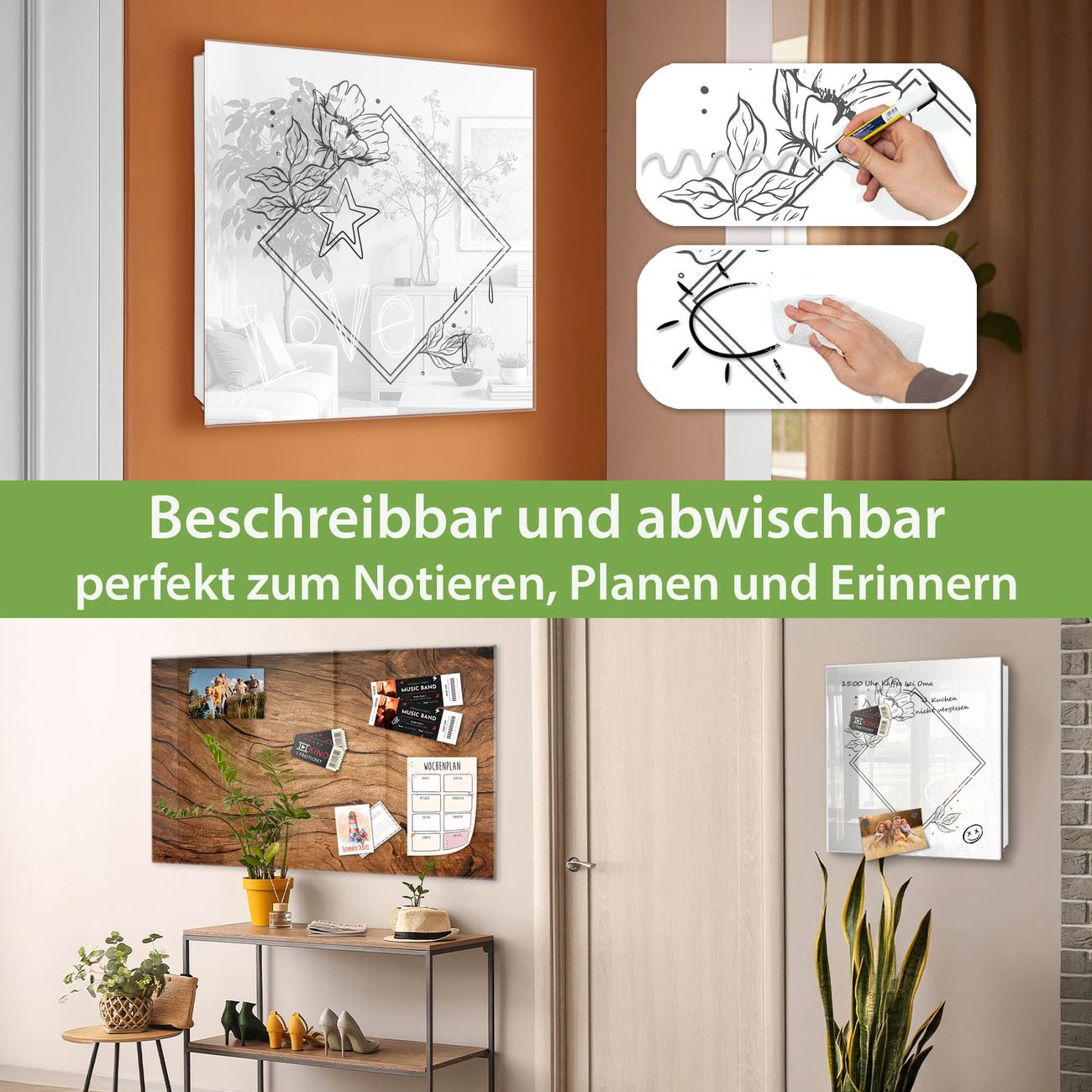 ✅ Magnetisch und mit Kreidestift beschreibbar, gehärtetes Glas, rechts angeschlagene TürOrdnung und Design in einem