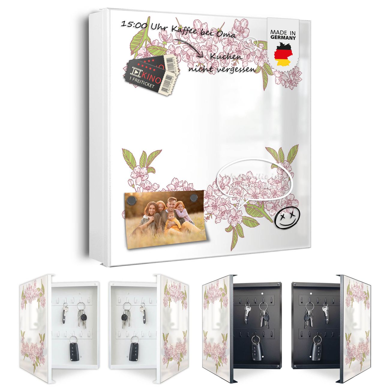 Bringe Ordnung und Eleganz in deinen Eingangsbereich mit dem banjado Schlüsselkasten Motiv Motiv Blütenzauber 2. Die moderne Schlüsselbox kombiniert funktionales Design mit hochwertiger Verarbeitung und wird so zu einem echten Hingucker in Flur, Büro oder Ferienwohnung. ✅ Stilvolle Schlüsselaufbewahrung mit Motiv Motiv Blütenzauber 2 Der Design-Schlüsselkasten Motiv Motiv Blütenzauber 2 bietet Platz für bis zu 32 Schlüssel, die auf 4 stabilen Reihen mit je 8 Haken übersichtlich verstaut werden. Mit seinen kompakten Maßen von 30 x 30 x 5 cm passt die Schlüsselbox perfekt auch in kleinere Räume. Der weiß lackierte Stahlkorpus mit links angeschlagenem Türscharnier harmoniert mit gedruckten Folie auf der Front und fügt sich nahtlos in jedes Wohnambiente ein. Ob als Schlüsselorganizer für Zuhause oder als praktische Lösung für Büros, Praxen und Gewerbe, der banjado Schlüsselkasten sorgt für Ordnung und Übersicht. Dank der magnetischen, mit Kreidestiften beschreibbaren Folie auf der Front kannst du Notizen anheften oder Termine direkt auf der Oberfläche festhalten. Die Schlüsselbox Motiv Motiv Blütenzauber 2 zur Wandmontage wird inklusive Befestigungsmaterial geliefert und ist schnell angebracht. So hast du deine Schlüssel jederzeit griffbereit und zugleich stilvoll verstaut. Mit diesem banjado Schlüsselkasten Motiv Motiv Blütenzauber 2 kombinierst du praktische Aufbewahrung mit stilvollem Wohndesign. Ob privat oder geschäftlich, die Schlüsselbox sorgt für mehr Ordnung, Übersicht und ein wohnliches Ambiente.Vorteile im Überblick