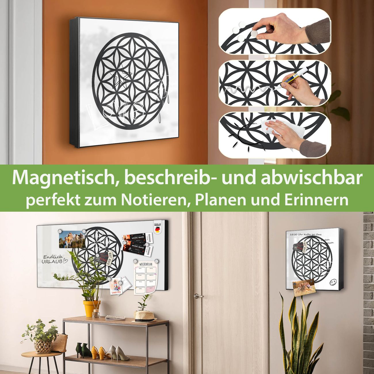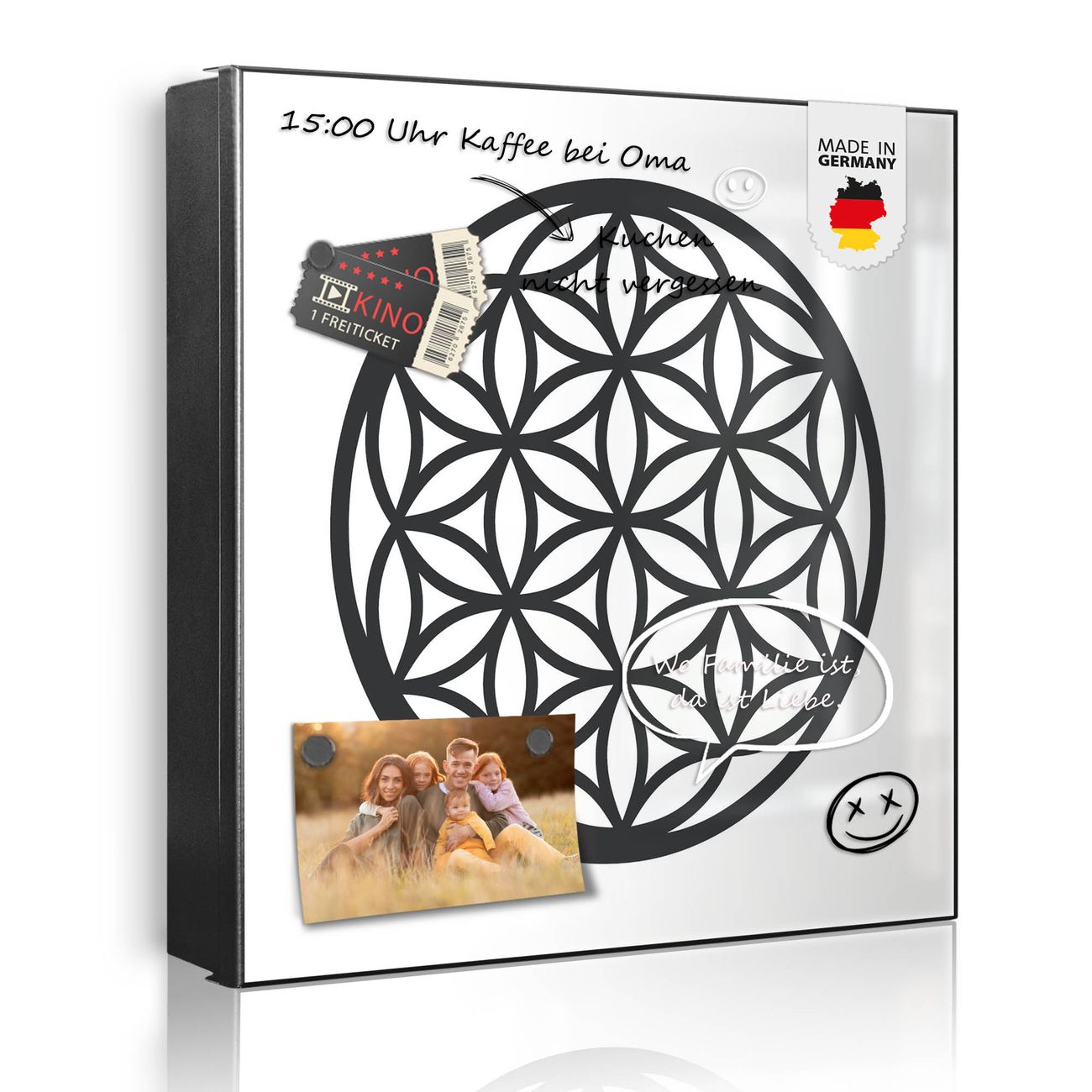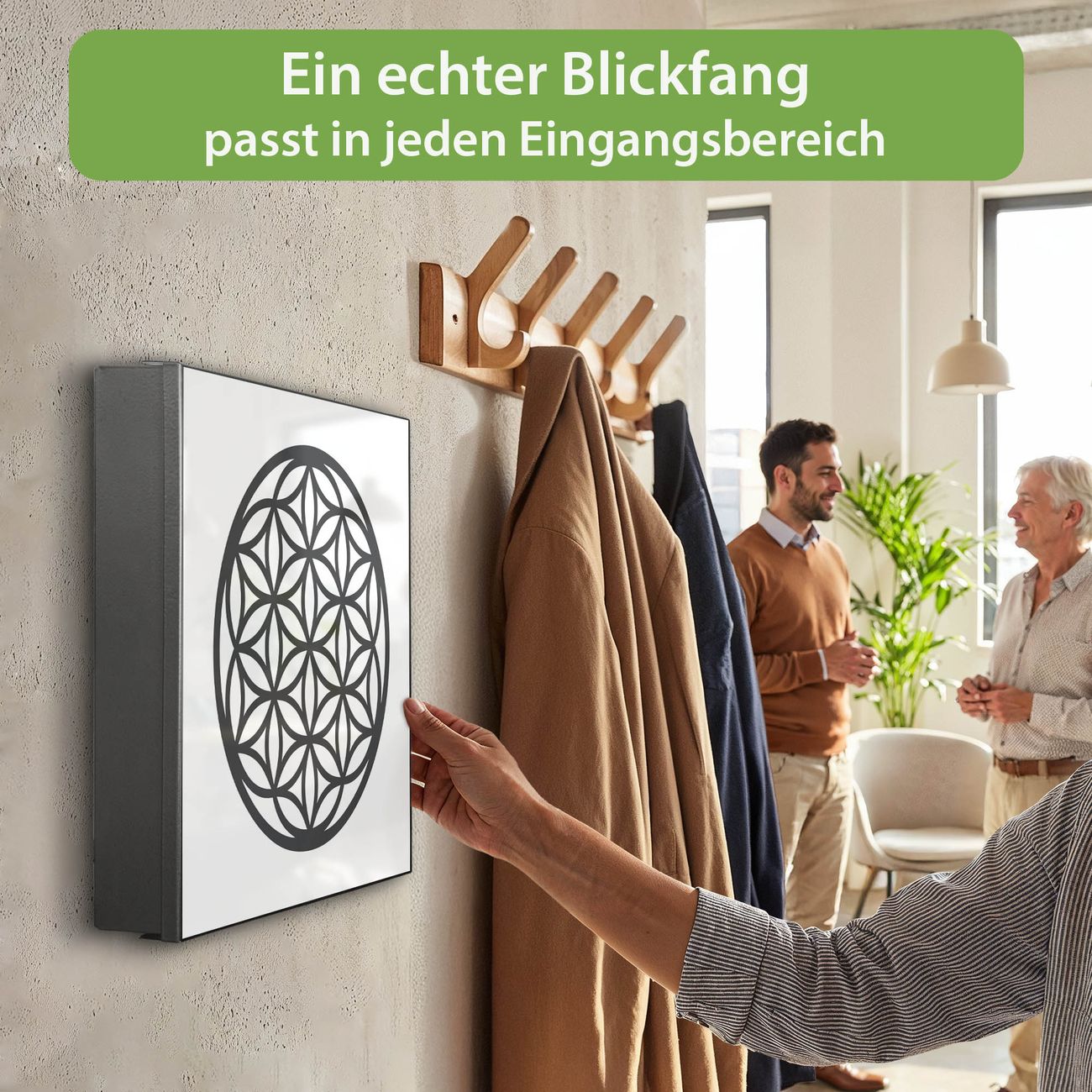 Bringe Ordnung und Eleganz in deinen Eingangsbereich mit dem banjado Schlüsselkasten Motiv Motiv Blume des Lebens Muster. Die moderne Schlüsselbox kombiniert funktionales Design mit hochwertiger Verarbeitung und wird so zu einem echten Hingucker in Flur, Büro oder Ferienwohnung. ✅ Stilvolle Schlüsselaufbewahrung mit Motiv Motiv Blume des Lebens Muster Der Design-Schlüsselkasten Motiv Motiv Blume des Lebens Muster bietet Platz für bis zu 32 Schlüssel, die auf 4 stabilen Reihen mit je 8 Haken übersichtlich verstaut werden. Mit seinen kompakten Maßen von 30 x 30 x 5 cm passt die Schlüsselbox perfekt auch in kleinere Räume. Der schwarz lackierte Stahlkorpus mit links angeschlagenem Türscharnier harmoniert mit gedruckten Folie auf der Front und fügt sich nahtlos in jedes Wohnambiente ein. Ob als Schlüsselorganizer für Zuhause oder als praktische Lösung für Büros, Praxen und Gewerbe, der banjado Schlüsselkasten sorgt für Ordnung und Übersicht. Dank der magnetischen, mit Kreidestiften beschreibbaren Folie auf der Front kannst du Notizen anheften oder Termine direkt auf der Oberfläche festhalten. Die Schlüsselbox Motiv Motiv Blume des Lebens Muster zur Wandmontage wird inklusive Befestigungsmaterial geliefert und ist schnell angebracht. So hast du deine Schlüssel jederzeit griffbereit und zugleich stilvoll verstaut. Mit diesem banjado Schlüsselkasten Motiv Motiv Blume des Lebens Muster kombinierst du praktische Aufbewahrung mit stilvollem Wohndesign. Ob privat oder geschäftlich, die Schlüsselbox sorgt für mehr Ordnung, Übersicht und ein wohnliches Ambiente.Vorteile im Überblick