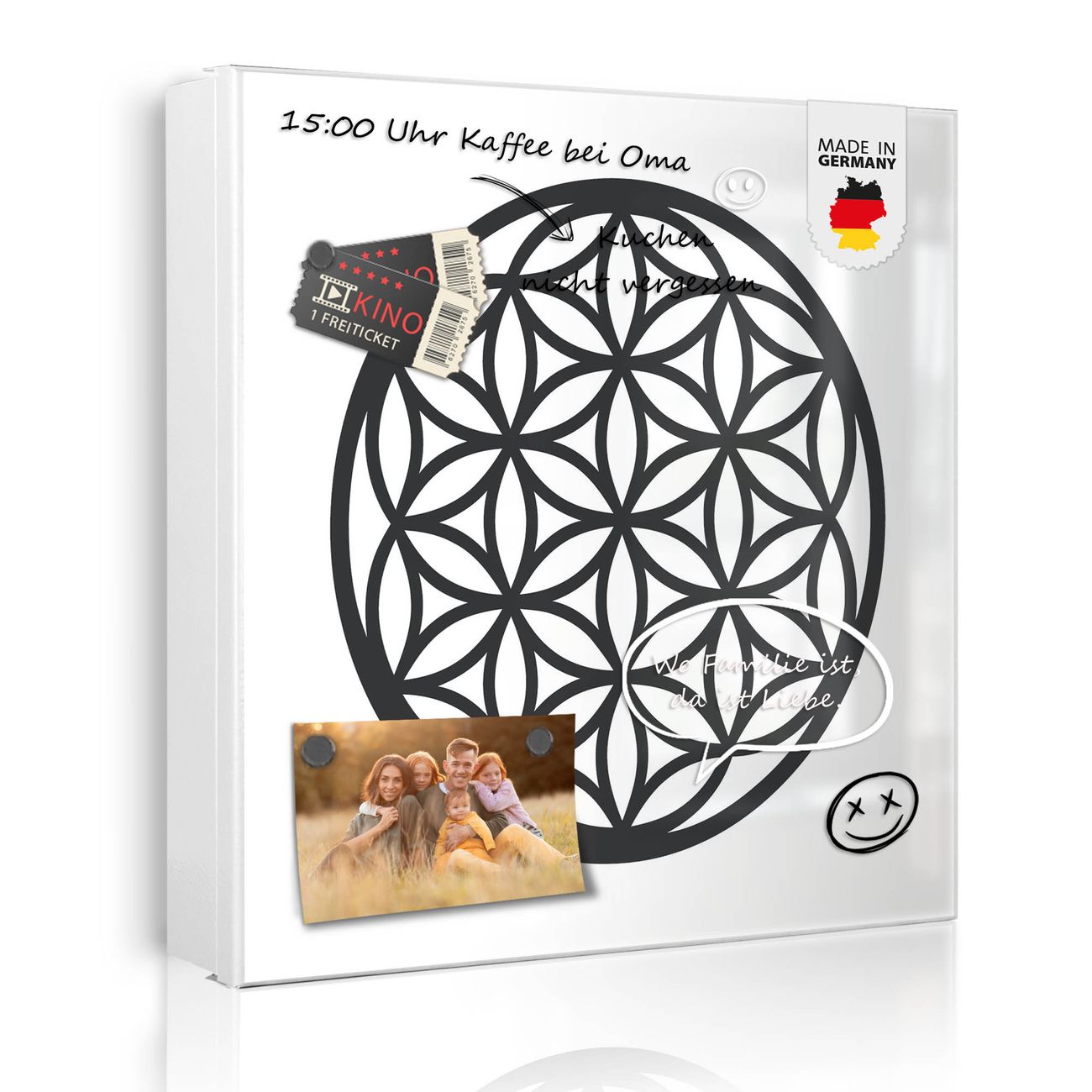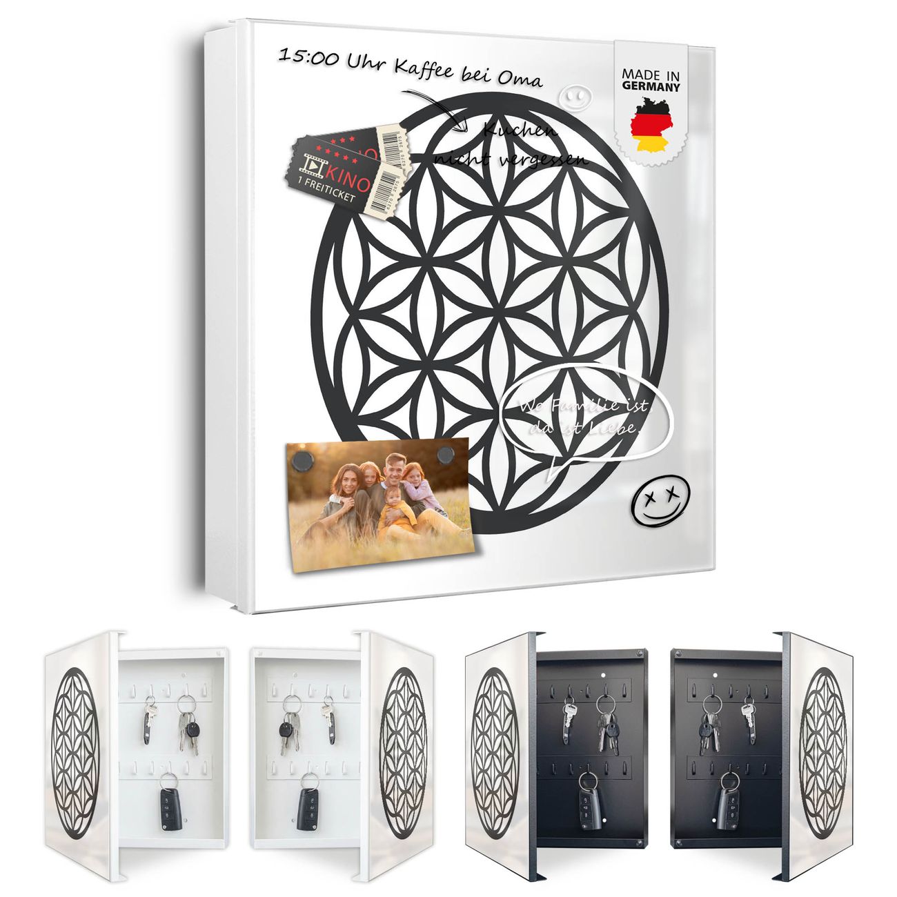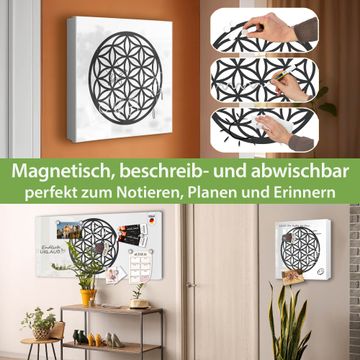 Bringe Ordnung und Eleganz in deinen Eingangsbereich mit dem banjado Schlüsselkasten Motiv Motiv Blume des Lebens Muster. Die moderne Schlüsselbox kombiniert funktionales Design mit hochwertiger Verarbeitung und wird so zu einem echten Hingucker in Flur, Büro oder Ferienwohnung. ✅ Stilvolle Schlüsselaufbewahrung mit Motiv Motiv Blume des Lebens Muster Der Design-Schlüsselkasten Motiv Motiv Blume des Lebens Muster bietet Platz für bis zu 32 Schlüssel, die auf 4 stabilen Reihen mit je 8 Haken übersichtlich verstaut werden. Mit seinen kompakten Maßen von 30 x 30 x 5 cm passt die Schlüsselbox perfekt auch in kleinere Räume. Der weiß lackierte Stahlkorpus mit rechts angeschlagenem Türscharnier harmoniert mit gedruckten Folie auf der Front und fügt sich nahtlos in jedes Wohnambiente ein. Ob als Schlüsselorganizer für Zuhause oder als praktische Lösung für Büros, Praxen und Gewerbe, der banjado Schlüsselkasten sorgt für Ordnung und Übersicht. Dank der magnetischen, mit Kreidestiften beschreibbaren Folie auf der Front kannst du Notizen anheften oder Termine direkt auf der Oberfläche festhalten. Die Schlüsselbox Motiv Motiv Blume des Lebens Muster zur Wandmontage wird inklusive Befestigungsmaterial geliefert und ist schnell angebracht. So hast du deine Schlüssel jederzeit griffbereit und zugleich stilvoll verstaut. Mit diesem banjado Schlüsselkasten Motiv Motiv Blume des Lebens Muster kombinierst du praktische Aufbewahrung mit stilvollem Wohndesign. Ob privat oder geschäftlich, die Schlüsselbox sorgt für mehr Ordnung, Übersicht und ein wohnliches Ambiente.Vorteile im Überblick