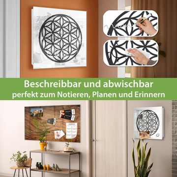 Bringe Ordnung und Eleganz in deinen Eingangsbereich mit dem banjado Schlüsselkasten Motiv Motiv Blume des Lebens Muster. Die moderne Schlüsselbox kombiniert funktionales Design mit hochwertiger Verarbeitung und wird so zu einem echten Hingucker in Flur, Büro oder Ferienwohnung. ✅ Stilvolle Schlüsselaufbewahrung mit Glasfront im Motiv Motiv Blume des Lebens Muster Der Design-Schlüsselkasten Motiv Motiv Blume des Lebens Muster bietet Platz für bis zu 50 Schlüssel, die auf 5 stabilen Reihen mit je 10 Haken übersichtlich verstaut werden. Mit seinen kompakten Maßen von 30 x 30 x 5 cm passt die Schlüsselbox perfekt auch in kleinere Räume. Der weiß lackierte Stahlkorpus mit rechts angeschlagenem Türscharnier harmoniert mit der Glasfront und fügt sich nahtlos in jedes Wohnambiente ein. Ob als Schlüsselorganizer für Zuhause oder als praktische Lösung für Büros, Praxen und Gewerbe, der banjado Schlüsselkasten sorgt für Ordnung und Übersicht. Dank der magnetischen, mit Kreidestiften beschreibbaren Glasfront kannst du Notizen anheften oder Termine direkt auf der Oberfläche festhalten. Die Schlüsselbox Motiv Motiv Blume des Lebens Muster zur Wandmontage wird inklusive Befestigungsmaterial geliefert und ist schnell angebracht. So hast du deine Schlüssel jederzeit griffbereit und zugleich stilvoll verstaut. Mit diesem banjado Schlüsselkasten Motiv Motiv Blume des Lebens Muster kombinierst du praktische Aufbewahrung mit stilvollem Wohndesign. Ob privat oder geschäftlich, die Schlüsselbox sorgt für mehr Ordnung, Übersicht und ein wohnliches Ambiente.Vorteile im Überblick