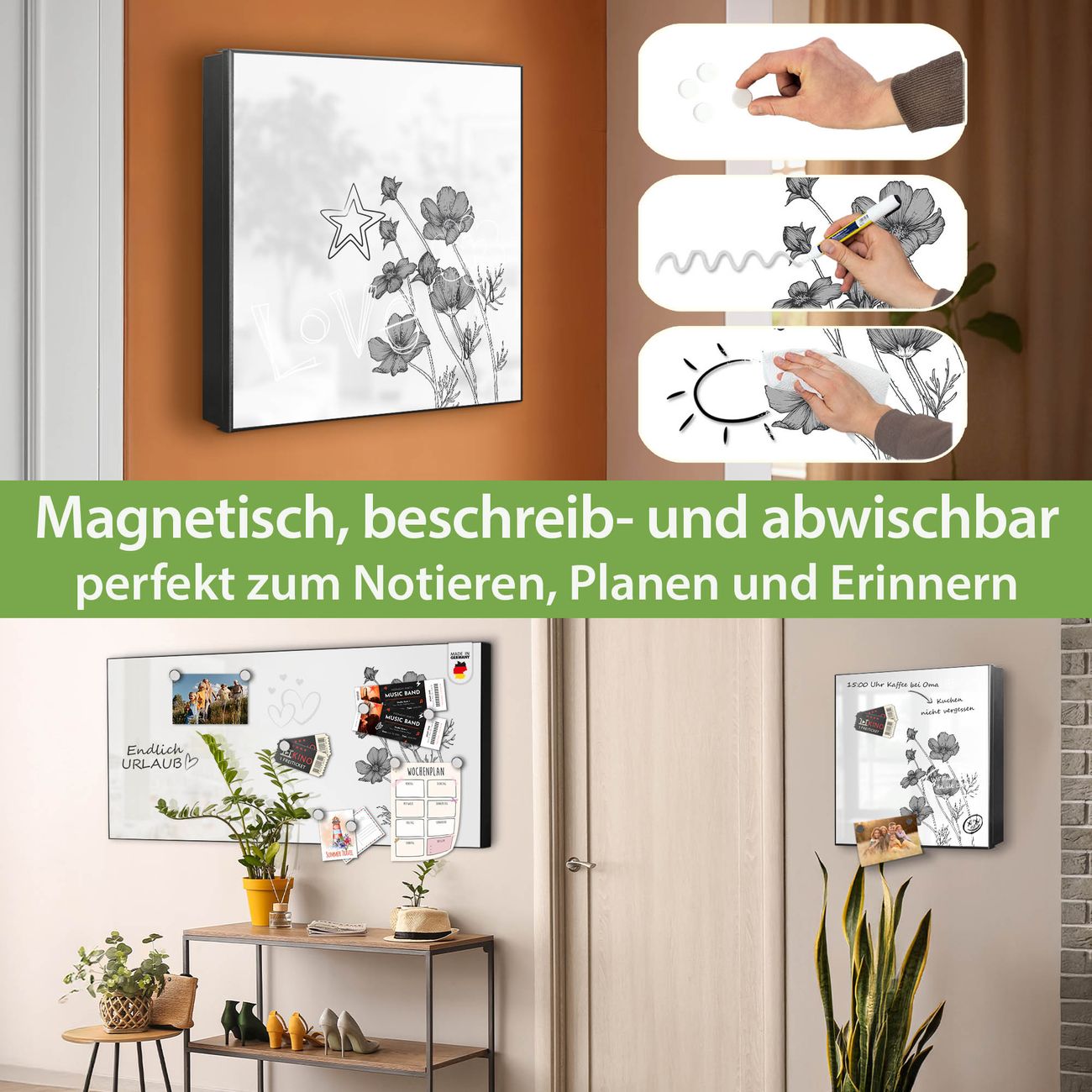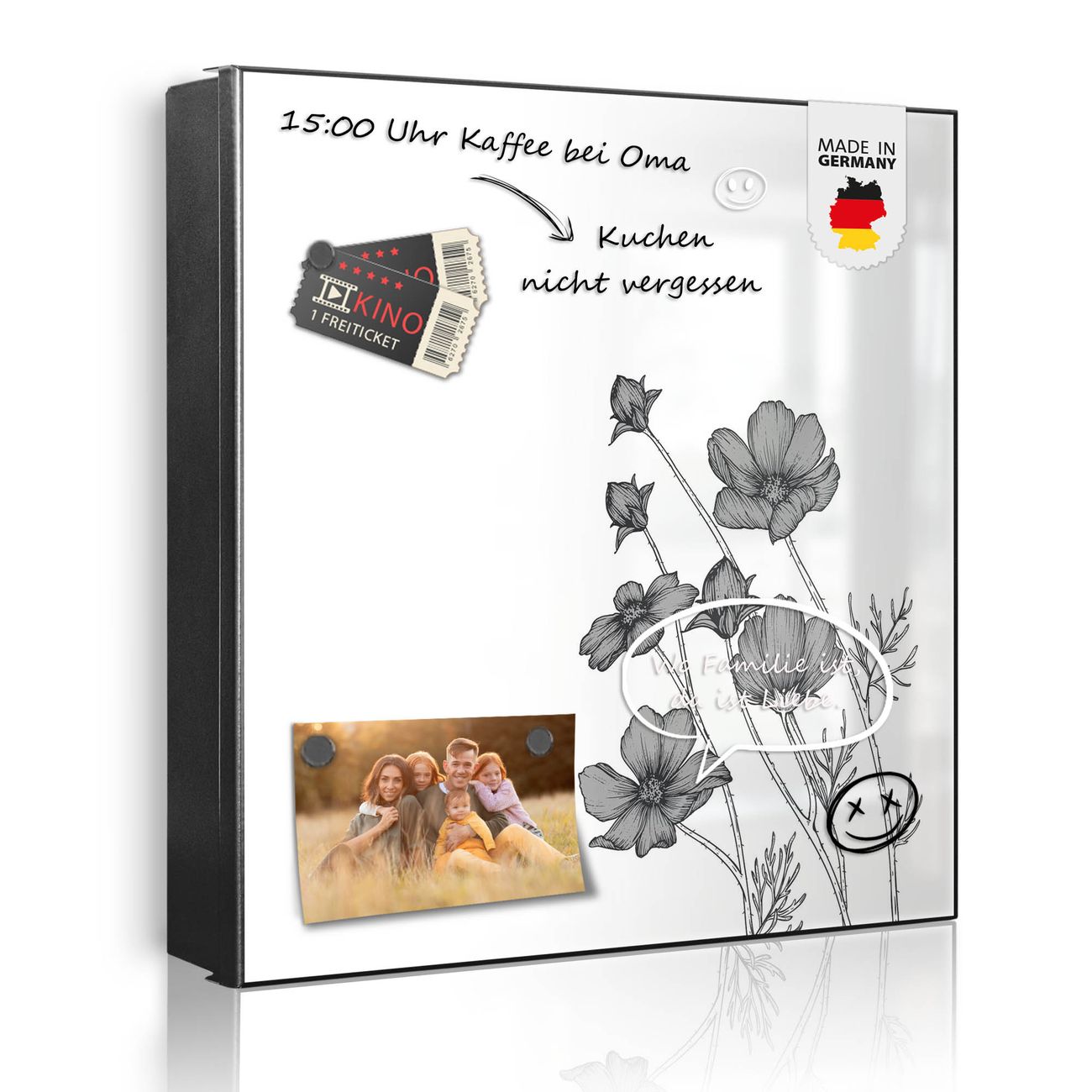 Bringe Ordnung und Eleganz in deinen Eingangsbereich mit dem banjado Schlüsselkasten Motiv Motiv Blumen in Schwarz-Weiß. Die moderne Schlüsselbox kombiniert funktionales Design mit hochwertiger Verarbeitung und wird so zu einem echten Hingucker in Flur, Büro oder Ferienwohnung. ✅ Stilvolle Schlüsselaufbewahrung mit Motiv Motiv Blumen in Schwarz-Weiß Der Design-Schlüsselkasten Motiv Motiv Blumen in Schwarz-Weiß bietet Platz für bis zu 32 Schlüssel, die auf 4 stabilen Reihen mit je 8 Haken übersichtlich verstaut werden. Mit seinen kompakten Maßen von 30 x 30 x 5 cm passt die Schlüsselbox perfekt auch in kleinere Räume. Der schwarz lackierte Stahlkorpus mit links angeschlagenem Türscharnier harmoniert mit gedruckten Folie auf der Front und fügt sich nahtlos in jedes Wohnambiente ein. Ob als Schlüsselorganizer für Zuhause oder als praktische Lösung für Büros, Praxen und Gewerbe, der banjado Schlüsselkasten sorgt für Ordnung und Übersicht. Dank der magnetischen, mit Kreidestiften beschreibbaren Folie auf der Front kannst du Notizen anheften oder Termine direkt auf der Oberfläche festhalten. Die Schlüsselbox Motiv Motiv Blumen in Schwarz-Weiß zur Wandmontage wird inklusive Befestigungsmaterial geliefert und ist schnell angebracht. So hast du deine Schlüssel jederzeit griffbereit und zugleich stilvoll verstaut. Mit diesem banjado Schlüsselkasten Motiv Motiv Blumen in Schwarz-Weiß kombinierst du praktische Aufbewahrung mit stilvollem Wohndesign. Ob privat oder geschäftlich, die Schlüsselbox sorgt für mehr Ordnung, Übersicht und ein wohnliches Ambiente.Vorteile im Überblick