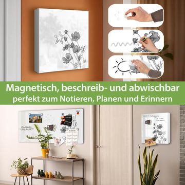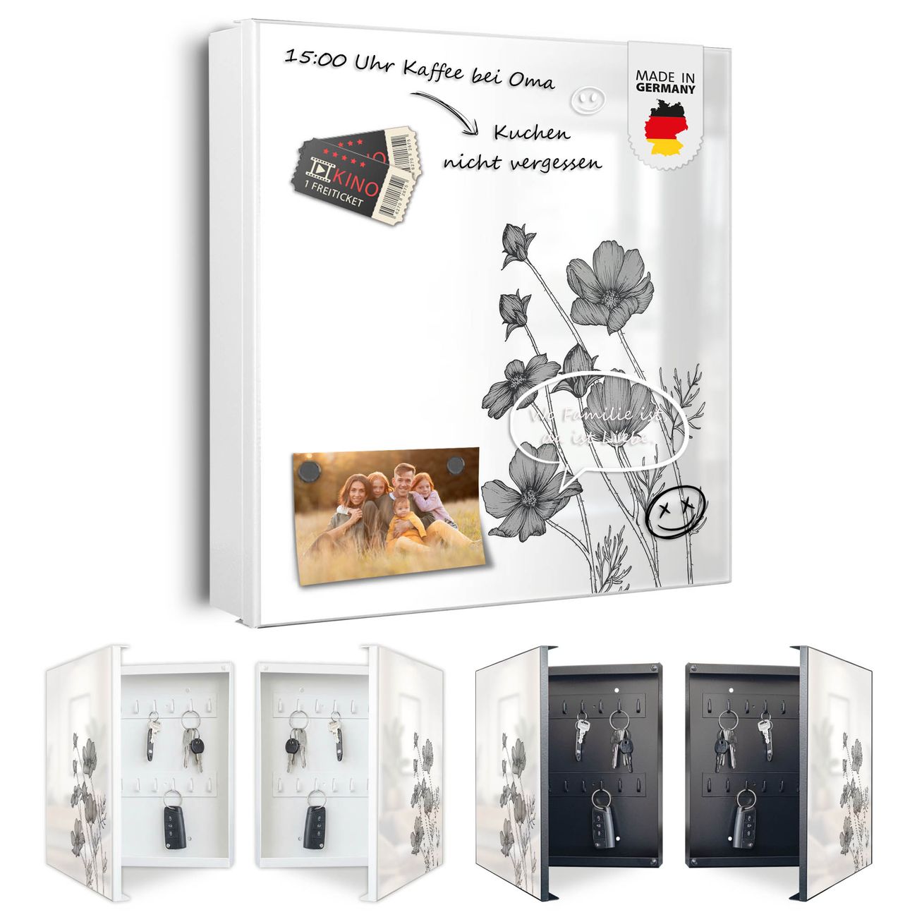 Bringe Ordnung und Eleganz in deinen Eingangsbereich mit dem banjado Schlüsselkasten Motiv Motiv Blumen in Schwarz-Weiß. Die moderne Schlüsselbox kombiniert funktionales Design mit hochwertiger Verarbeitung und wird so zu einem echten Hingucker in Flur, Büro oder Ferienwohnung. ✅ Stilvolle Schlüsselaufbewahrung mit Motiv Motiv Blumen in Schwarz-Weiß Der Design-Schlüsselkasten Motiv Motiv Blumen in Schwarz-Weiß bietet Platz für bis zu 32 Schlüssel, die auf 4 stabilen Reihen mit je 8 Haken übersichtlich verstaut werden. Mit seinen kompakten Maßen von 30 x 30 x 5 cm passt die Schlüsselbox perfekt auch in kleinere Räume. Der weiß lackierte Stahlkorpus mit rechts angeschlagenem Türscharnier harmoniert mit gedruckten Folie auf der Front und fügt sich nahtlos in jedes Wohnambiente ein. Ob als Schlüsselorganizer für Zuhause oder als praktische Lösung für Büros, Praxen und Gewerbe, der banjado Schlüsselkasten sorgt für Ordnung und Übersicht. Dank der magnetischen, mit Kreidestiften beschreibbaren Folie auf der Front kannst du Notizen anheften oder Termine direkt auf der Oberfläche festhalten. Die Schlüsselbox Motiv Motiv Blumen in Schwarz-Weiß zur Wandmontage wird inklusive Befestigungsmaterial geliefert und ist schnell angebracht. So hast du deine Schlüssel jederzeit griffbereit und zugleich stilvoll verstaut. Mit diesem banjado Schlüsselkasten Motiv Motiv Blumen in Schwarz-Weiß kombinierst du praktische Aufbewahrung mit stilvollem Wohndesign. Ob privat oder geschäftlich, die Schlüsselbox sorgt für mehr Ordnung, Übersicht und ein wohnliches Ambiente.Vorteile im Überblick