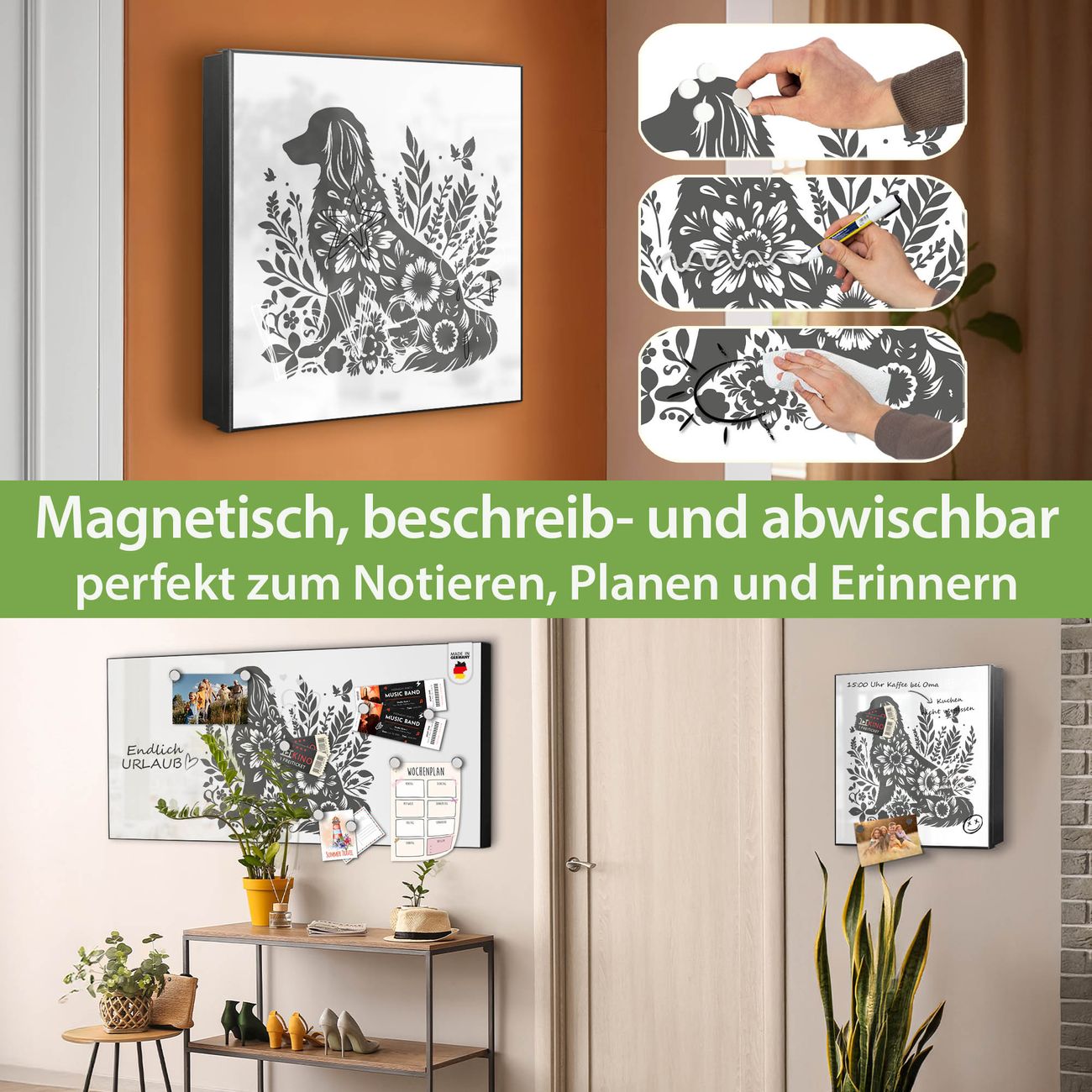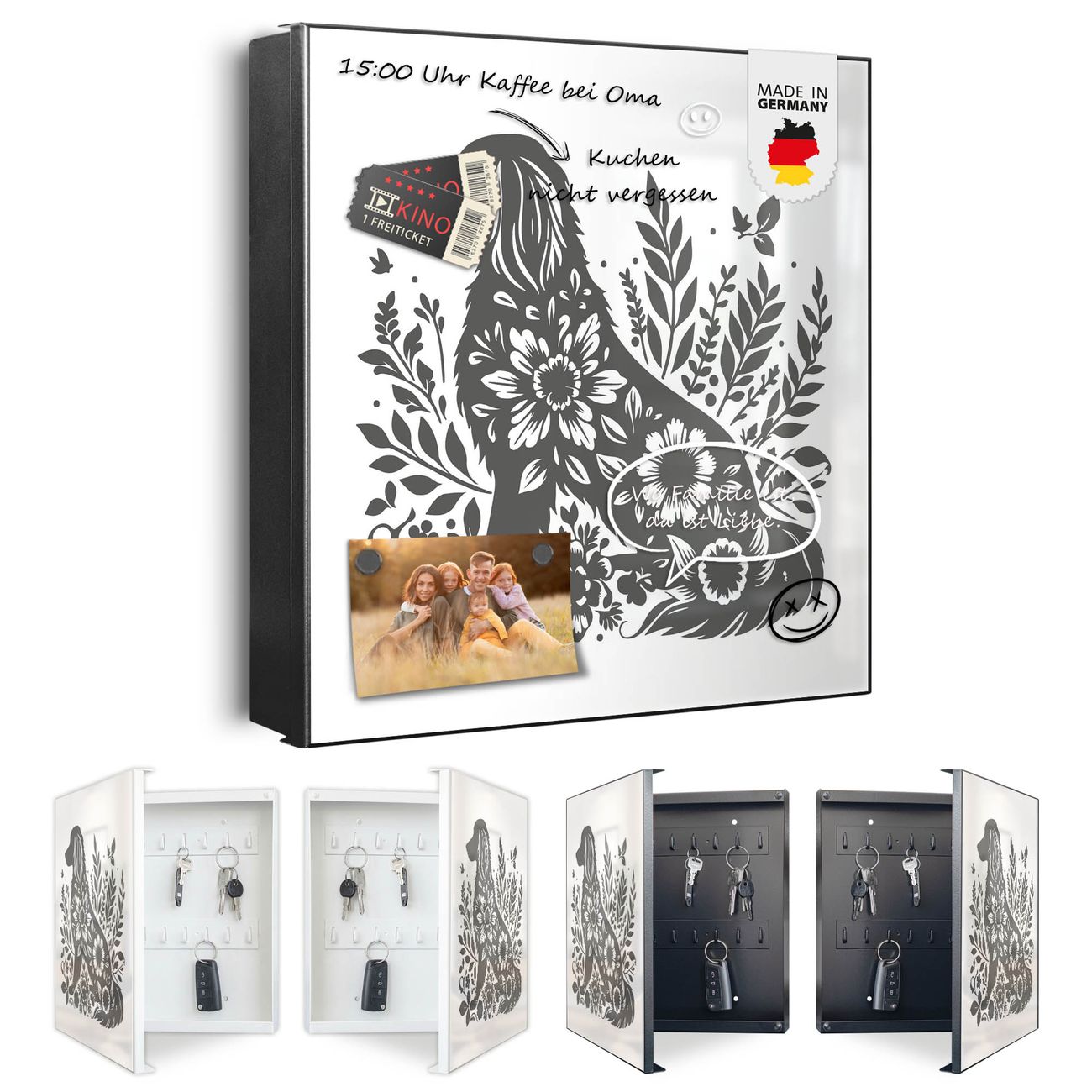 Bringe Ordnung und Eleganz in deinen Eingangsbereich mit dem banjado Schlüsselkasten Motiv Motiv Blumenhund Silhouette. Die moderne Schlüsselbox kombiniert funktionales Design mit hochwertiger Verarbeitung und wird so zu einem echten Hingucker in Flur, Büro oder Ferienwohnung. ✅ Stilvolle Schlüsselaufbewahrung mit Motiv Motiv Blumenhund Silhouette Der Design-Schlüsselkasten Motiv Motiv Blumenhund Silhouette bietet Platz für bis zu 32 Schlüssel, die auf 4 stabilen Reihen mit je 8 Haken übersichtlich verstaut werden. Mit seinen kompakten Maßen von 30 x 30 x 5 cm passt die Schlüsselbox perfekt auch in kleinere Räume. Der schwarz lackierte Stahlkorpus mit rechts angeschlagenem Türscharnier harmoniert mit gedruckten Folie auf der Front und fügt sich nahtlos in jedes Wohnambiente ein. Ob als Schlüsselorganizer für Zuhause oder als praktische Lösung für Büros, Praxen und Gewerbe, der banjado Schlüsselkasten sorgt für Ordnung und Übersicht. Dank der magnetischen, mit Kreidestiften beschreibbaren Folie auf der Front kannst du Notizen anheften oder Termine direkt auf der Oberfläche festhalten. Die Schlüsselbox Motiv Motiv Blumenhund Silhouette zur Wandmontage wird inklusive Befestigungsmaterial geliefert und ist schnell angebracht. So hast du deine Schlüssel jederzeit griffbereit und zugleich stilvoll verstaut. Mit diesem banjado Schlüsselkasten Motiv Motiv Blumenhund Silhouette kombinierst du praktische Aufbewahrung mit stilvollem Wohndesign. Ob privat oder geschäftlich, die Schlüsselbox sorgt für mehr Ordnung, Übersicht und ein wohnliches Ambiente.Vorteile im Überblick