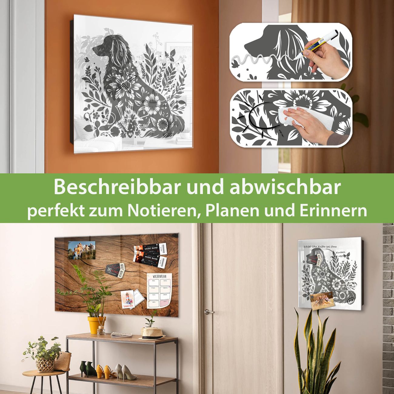 Bringe Ordnung und Eleganz in deinen Eingangsbereich mit dem banjado Schlüsselkasten Motiv Motiv Blumenhund Silhouette. Die moderne Schlüsselbox kombiniert funktionales Design mit hochwertiger Verarbeitung und wird so zu einem echten Hingucker in Flur, Büro oder Ferienwohnung. ✅ Stilvolle Schlüsselaufbewahrung mit Glasfront im Motiv Motiv Blumenhund Silhouette Der Design-Schlüsselkasten Motiv Motiv Blumenhund Silhouette bietet Platz für bis zu 50 Schlüssel, die auf 5 stabilen Reihen mit je 10 Haken übersichtlich verstaut werden. Mit seinen kompakten Maßen von 30 x 30 x 5 cm passt die Schlüsselbox perfekt auch in kleinere Räume. Der schwarz lackierte Stahlkorpus mit rechts angeschlagenem Türscharnier harmoniert mit der Glasfront und fügt sich nahtlos in jedes Wohnambiente ein. Ob als Schlüsselorganizer für Zuhause oder als praktische Lösung für Büros, Praxen und Gewerbe, der banjado Schlüsselkasten sorgt für Ordnung und Übersicht. Dank der magnetischen, mit Kreidestiften beschreibbaren Glasfront kannst du Notizen anheften oder Termine direkt auf der Oberfläche festhalten. Die Schlüsselbox Motiv Motiv Blumenhund Silhouette zur Wandmontage wird inklusive Befestigungsmaterial geliefert und ist schnell angebracht. So hast du deine Schlüssel jederzeit griffbereit und zugleich stilvoll verstaut. Mit diesem banjado Schlüsselkasten Motiv Motiv Blumenhund Silhouette kombinierst du praktische Aufbewahrung mit stilvollem Wohndesign. Ob privat oder geschäftlich, die Schlüsselbox sorgt für mehr Ordnung, Übersicht und ein wohnliches Ambiente.Vorteile im Überblick