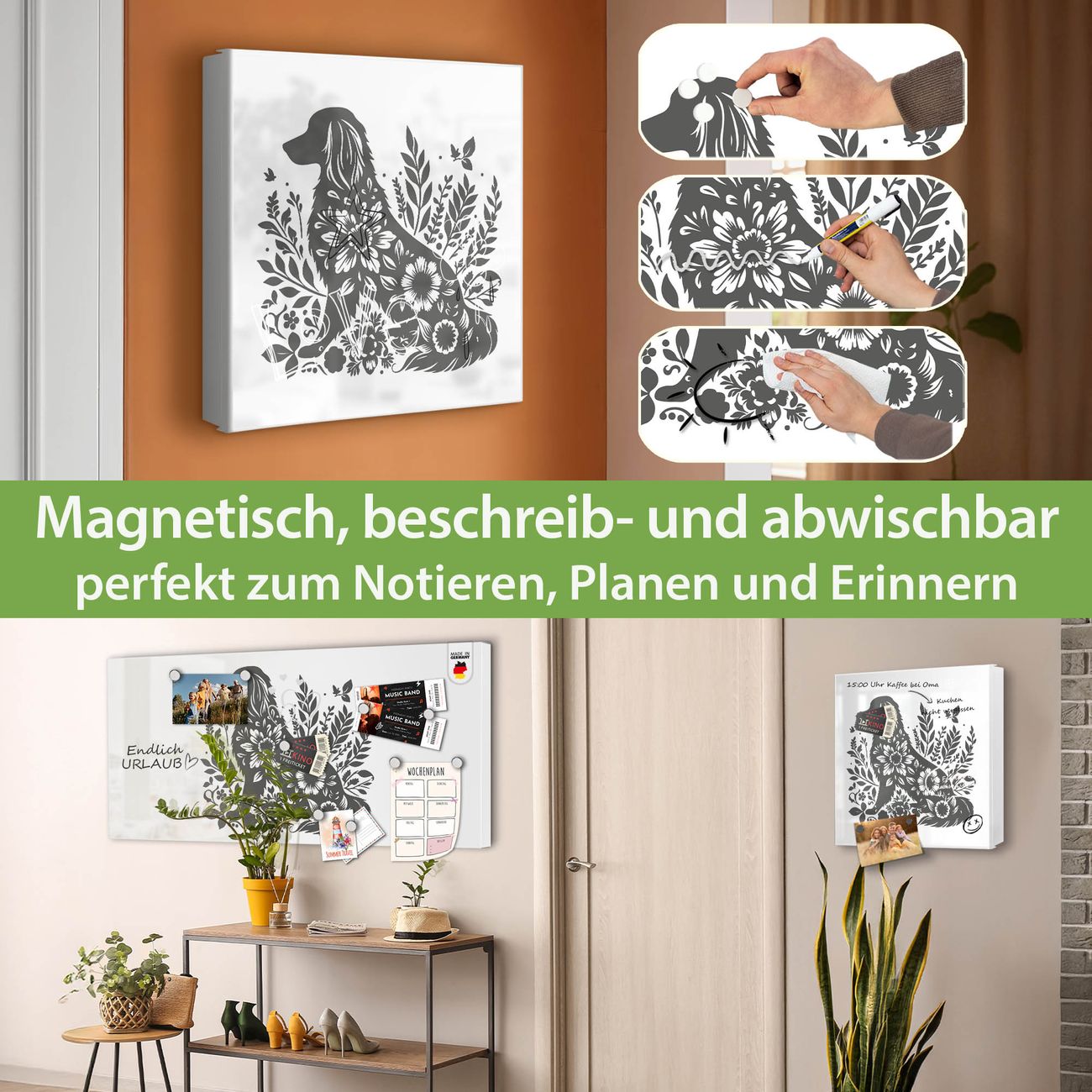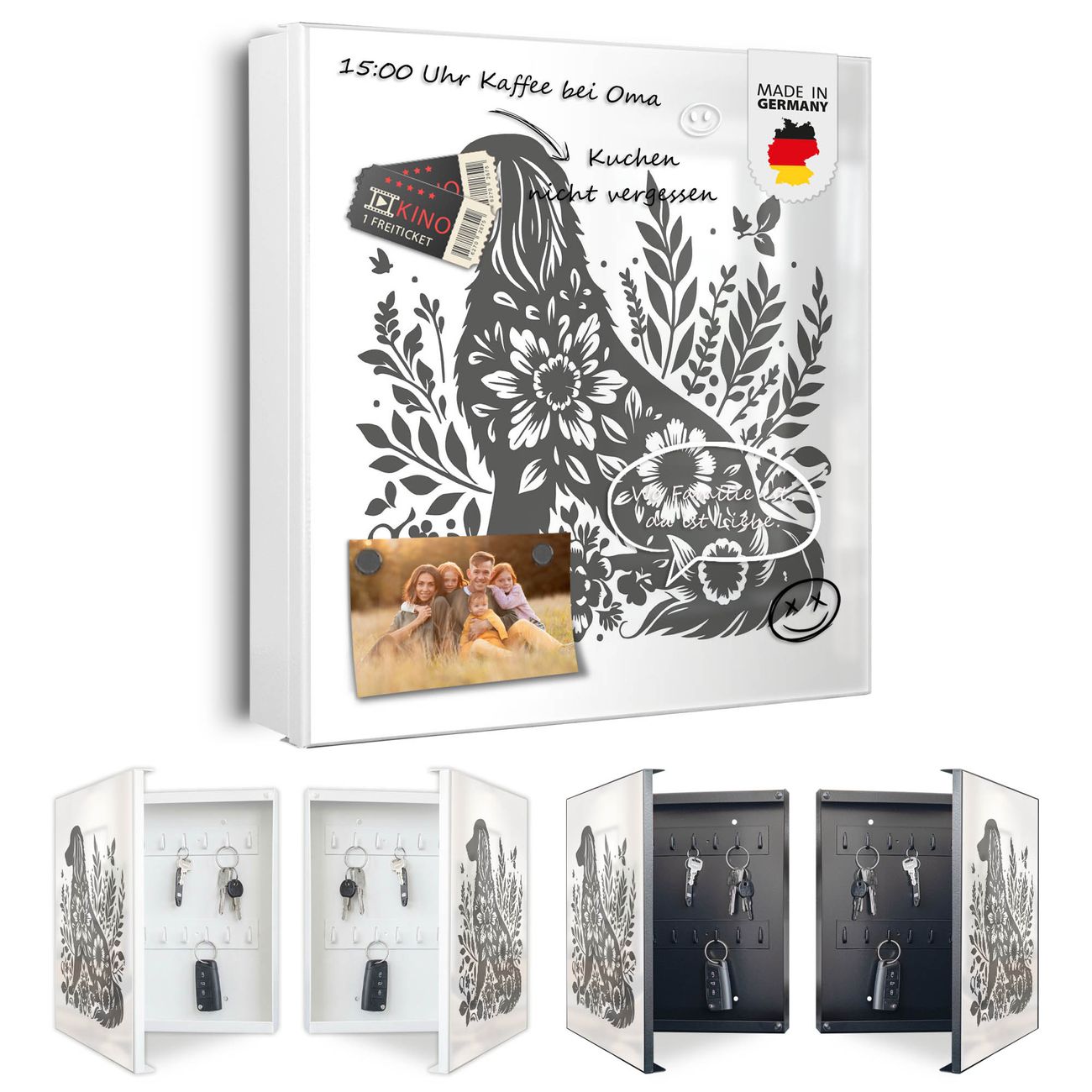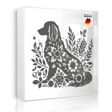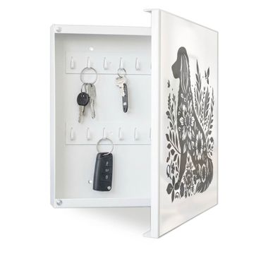 Bringe Ordnung und Eleganz in deinen Eingangsbereich mit dem banjado Schlüsselkasten Motiv Motiv Blumenhund Silhouette. Die moderne Schlüsselbox kombiniert funktionales Design mit hochwertiger Verarbeitung und wird so zu einem echten Hingucker in Flur, Büro oder Ferienwohnung. ✅ Stilvolle Schlüsselaufbewahrung mit Motiv Motiv Blumenhund Silhouette Der Design-Schlüsselkasten Motiv Motiv Blumenhund Silhouette bietet Platz für bis zu 32 Schlüssel, die auf 4 stabilen Reihen mit je 8 Haken übersichtlich verstaut werden. Mit seinen kompakten Maßen von 30 x 30 x 5 cm passt die Schlüsselbox perfekt auch in kleinere Räume. Der weiß lackierte Stahlkorpus mit rechts angeschlagenem Türscharnier harmoniert mit gedruckten Folie auf der Front und fügt sich nahtlos in jedes Wohnambiente ein. Ob als Schlüsselorganizer für Zuhause oder als praktische Lösung für Büros, Praxen und Gewerbe, der banjado Schlüsselkasten sorgt für Ordnung und Übersicht. Dank der magnetischen, mit Kreidestiften beschreibbaren Folie auf der Front kannst du Notizen anheften oder Termine direkt auf der Oberfläche festhalten. Die Schlüsselbox Motiv Motiv Blumenhund Silhouette zur Wandmontage wird inklusive Befestigungsmaterial geliefert und ist schnell angebracht. So hast du deine Schlüssel jederzeit griffbereit und zugleich stilvoll verstaut. Mit diesem banjado Schlüsselkasten Motiv Motiv Blumenhund Silhouette kombinierst du praktische Aufbewahrung mit stilvollem Wohndesign. Ob privat oder geschäftlich, die Schlüsselbox sorgt für mehr Ordnung, Übersicht und ein wohnliches Ambiente.Vorteile im Überblick