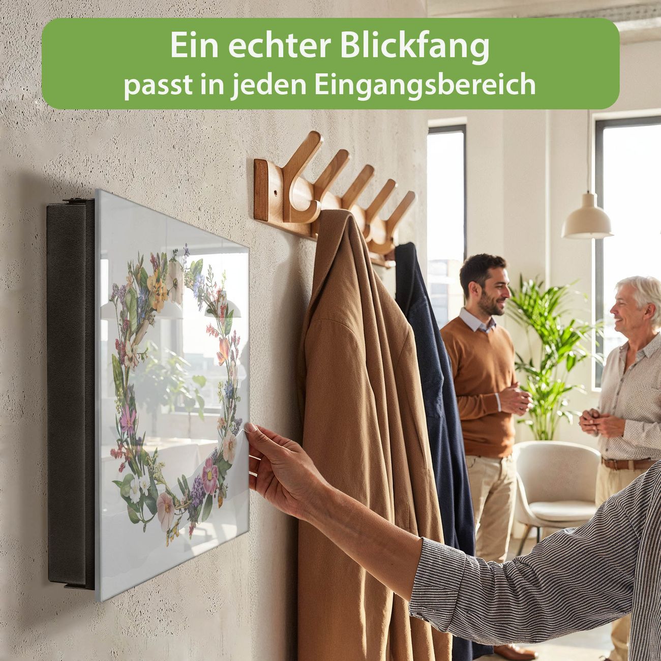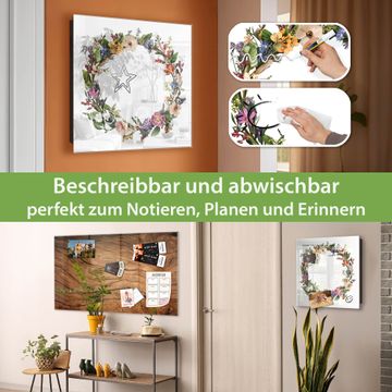 Bringe Ordnung und Eleganz in deinen Eingangsbereich mit dem banjado Schlüsselkasten Motiv Motiv Blumenkranz der Jahreszeiten. Die moderne Schlüsselbox kombiniert funktionales Design mit hochwertiger Verarbeitung und wird so zu einem echten Hingucker in Flur, Büro oder Ferienwohnung. ✅ Stilvolle Schlüsselaufbewahrung mit Glasfront im Motiv Motiv Blumenkranz der Jahreszeiten Der Design-Schlüsselkasten Motiv Motiv Blumenkranz der Jahreszeiten bietet Platz für bis zu 50 Schlüssel, die auf 5 stabilen Reihen mit je 10 Haken übersichtlich verstaut werden. Mit seinen kompakten Maßen von 30 x 30 x 5 cm passt die Schlüsselbox perfekt auch in kleinere Räume. Der schwarz lackierte Stahlkorpus mit rechts angeschlagenem Türscharnier harmoniert mit der Glasfront und fügt sich nahtlos in jedes Wohnambiente ein. Ob als Schlüsselorganizer für Zuhause oder als praktische Lösung für Büros, Praxen und Gewerbe, der banjado Schlüsselkasten sorgt für Ordnung und Übersicht. Dank der magnetischen, mit Kreidestiften beschreibbaren Glasfront kannst du Notizen anheften oder Termine direkt auf der Oberfläche festhalten. Die Schlüsselbox Motiv Motiv Blumenkranz der Jahreszeiten zur Wandmontage wird inklusive Befestigungsmaterial geliefert und ist schnell angebracht. So hast du deine Schlüssel jederzeit griffbereit und zugleich stilvoll verstaut. Mit diesem banjado Schlüsselkasten Motiv Motiv Blumenkranz der Jahreszeiten kombinierst du praktische Aufbewahrung mit stilvollem Wohndesign. Ob privat oder geschäftlich, die Schlüsselbox sorgt für mehr Ordnung, Übersicht und ein wohnliches Ambiente.Vorteile im Überblick