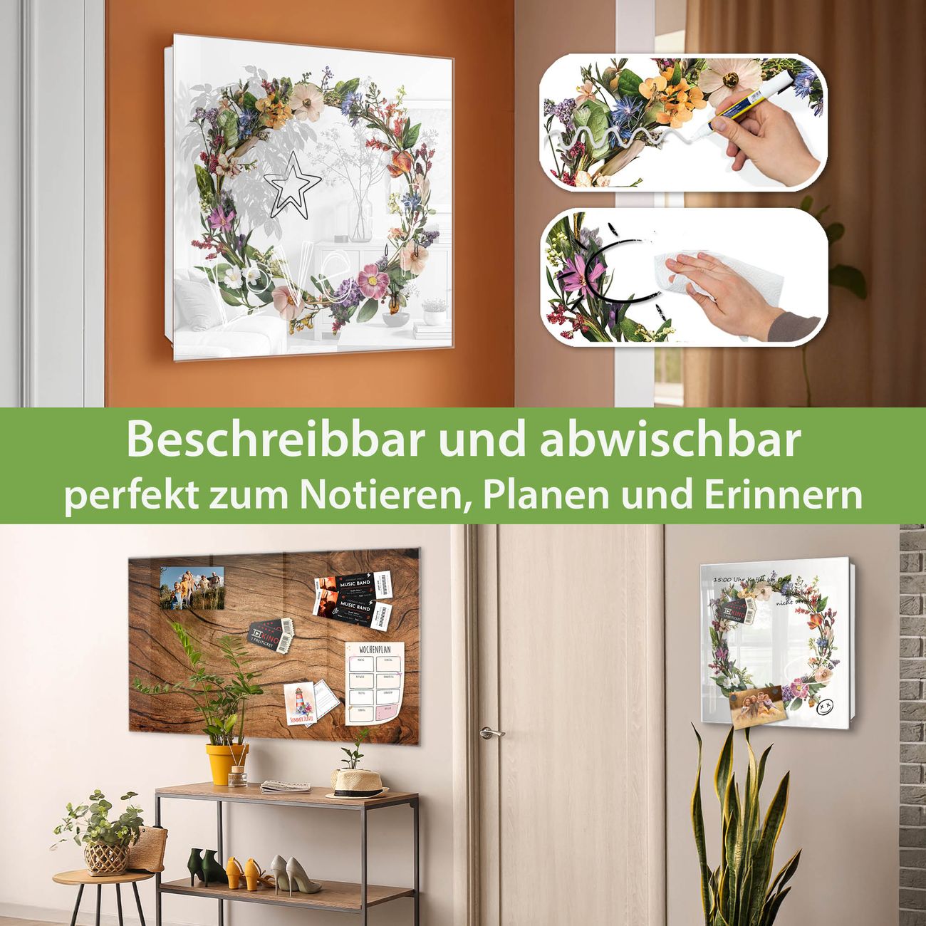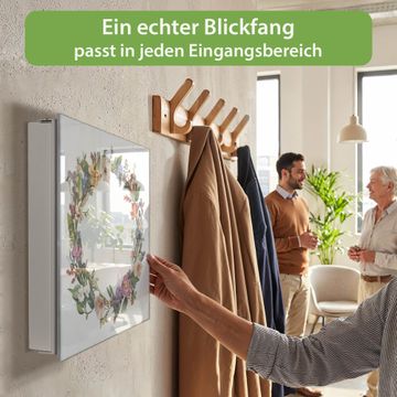 Bringe Ordnung und Eleganz in deinen Eingangsbereich mit dem banjado Schlüsselkasten Motiv Motiv Blumenkranz der Jahreszeiten. Die moderne Schlüsselbox kombiniert funktionales Design mit hochwertiger Verarbeitung und wird so zu einem echten Hingucker in Flur, Büro oder Ferienwohnung. ✅ Stilvolle Schlüsselaufbewahrung mit Glasfront im Motiv Motiv Blumenkranz der Jahreszeiten Der Design-Schlüsselkasten Motiv Motiv Blumenkranz der Jahreszeiten bietet Platz für bis zu 50 Schlüssel, die auf 5 stabilen Reihen mit je 10 Haken übersichtlich verstaut werden. Mit seinen kompakten Maßen von 30 x 30 x 5 cm passt die Schlüsselbox perfekt auch in kleinere Räume. Der weiß lackierte Stahlkorpus mit rechts angeschlagenem Türscharnier harmoniert mit der Glasfront und fügt sich nahtlos in jedes Wohnambiente ein. Ob als Schlüsselorganizer für Zuhause oder als praktische Lösung für Büros, Praxen und Gewerbe, der banjado Schlüsselkasten sorgt für Ordnung und Übersicht. Dank der magnetischen, mit Kreidestiften beschreibbaren Glasfront kannst du Notizen anheften oder Termine direkt auf der Oberfläche festhalten. Die Schlüsselbox Motiv Motiv Blumenkranz der Jahreszeiten zur Wandmontage wird inklusive Befestigungsmaterial geliefert und ist schnell angebracht. So hast du deine Schlüssel jederzeit griffbereit und zugleich stilvoll verstaut. Mit diesem banjado Schlüsselkasten Motiv Motiv Blumenkranz der Jahreszeiten kombinierst du praktische Aufbewahrung mit stilvollem Wohndesign. Ob privat oder geschäftlich, die Schlüsselbox sorgt für mehr Ordnung, Übersicht und ein wohnliches Ambiente.Vorteile im Überblick