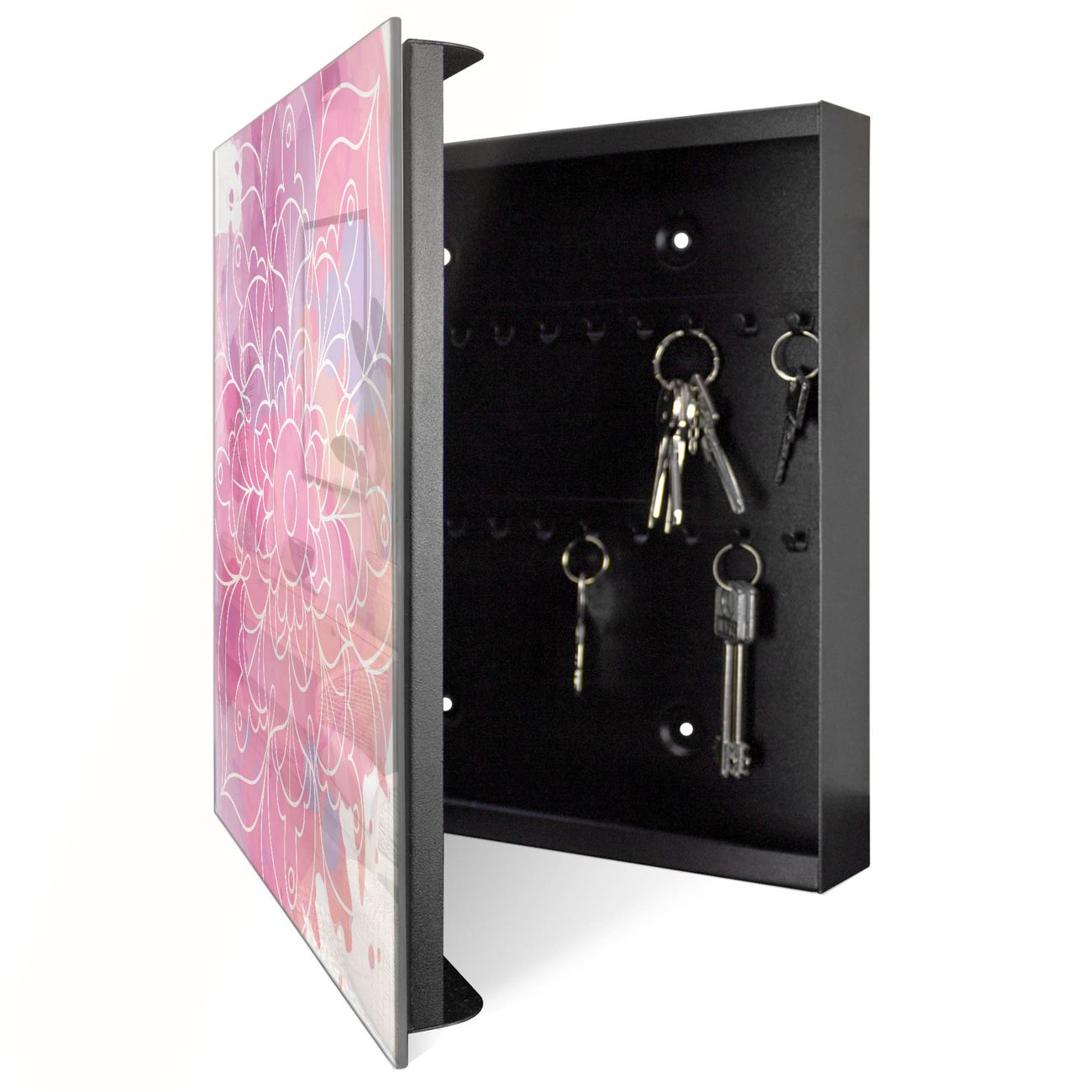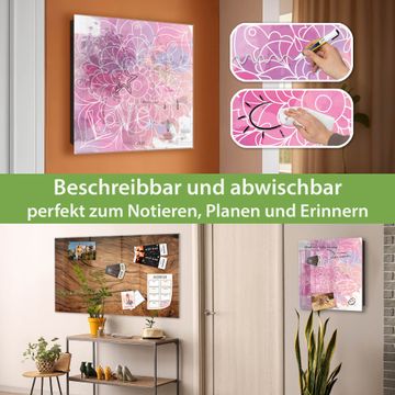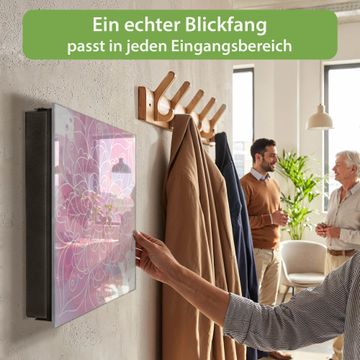 Bringe Ordnung und Eleganz in deinen Eingangsbereich mit dem banjado Schlüsselkasten Motiv Motiv Blumenmandala. Die moderne Schlüsselbox kombiniert funktionales Design mit hochwertiger Verarbeitung und wird so zu einem echten Hingucker in Flur, Büro oder Ferienwohnung. ✅ Stilvolle Schlüsselaufbewahrung mit Glasfront im Motiv Motiv Blumenmandala Der Design-Schlüsselkasten Motiv Motiv Blumenmandala bietet Platz für bis zu 50 Schlüssel, die auf 5 stabilen Reihen mit je 10 Haken übersichtlich verstaut werden. Mit seinen kompakten Maßen von 30 x 30 x 5 cm passt die Schlüsselbox perfekt auch in kleinere Räume. Der schwarz lackierte Stahlkorpus mit rechts angeschlagenem Türscharnier harmoniert mit der Glasfront und fügt sich nahtlos in jedes Wohnambiente ein. Ob als Schlüsselorganizer für Zuhause oder als praktische Lösung für Büros, Praxen und Gewerbe, der banjado Schlüsselkasten sorgt für Ordnung und Übersicht. Dank der magnetischen, mit Kreidestiften beschreibbaren Glasfront kannst du Notizen anheften oder Termine direkt auf der Oberfläche festhalten. Die Schlüsselbox Motiv Motiv Blumenmandala zur Wandmontage wird inklusive Befestigungsmaterial geliefert und ist schnell angebracht. So hast du deine Schlüssel jederzeit griffbereit und zugleich stilvoll verstaut. Mit diesem banjado Schlüsselkasten Motiv Motiv Blumenmandala kombinierst du praktische Aufbewahrung mit stilvollem Wohndesign. Ob privat oder geschäftlich, die Schlüsselbox sorgt für mehr Ordnung, Übersicht und ein wohnliches Ambiente.Vorteile im Überblick