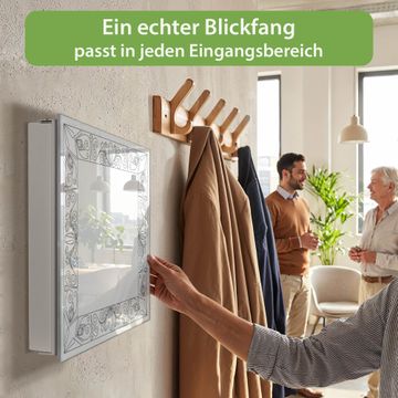 Bringe Ordnung und Eleganz in deinen Eingangsbereich mit dem banjado Schlüsselkasten Motiv Motiv Blumenornament-Rahmen. Die moderne Schlüsselbox kombiniert funktionales Design mit hochwertiger Verarbeitung und wird so zu einem echten Hingucker in Flur, Büro oder Ferienwohnung. ✅ Stilvolle Schlüsselaufbewahrung mit Glasfront im Motiv Motiv Blumenornament-Rahmen Der Design-Schlüsselkasten Motiv Motiv Blumenornament-Rahmen bietet Platz für bis zu 50 Schlüssel, die auf 5 stabilen Reihen mit je 10 Haken übersichtlich verstaut werden. Mit seinen kompakten Maßen von 30 x 30 x 5 cm passt die Schlüsselbox perfekt auch in kleinere Räume. Der weiß lackierte Stahlkorpus mit rechts angeschlagenem Türscharnier harmoniert mit der Glasfront und fügt sich nahtlos in jedes Wohnambiente ein. Ob als Schlüsselorganizer für Zuhause oder als praktische Lösung für Büros, Praxen und Gewerbe, der banjado Schlüsselkasten sorgt für Ordnung und Übersicht. Dank der magnetischen, mit Kreidestiften beschreibbaren Glasfront kannst du Notizen anheften oder Termine direkt auf der Oberfläche festhalten. Die Schlüsselbox Motiv Motiv Blumenornament-Rahmen zur Wandmontage wird inklusive Befestigungsmaterial geliefert und ist schnell angebracht. So hast du deine Schlüssel jederzeit griffbereit und zugleich stilvoll verstaut. Mit diesem banjado Schlüsselkasten Motiv Motiv Blumenornament-Rahmen kombinierst du praktische Aufbewahrung mit stilvollem Wohndesign. Ob privat oder geschäftlich, die Schlüsselbox sorgt für mehr Ordnung, Übersicht und ein wohnliches Ambiente.Vorteile im Überblick